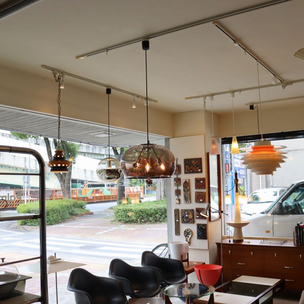 スモークシェードはプラスチック製。シェードの内側からソケットと球体のパーツが広がる様に飛び出たつくり。異なった素材の艶感が面白いですね。見方によってはクラゲのような神秘的なイメージも持てます。