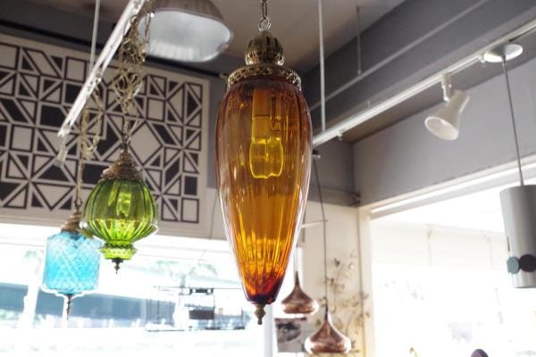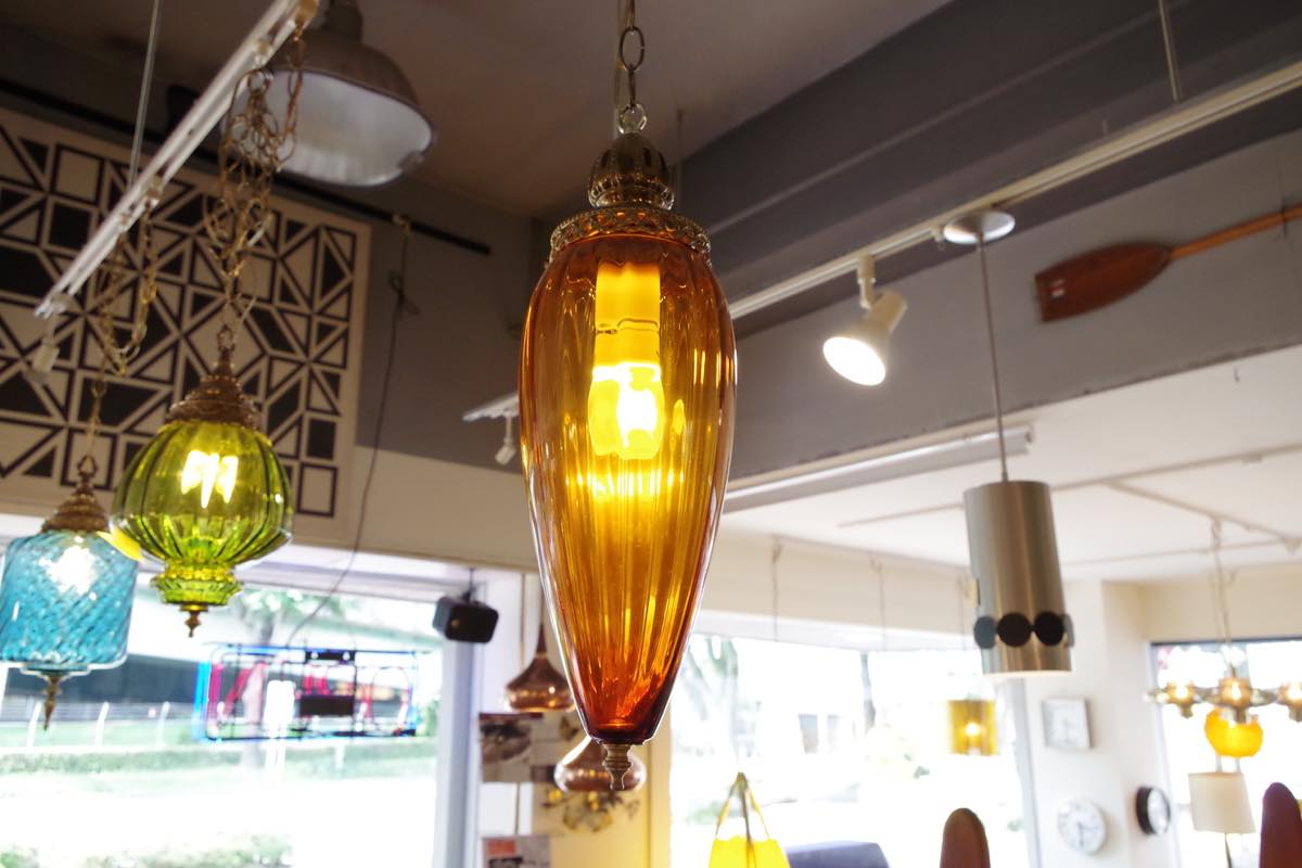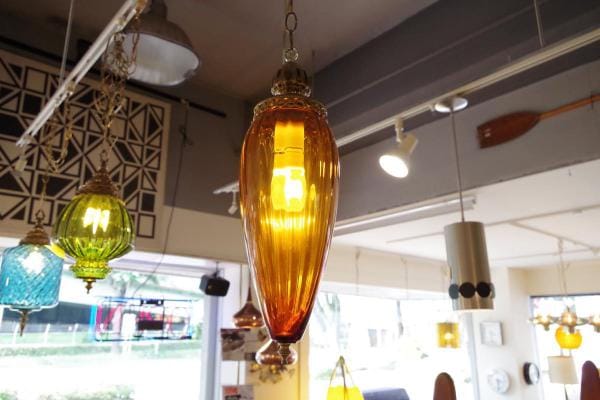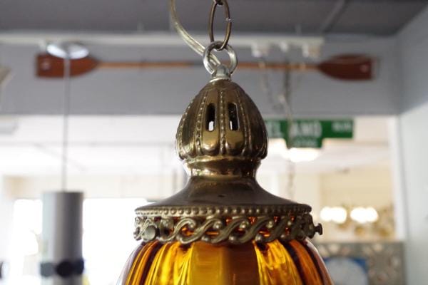 アンバーガラスペンダントランプ。濃いオレンジ色のガラスシェードが美しいペンダントランプ。