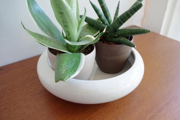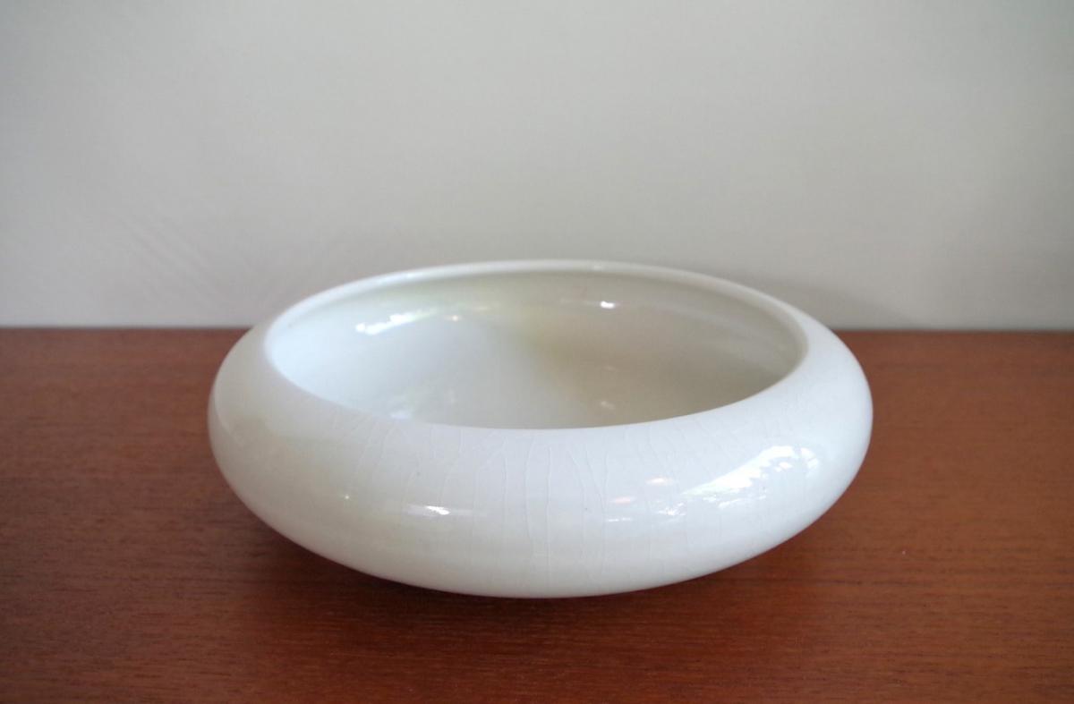 貫入が入ることで白一色でも単調にならず、趣があります。写真のように小さな鉢を入れ込んでもよいですし、水鉢にしたり観賞用としても魅力的。