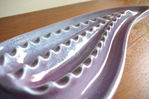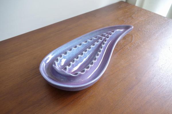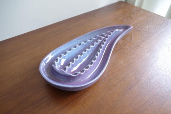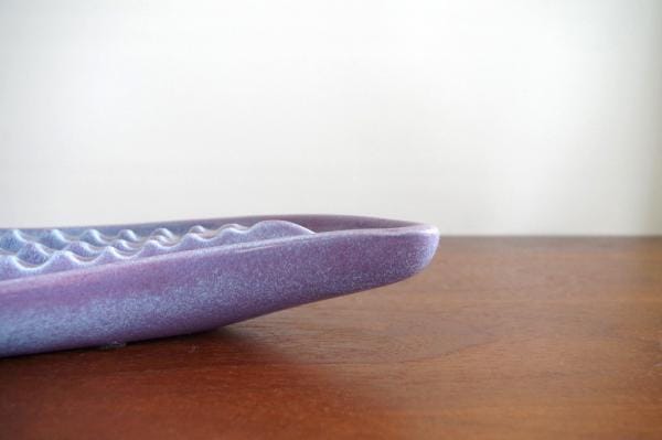 ティアドロップ形の本体と、同型のパイプ置きの波々が印象的。ライトパープルとライトブルーのグラデーション彩色も華やかです。
