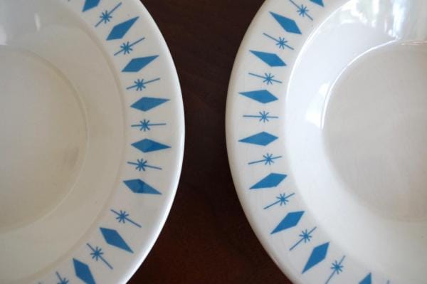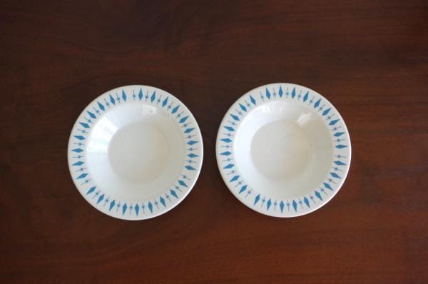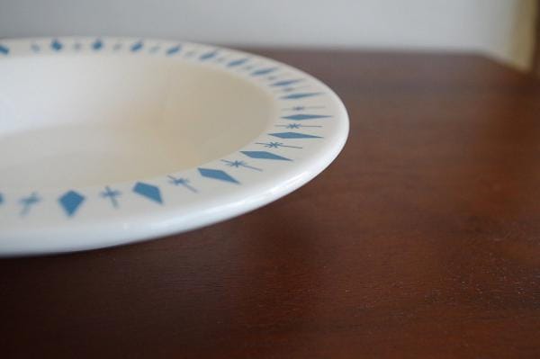白地に鮮やかなブルーの模様がとても爽やか。ダイアモンドとスターバースト模様が交互に描かれ、シンプルですがミッドセンチュリーらしいかわいさがしっかりと出ています。