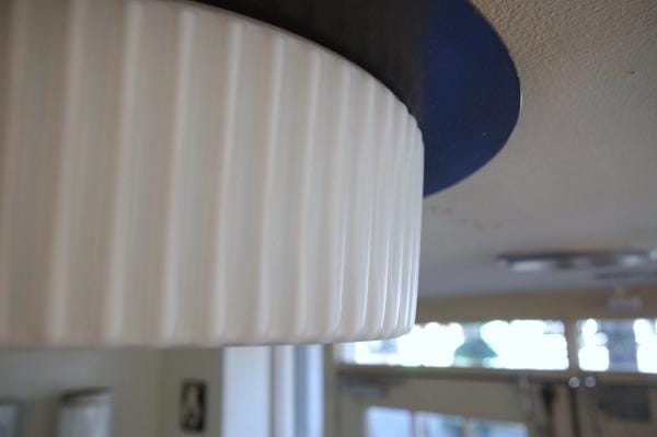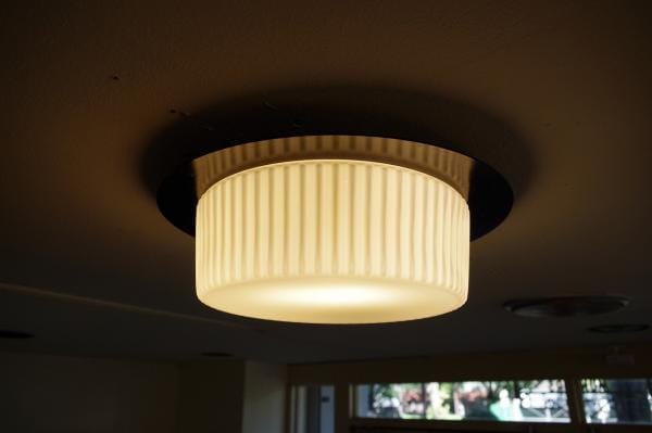円筒型のガラスシェードは側面にリブが入っていて、陰影によってより立体的にみえます。点灯すると縦筋の模様のようになるのも面白いですね。
