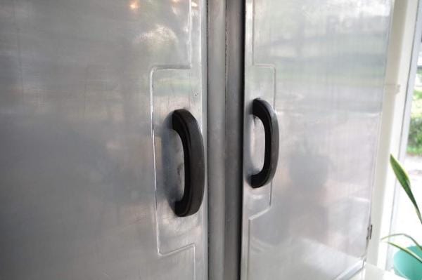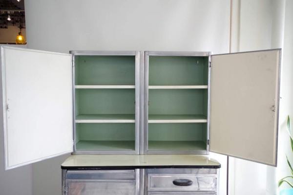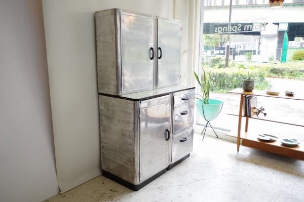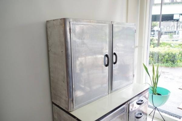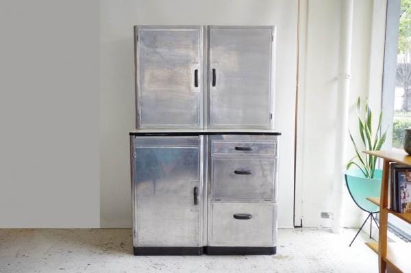 シルバーカラーがどこかレトロでスペーシーなこちらのキャビネット。アルミの鈍い艶や質感が存在感を放っています。