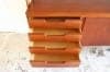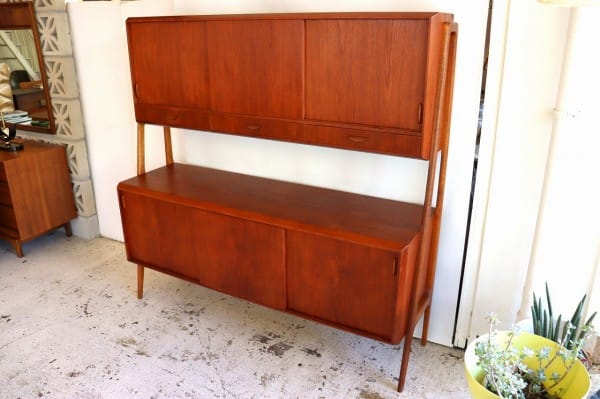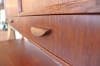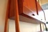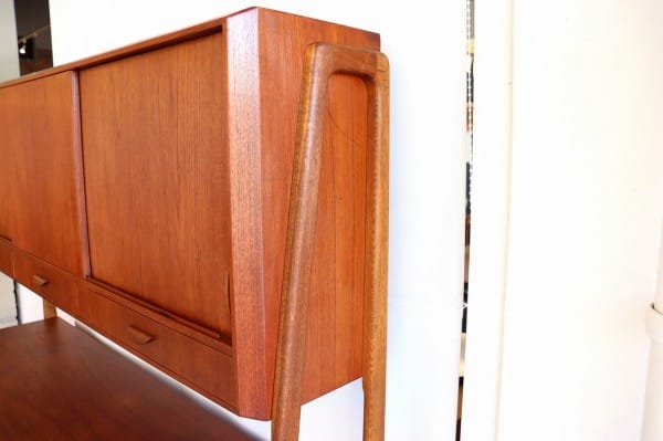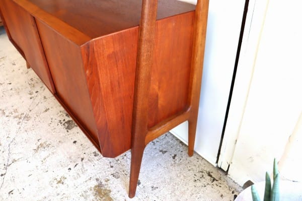 下部のサイドボードと上部のキャビネットをつなぐのは、無垢のチーク材から作りだされた脚も兼ねた支柱。角のとれた丸みがある柔らかな脚も北欧ビンテージらしさを感じます。