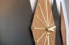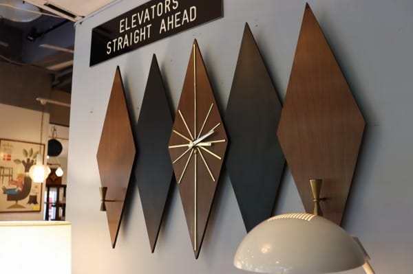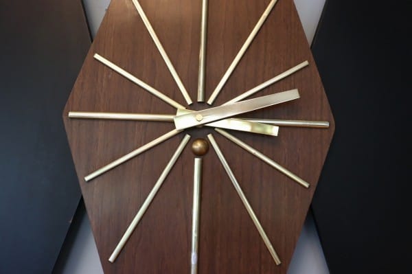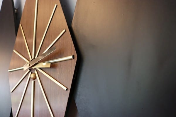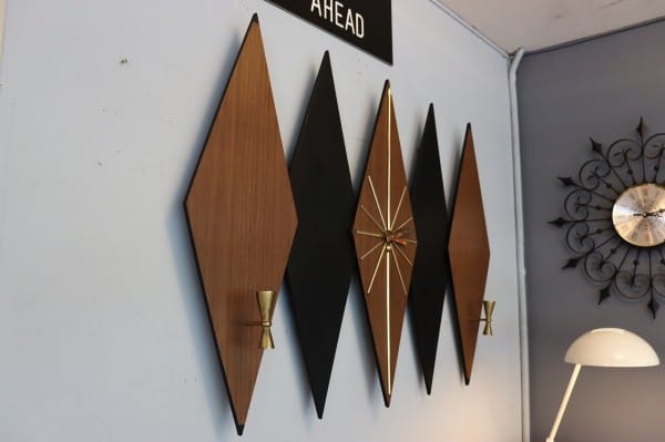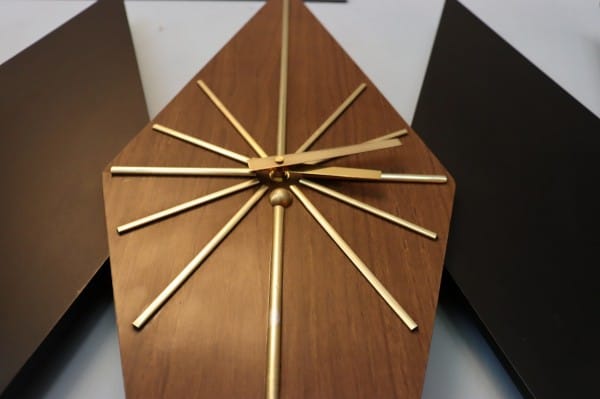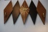 こちらはひし形が5つ連なったアメリカンモダンらしいデザインの時計です。ブラックと木目のダイヤが交互に重ねて付けられていて、中心のダイヤは時計として、左右端のダイヤにはキャンドルホルダーが付いています。