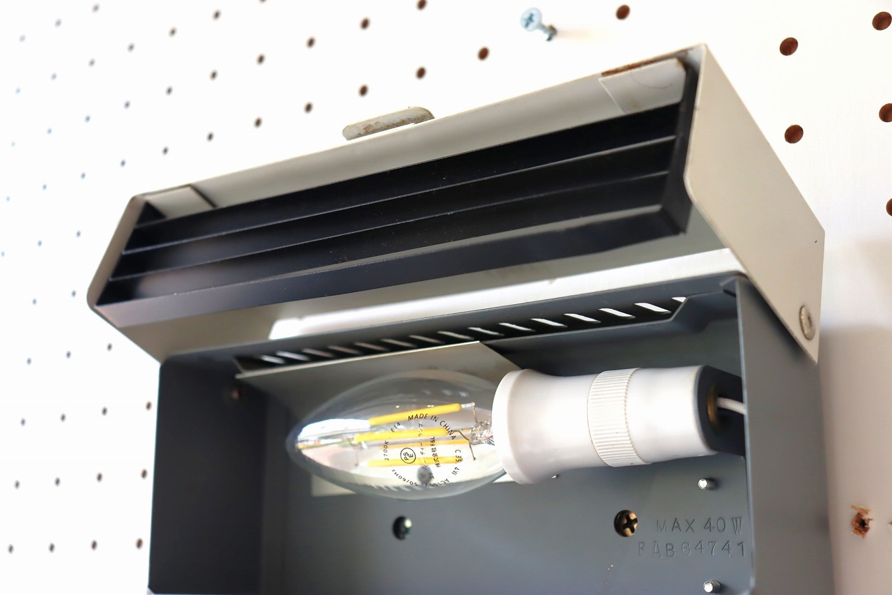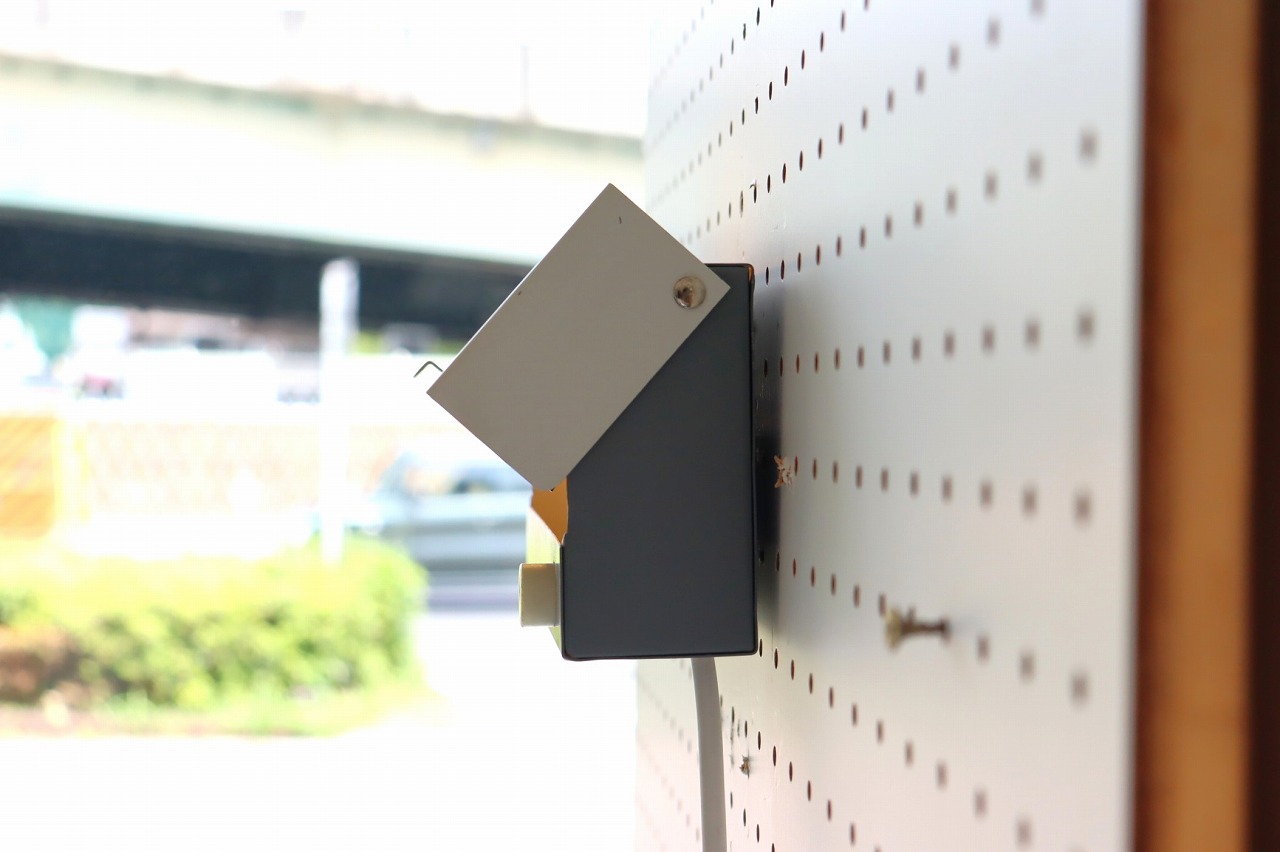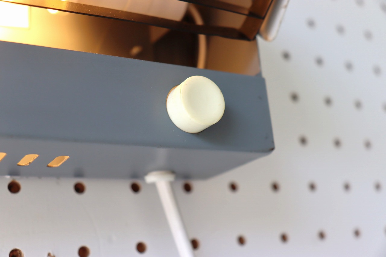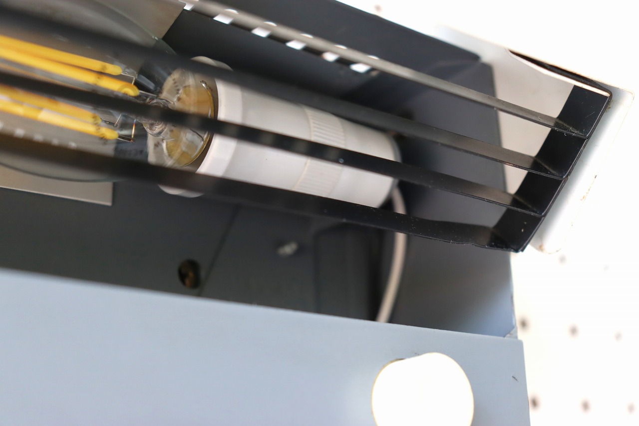 シェードは内部がガラリのようになっており、光が電球からの間接的に柔らかい反射光が届きます。スイッチはレトロさを感じるの押し心地。