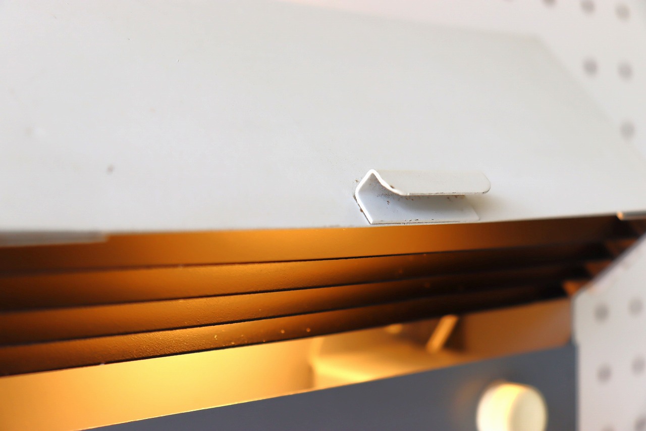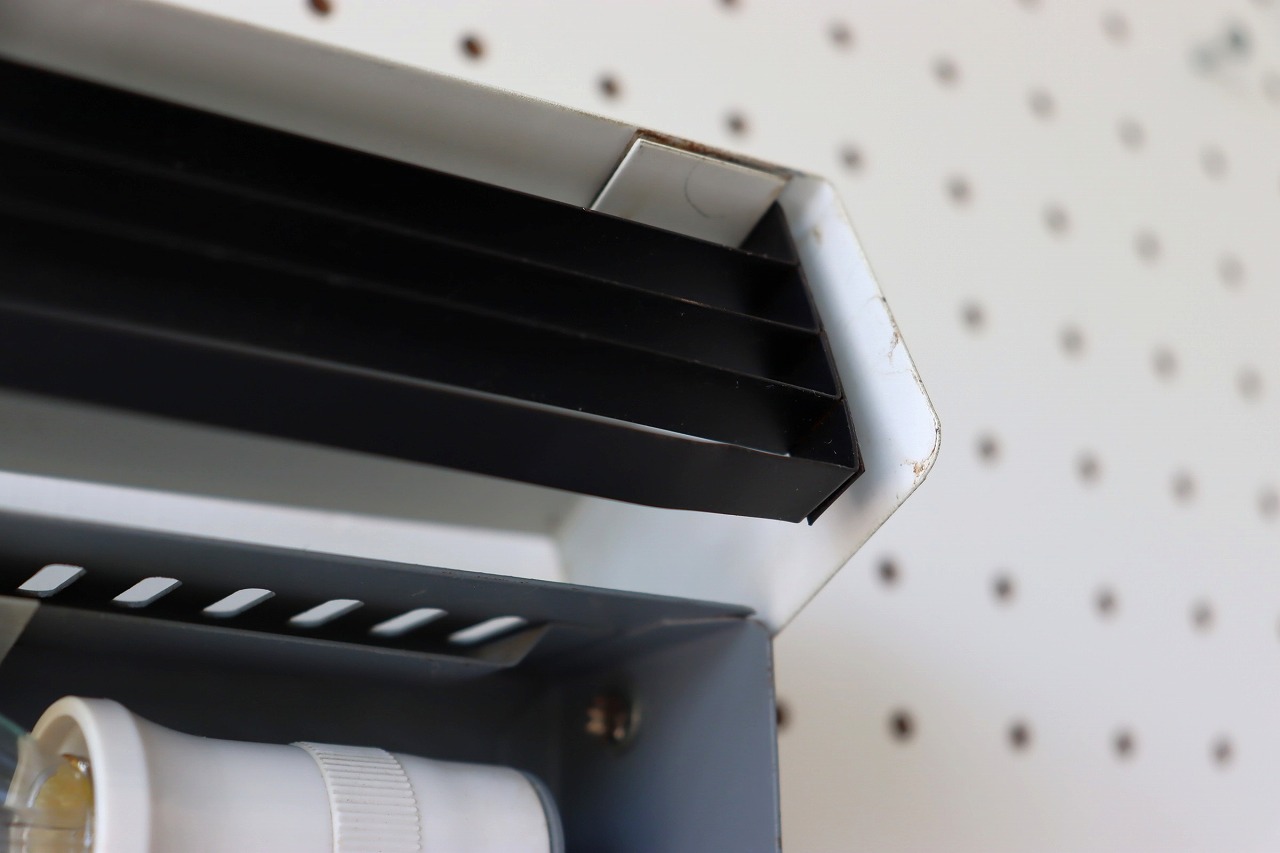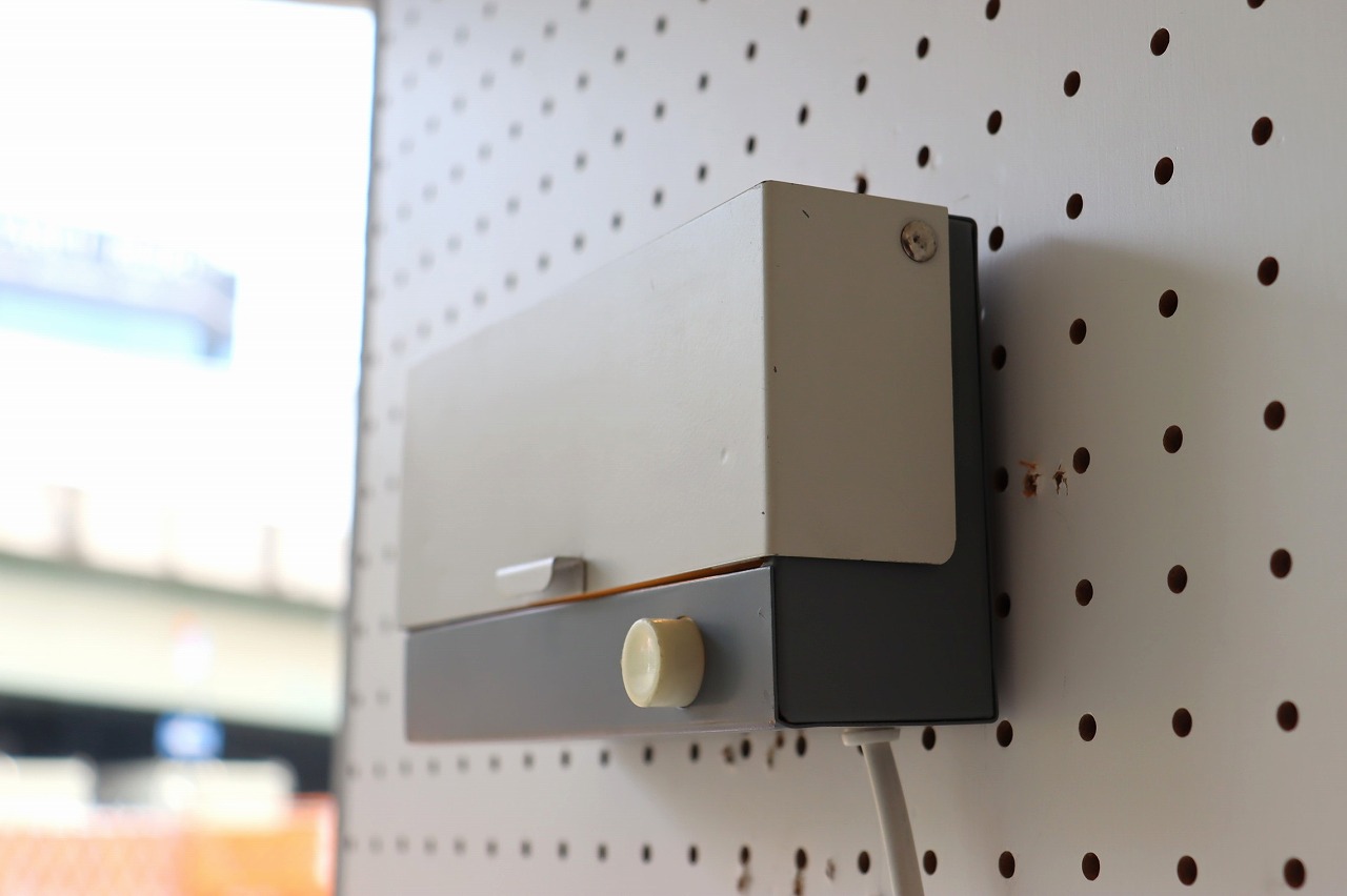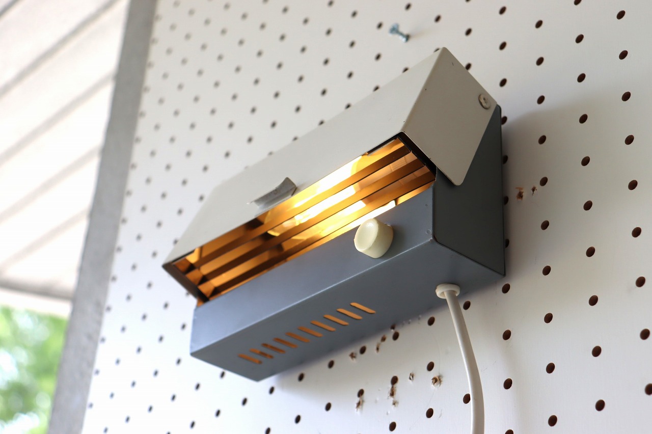 シェードは内部がガラリのようになっており、光が電球からの間接的に柔らかい反射光が届きます。スイッチはレトロさを感じるの押し心地。