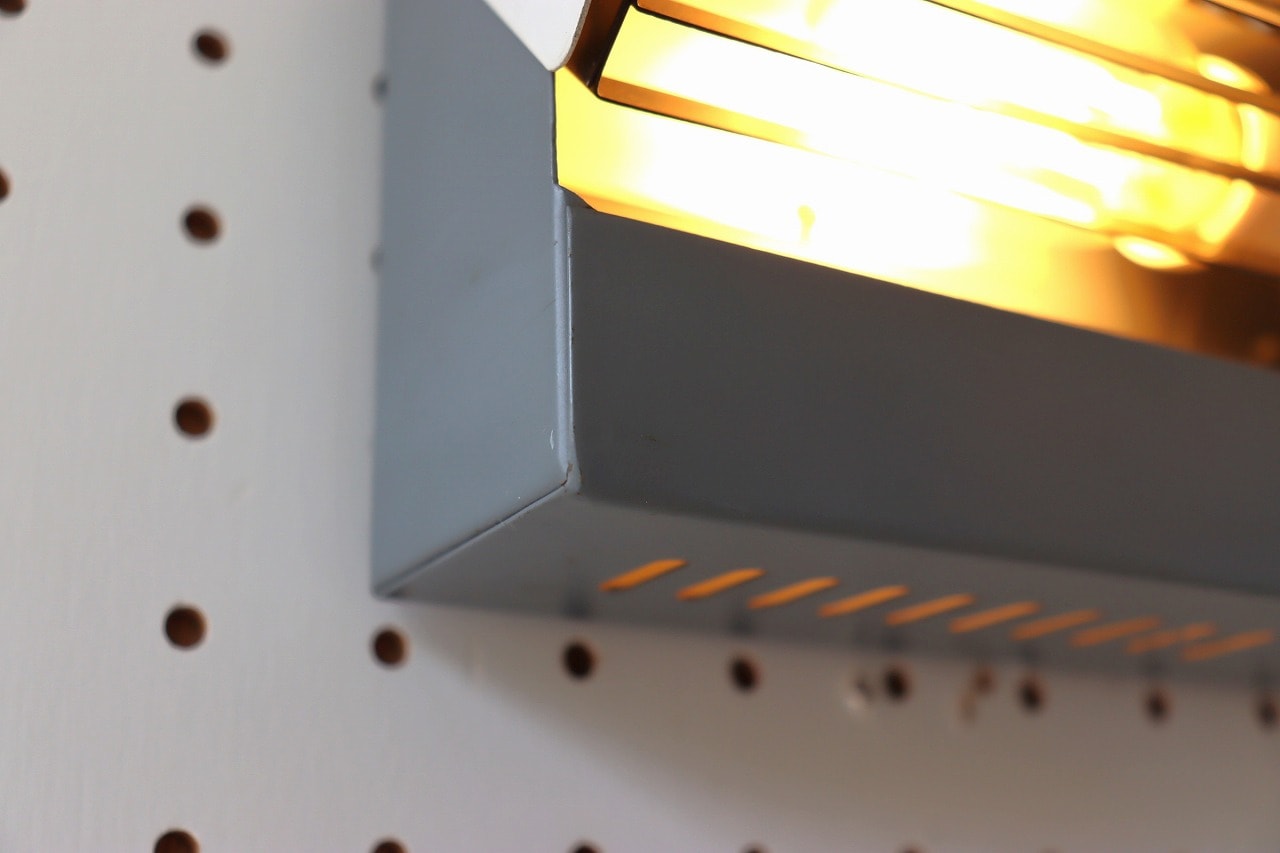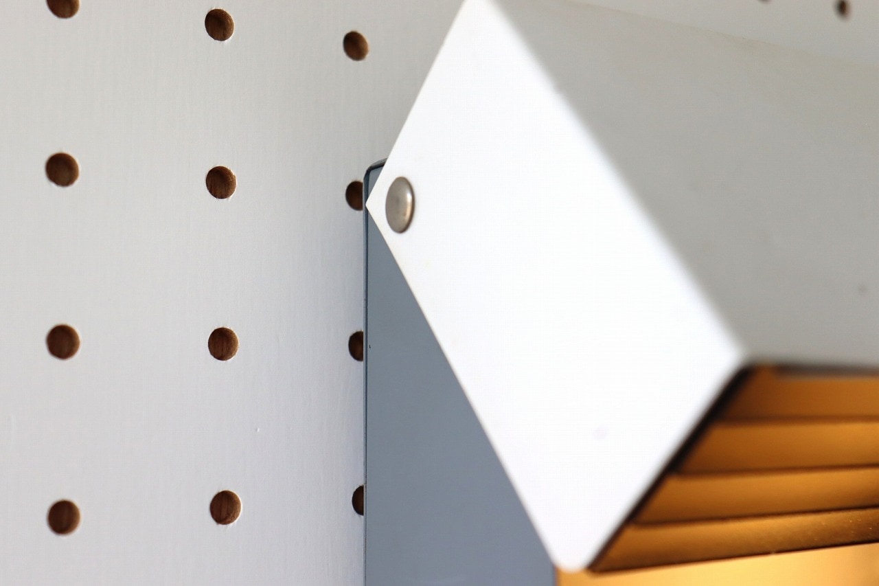 スチールの四角い箱型のランプ。シンプルなフォルムはデザイン性が高く、ツートーンのグレーが北欧らしい上品さのある佇まいです。上部と下部にはパンチングが入っています。