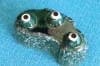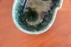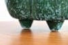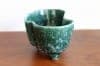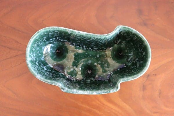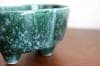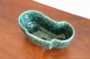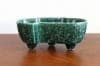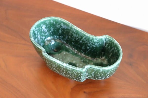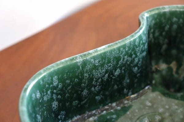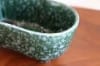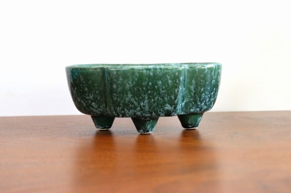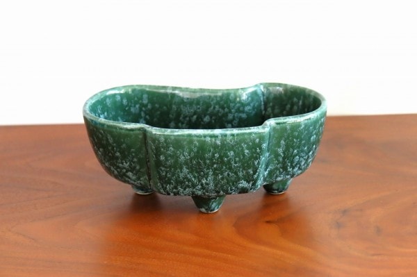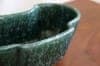 深い緑色と艶やかな質感の陶器製。プランターは丸みを帯びた細長い形で、一方の側面は真ん中が前に出たデザイン、もう一方の側面は波のようなデザインになっています。