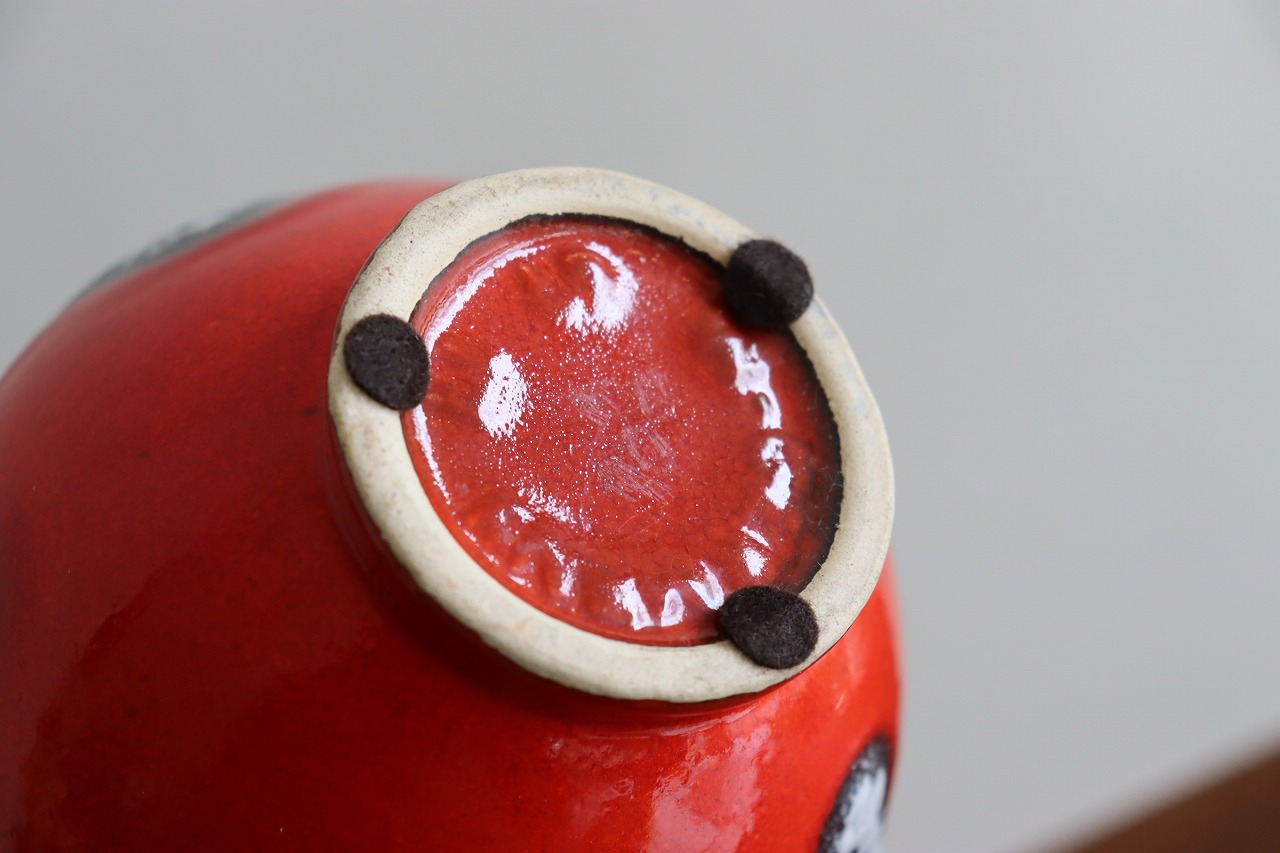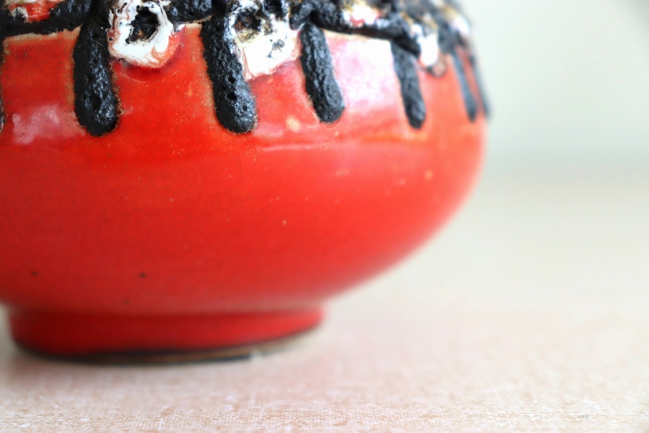 強めの真っ赤な色が印象的。艶のある質感で発色がよく、華やかで美しい花瓶です。側面に施された釉薬とのコントラストも綺麗ですね。ハンドメイドで作られた個性も感じられますね。