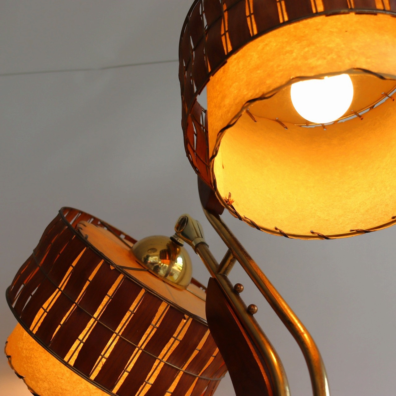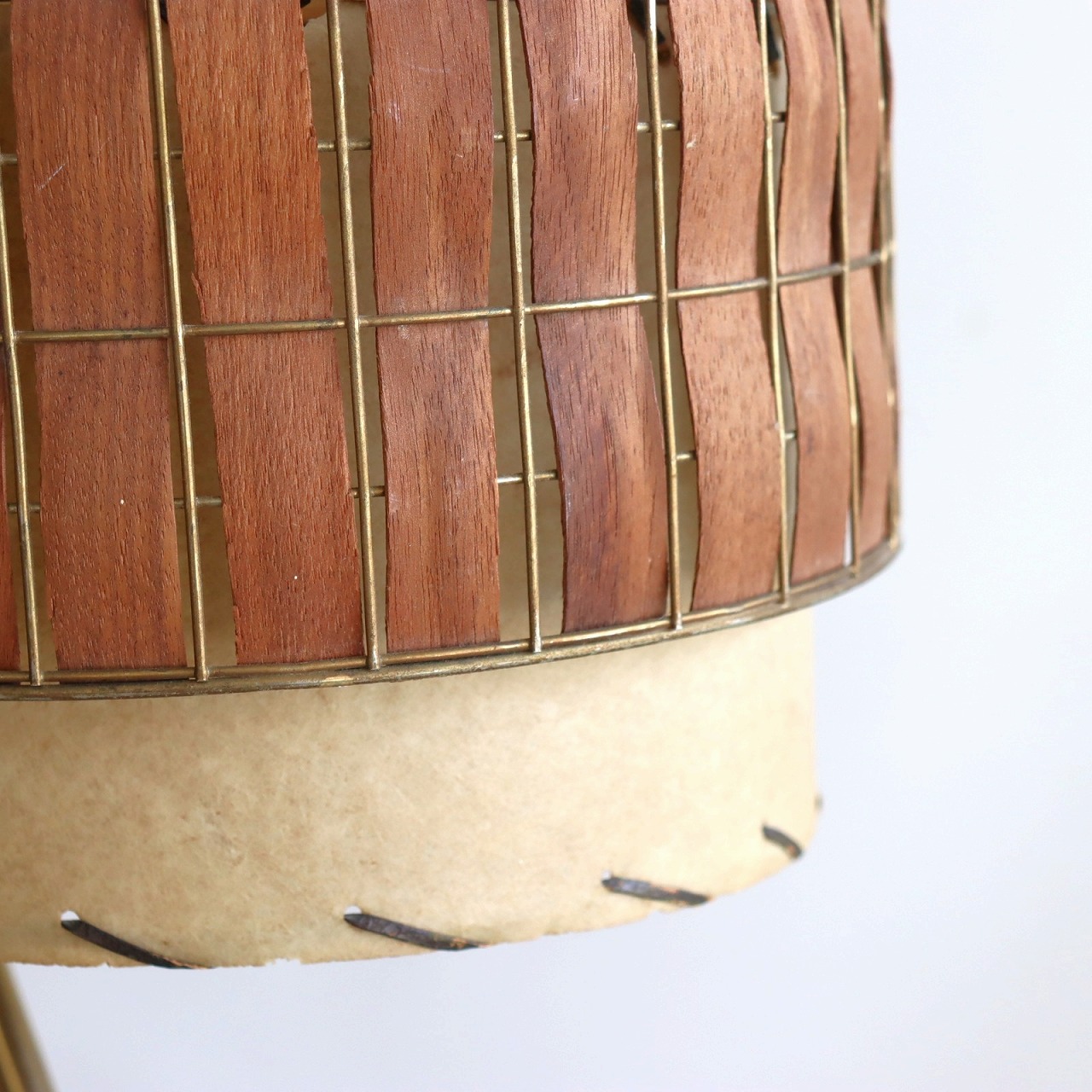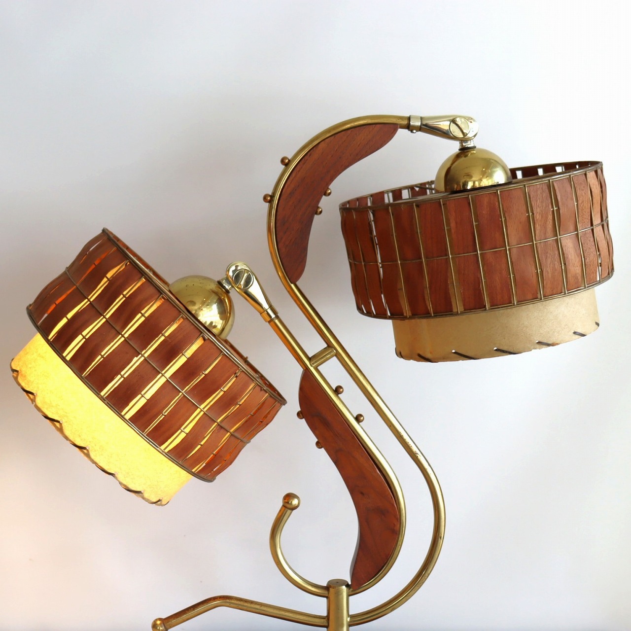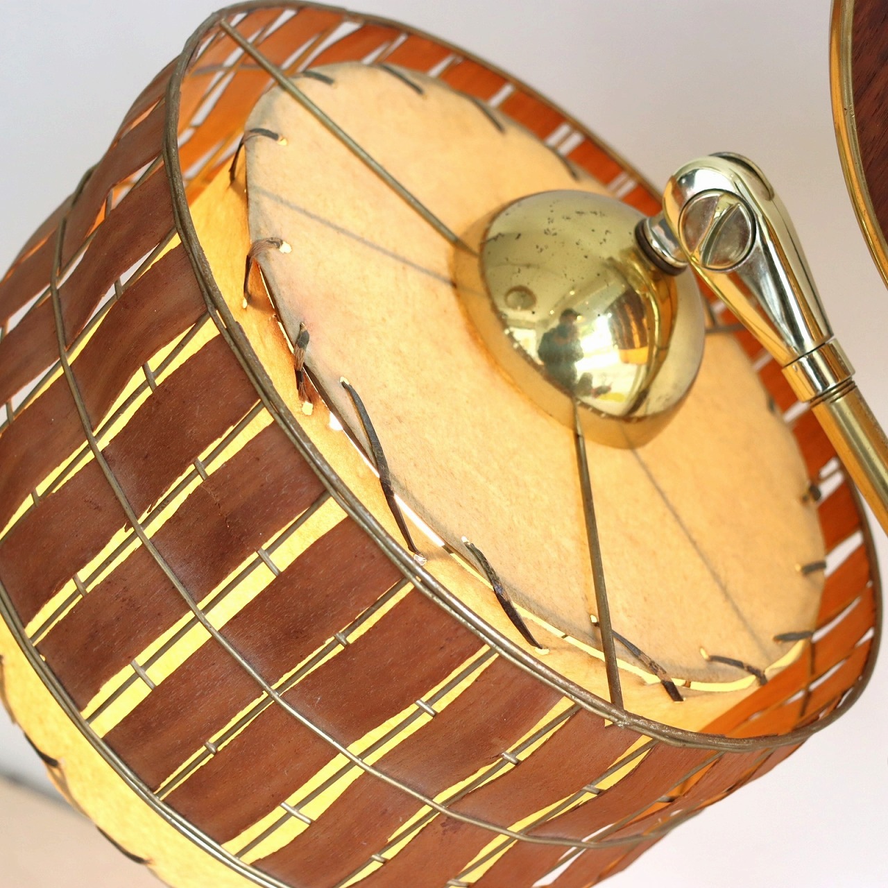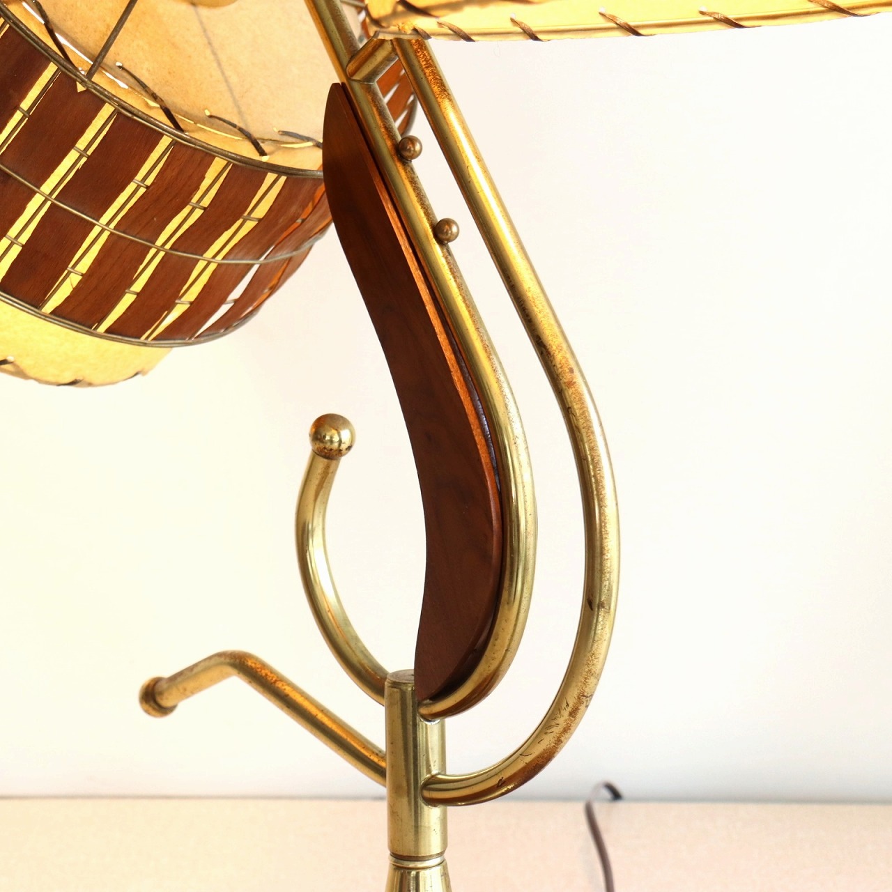 シェードはダブルシェード。FRPのベージュのシェードにウッドパーツを施したシェードが重ねられています。シェードとの接合部にはゴールドの球体の飾りがつけられており、50-60年代の特徴がアクセントとして目を引きます。
