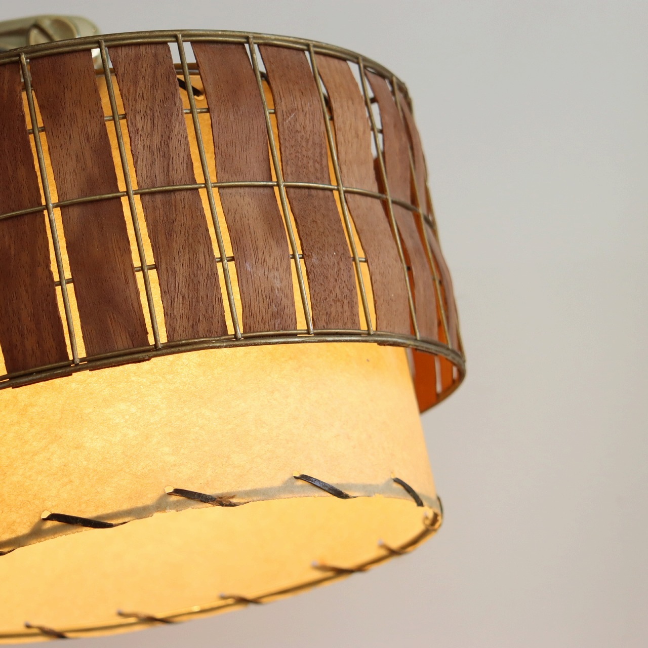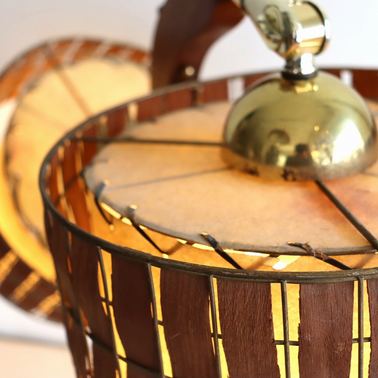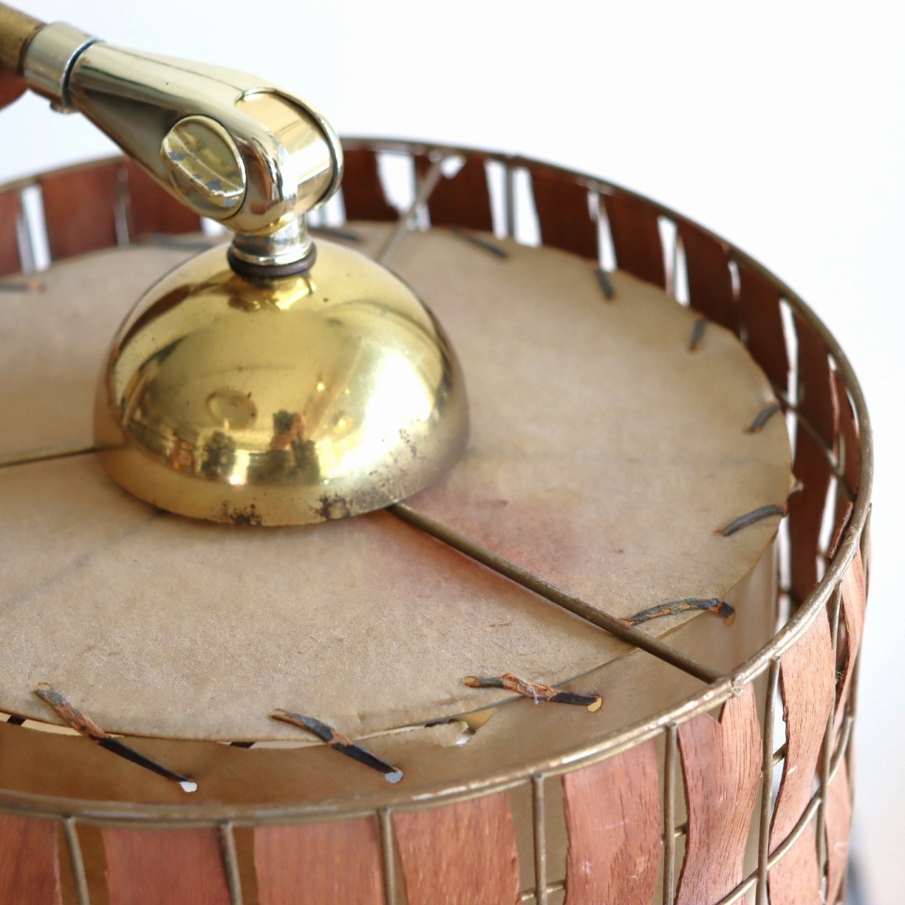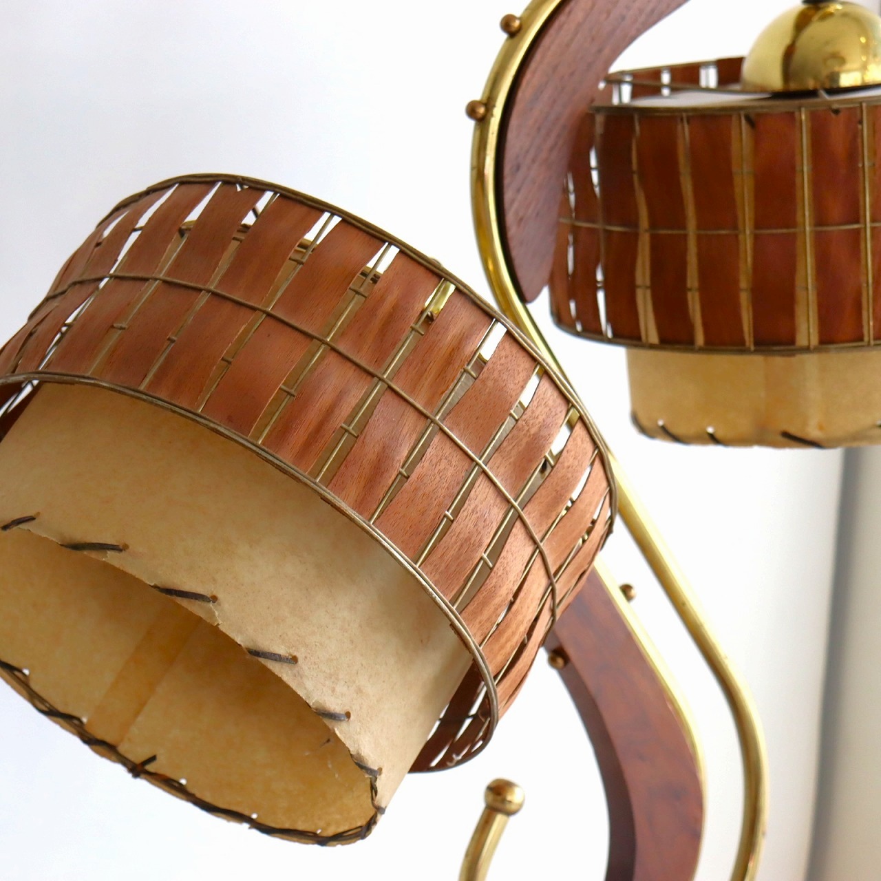 シェードはダブルシェード。FRPのベージュのシェードにウッドパーツを施したシェードが重ねられています。シェードとの接合部にはゴールドの球体の飾りがつけられており、50-60年代の特徴がアクセントとして目を引きます。