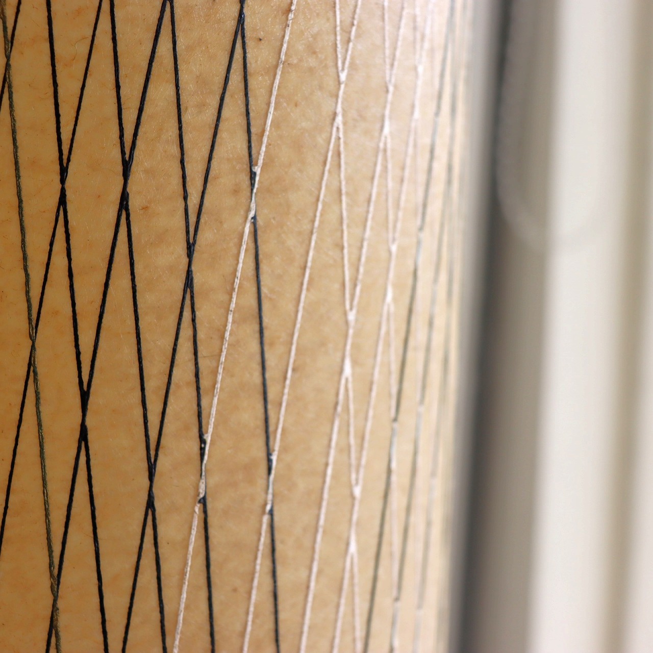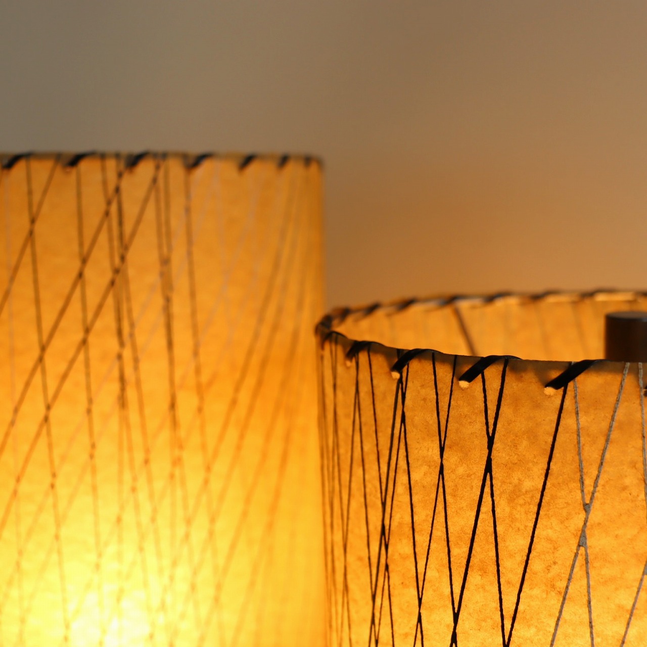 円柱形のベージュのFRP製のシェードにはブラックとホワイトで網目模様が描かれています。どちらか一色だけで描くよりも奥行きが感じられて、ぐっと表情豊かになっています。