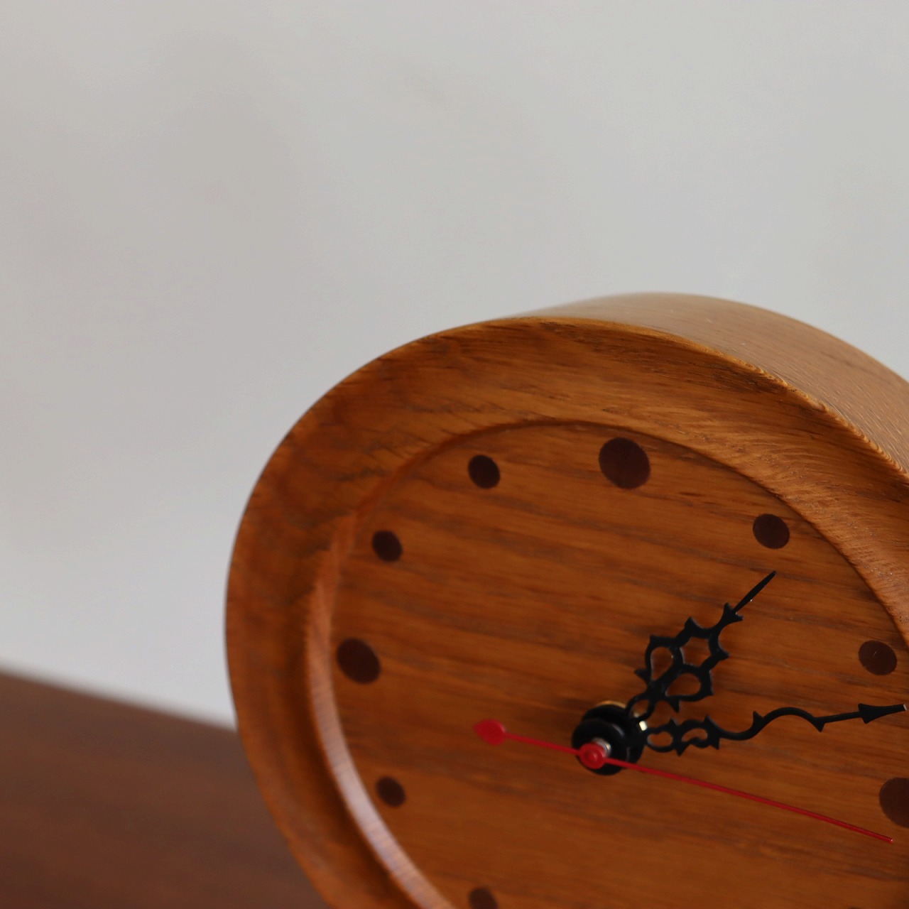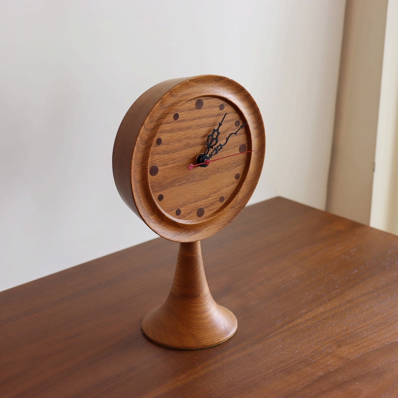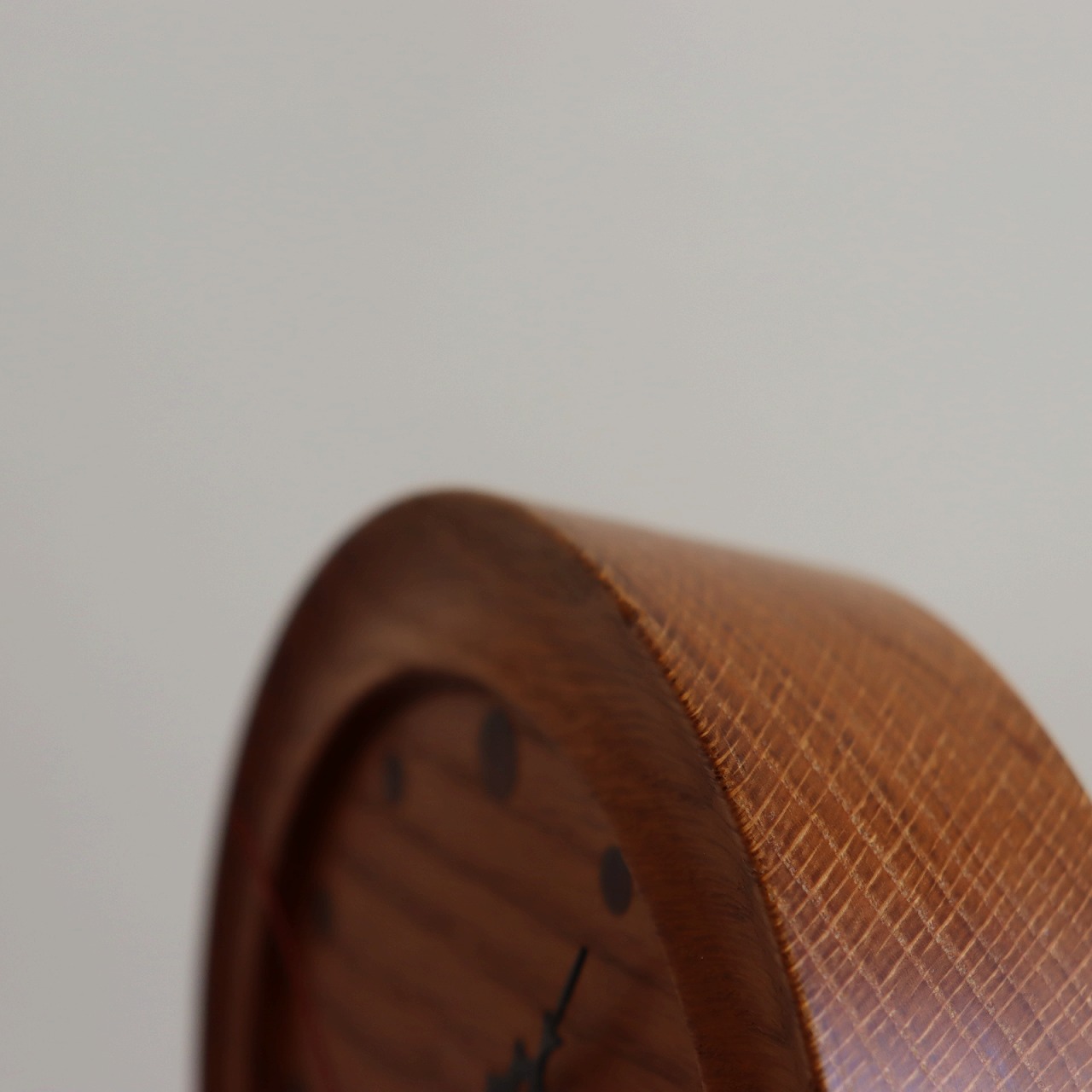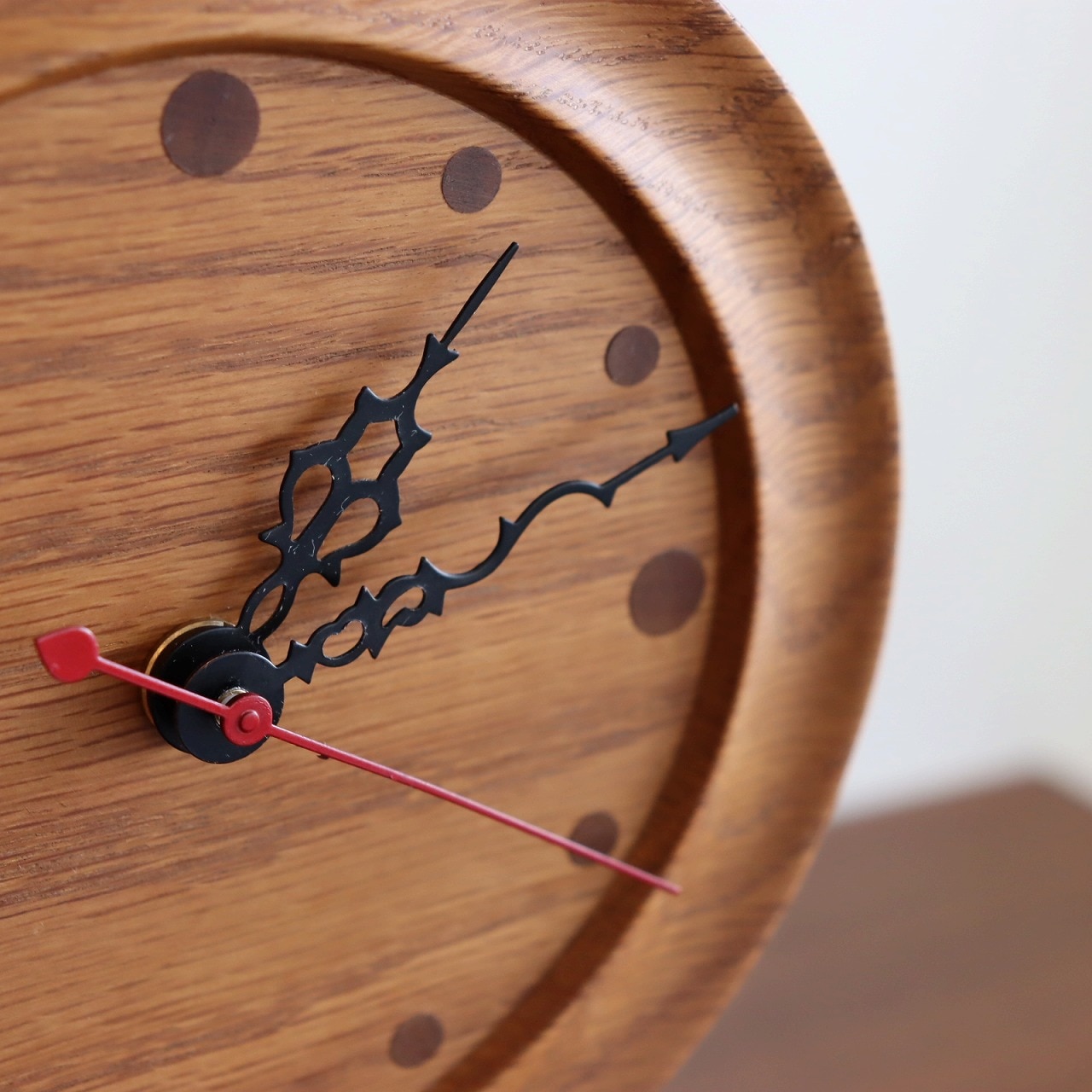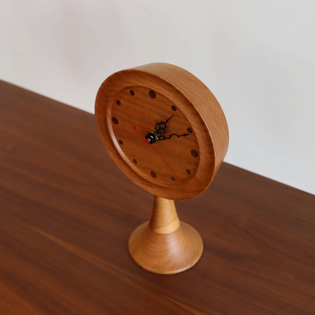 フォルムに可愛らしさが溢れたこちら。しっかりと厚みのあるオーク材の丸い文字盤に、裾野のように広がったベースが支えています。接地面へのラインが滑らかで、しっかりとした安定感があります。