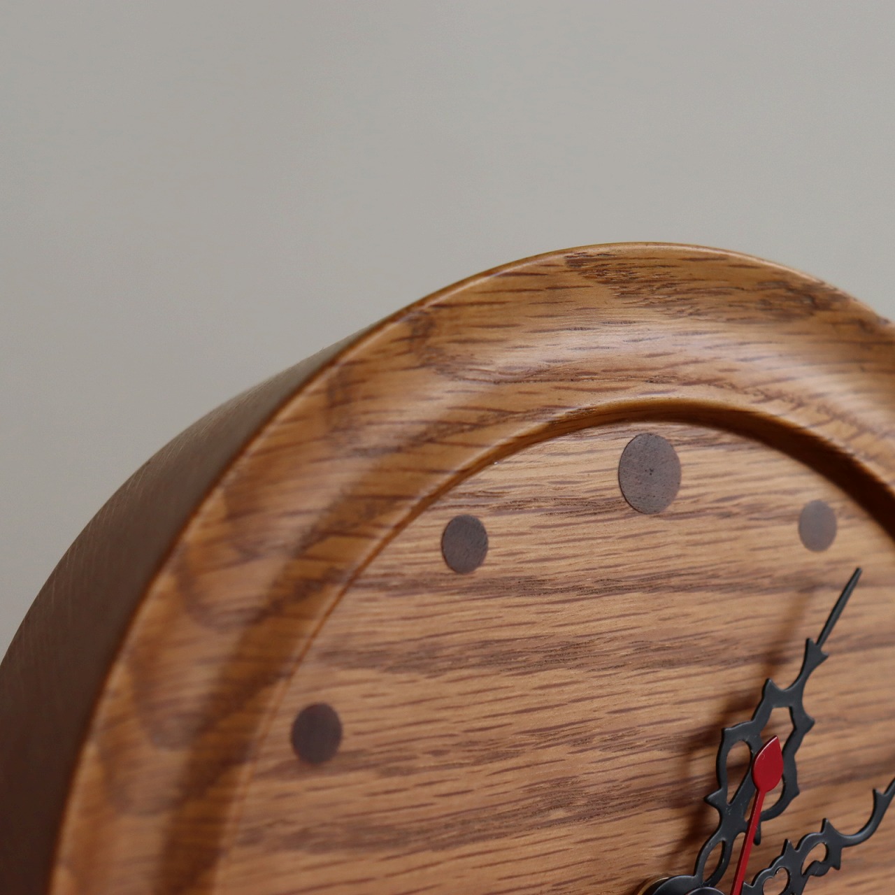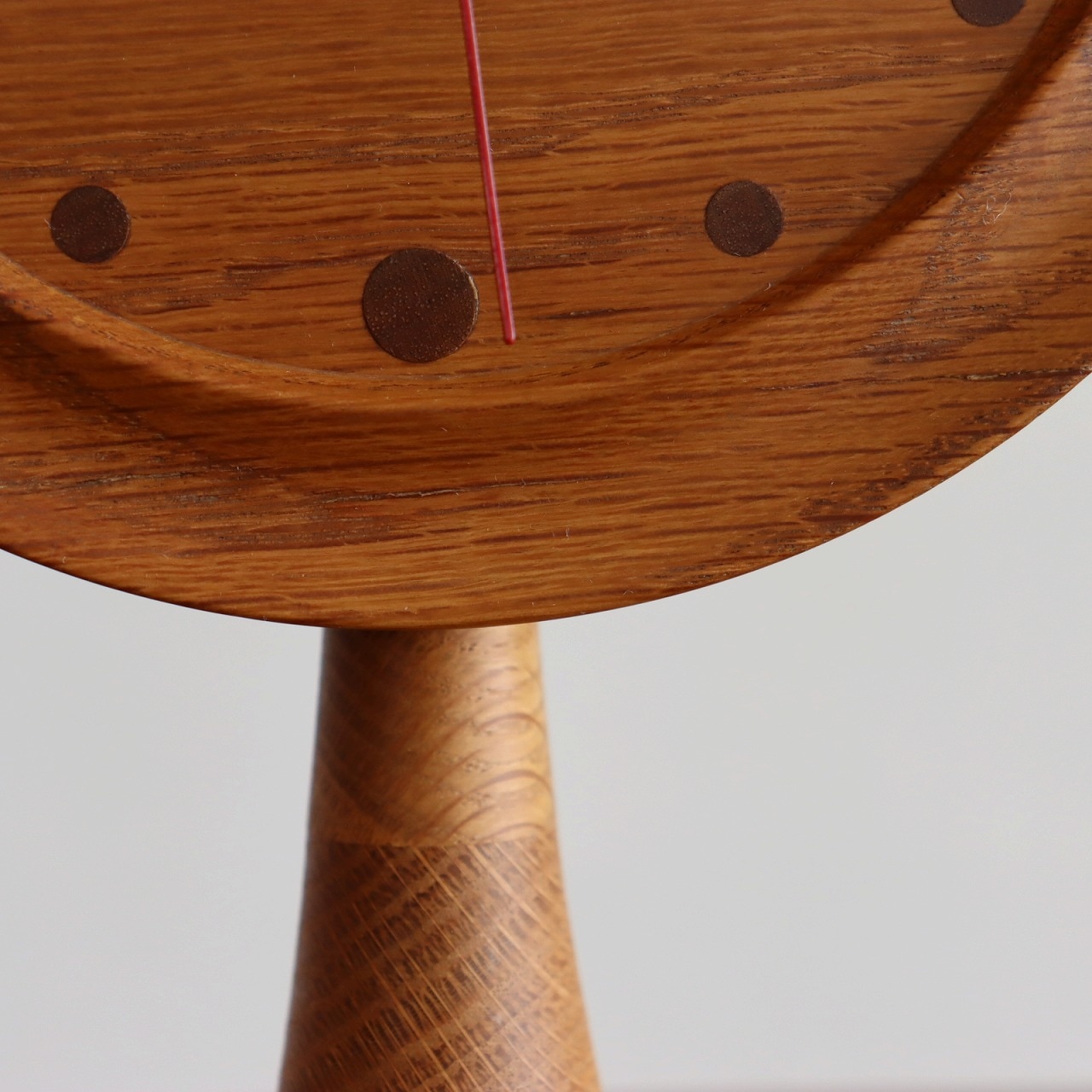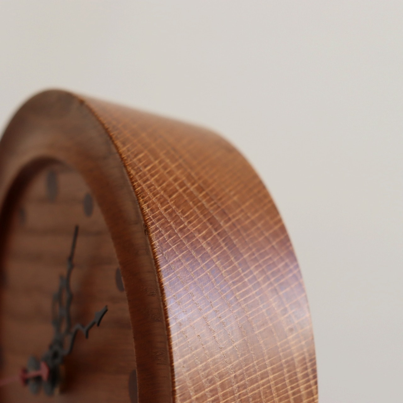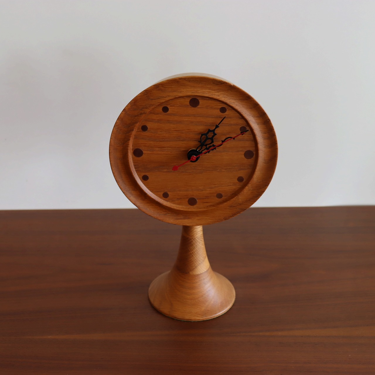 フォルムに可愛らしさが溢れたこちら。しっかりと厚みのあるオーク材の丸い文字盤に、裾野のように広がったベースが支えています。接地面へのラインが滑らかで、しっかりとした安定感があります。