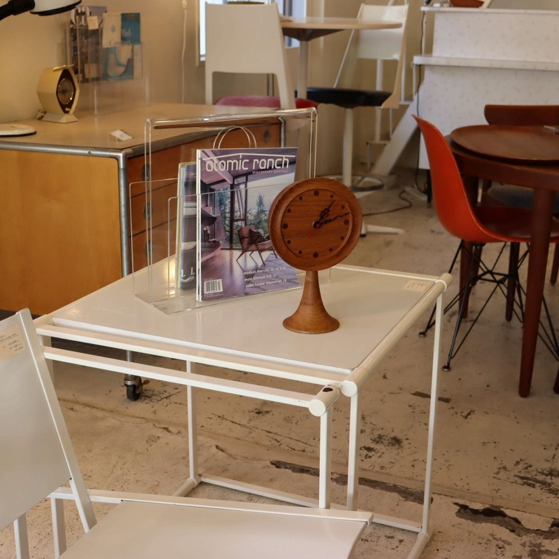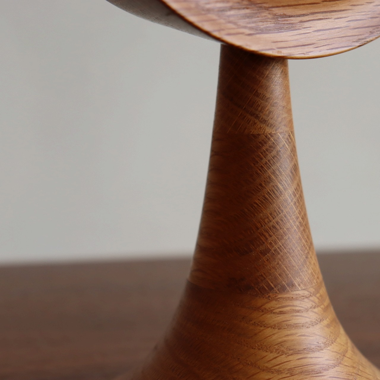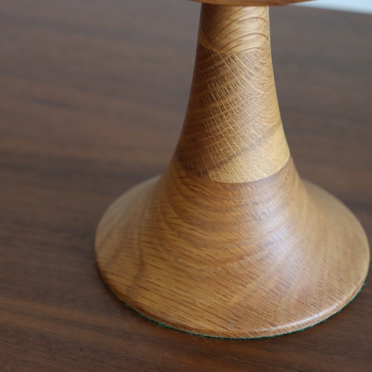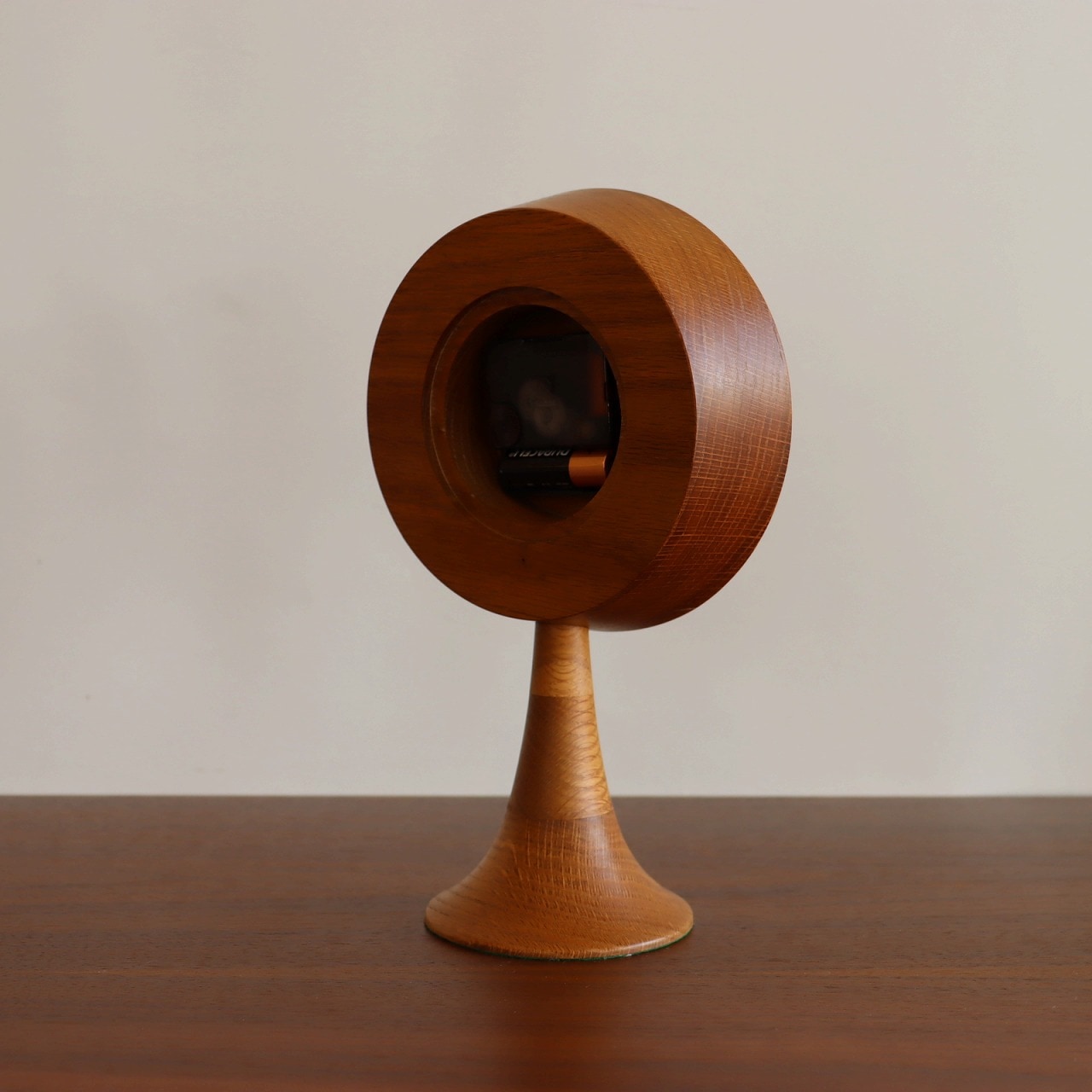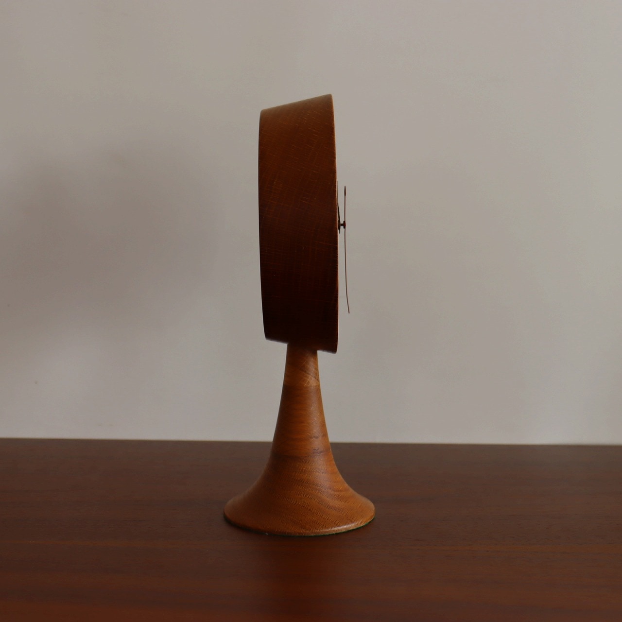 フォルムに可愛らしさが溢れたこちら。しっかりと厚みのあるオーク材の丸い文字盤に、裾野のように広がったベースが支えています。接地面へのラインが滑らかで、しっかりとした安定感があります。