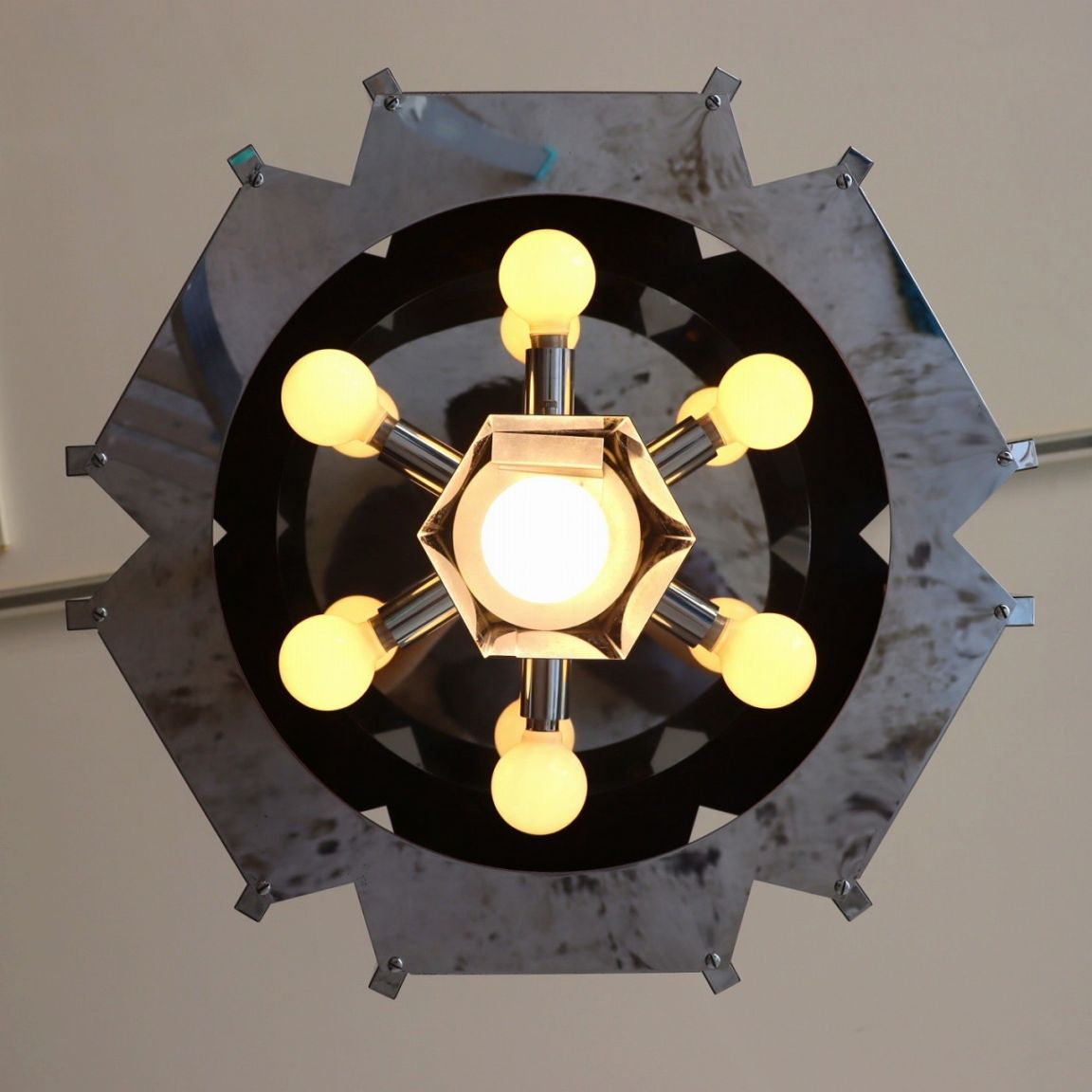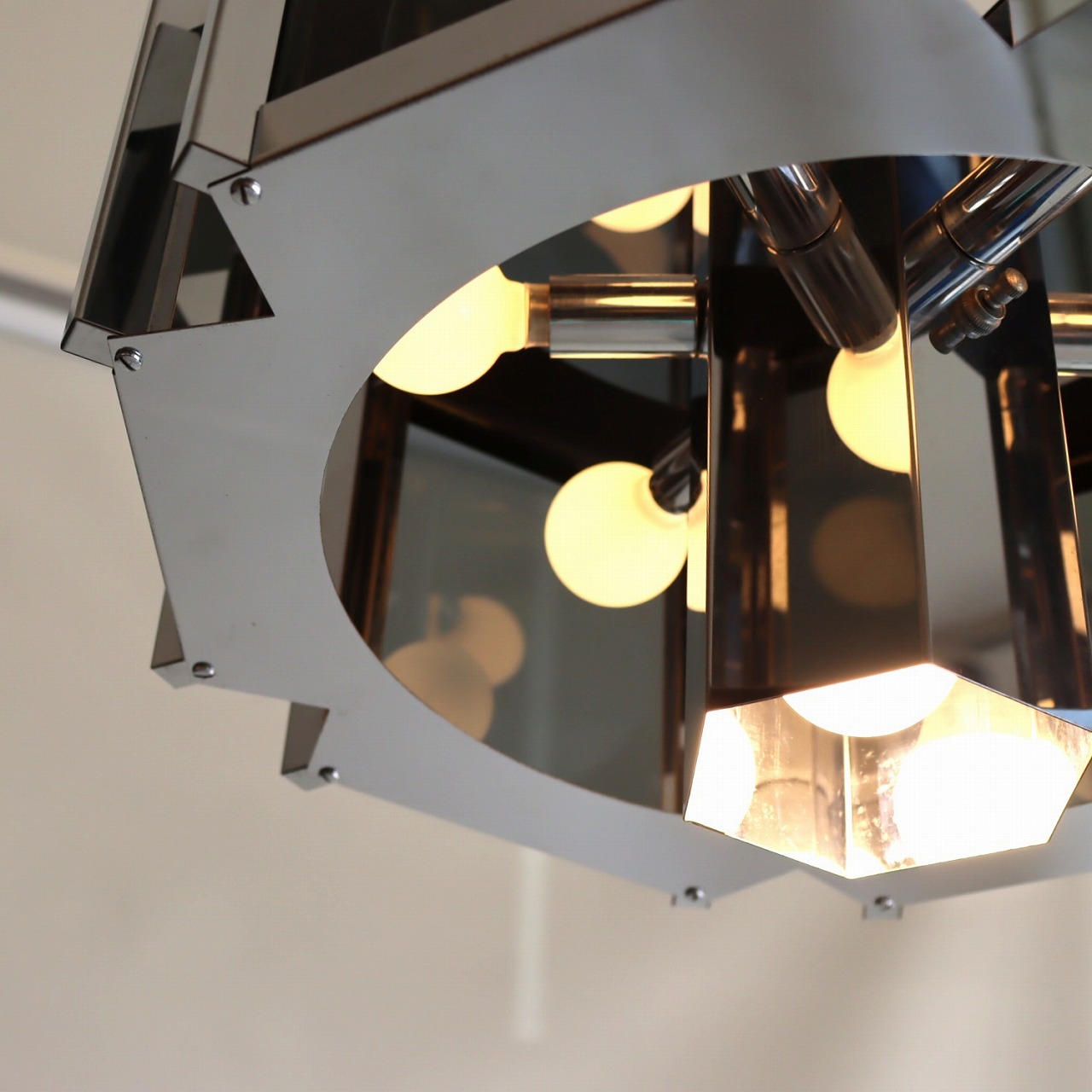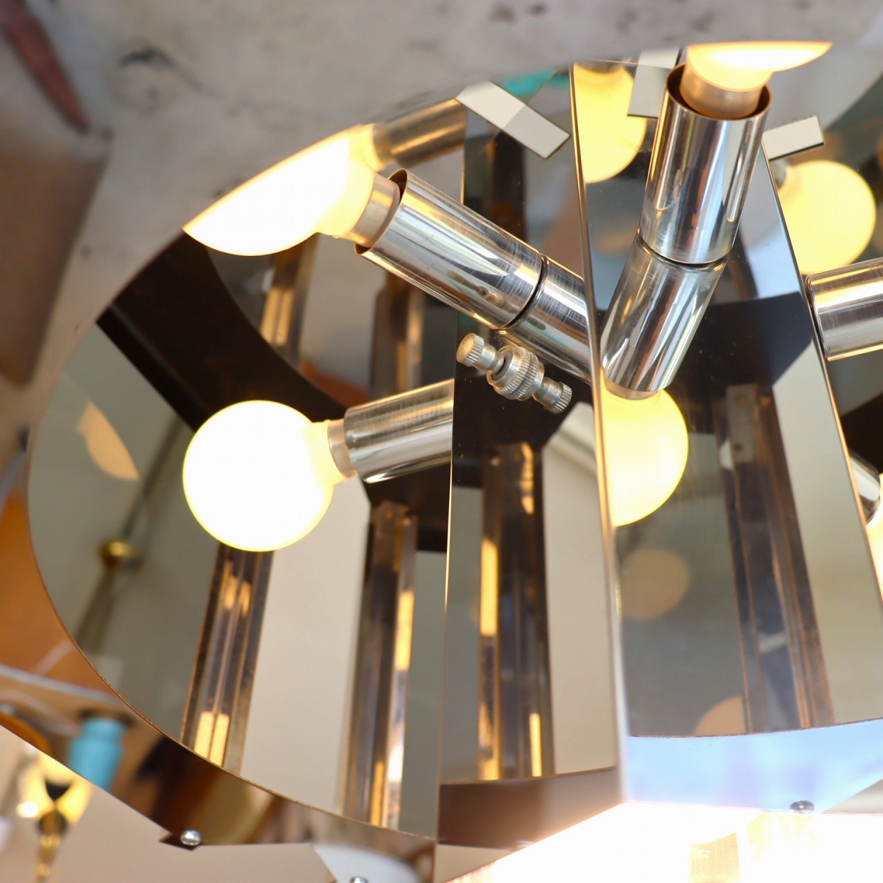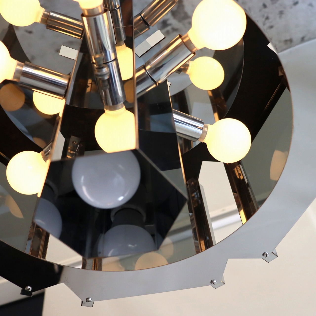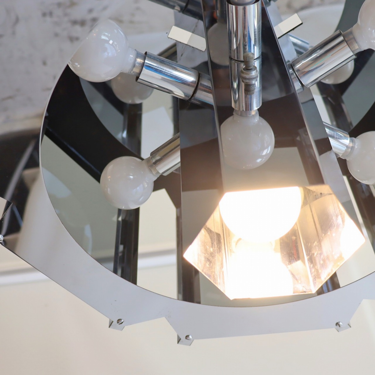 照明内部には放射状に6個ランプが付いています。クロームメッキの表面は鏡のように背景や照明の灯りを映り込ませるので、万華鏡のような煌びやかで魅力的な雰囲気。ランプ中央からが1灯下面を照らしているので、明るさも十分ですね。