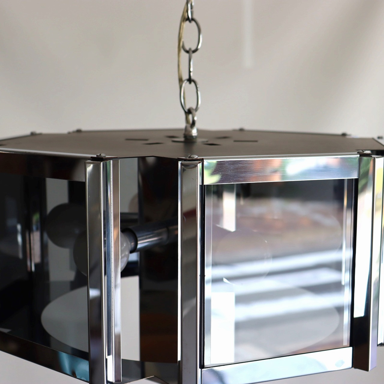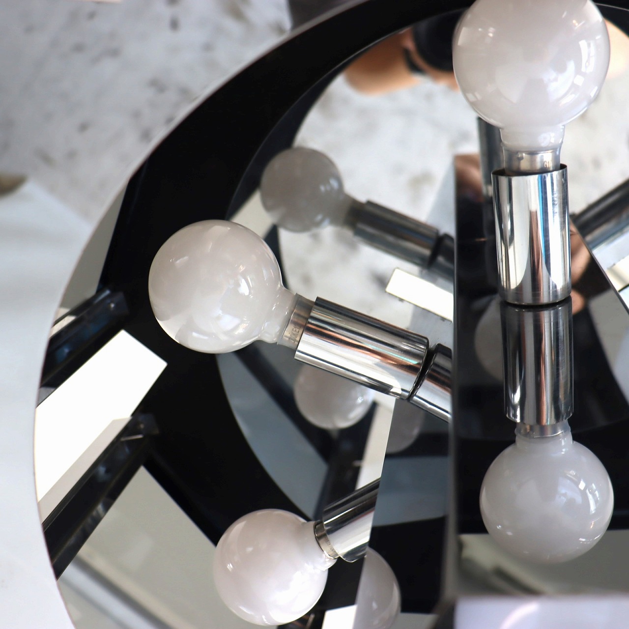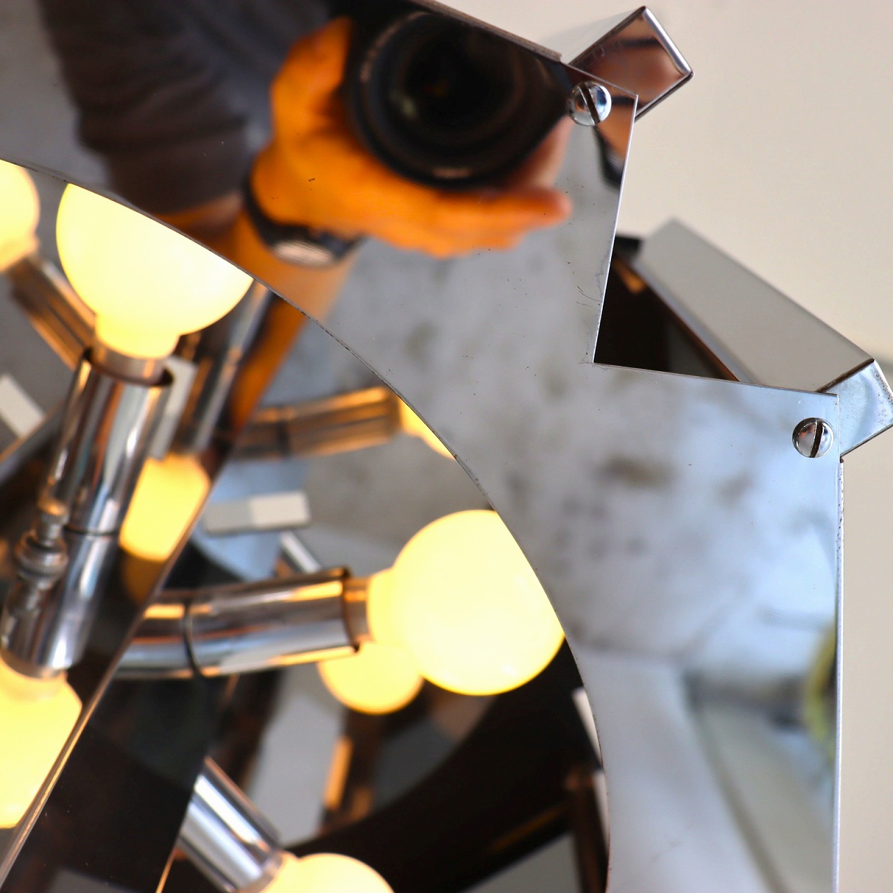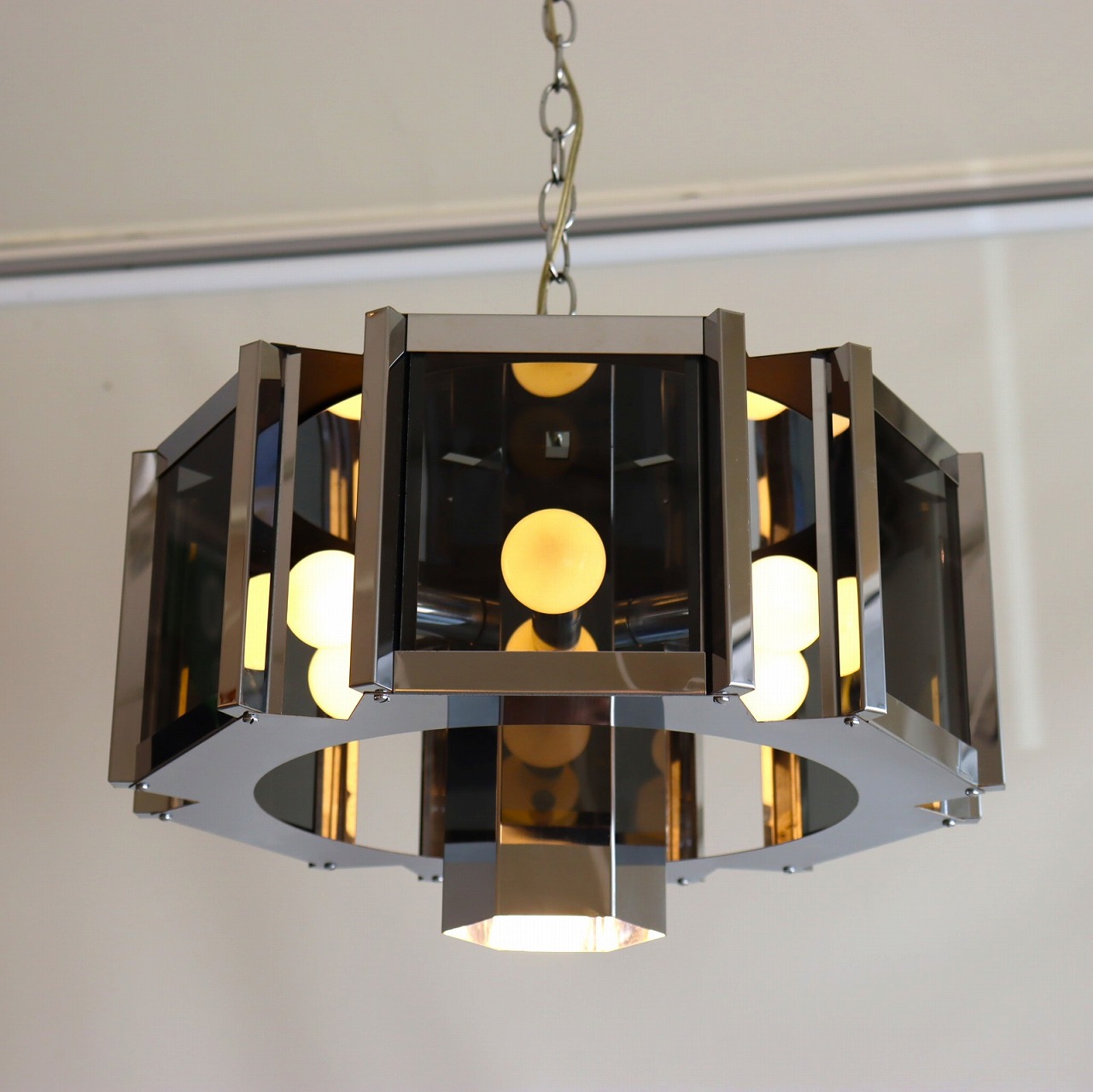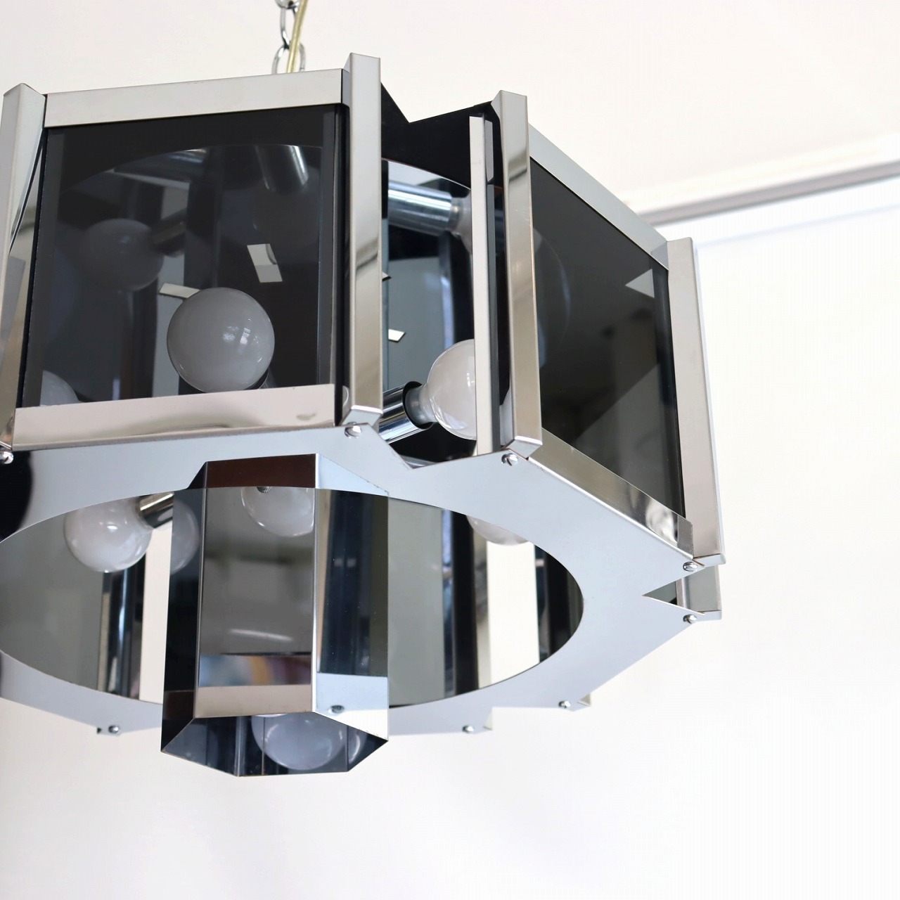 照明内部には放射状に6個ランプが付いています。クロームメッキの表面は鏡のように背景や照明の灯りを映り込ませるので、万華鏡のような煌びやかで魅力的な雰囲気。ランプ中央からが1灯下面を照らしているので、明るさも十分ですね。