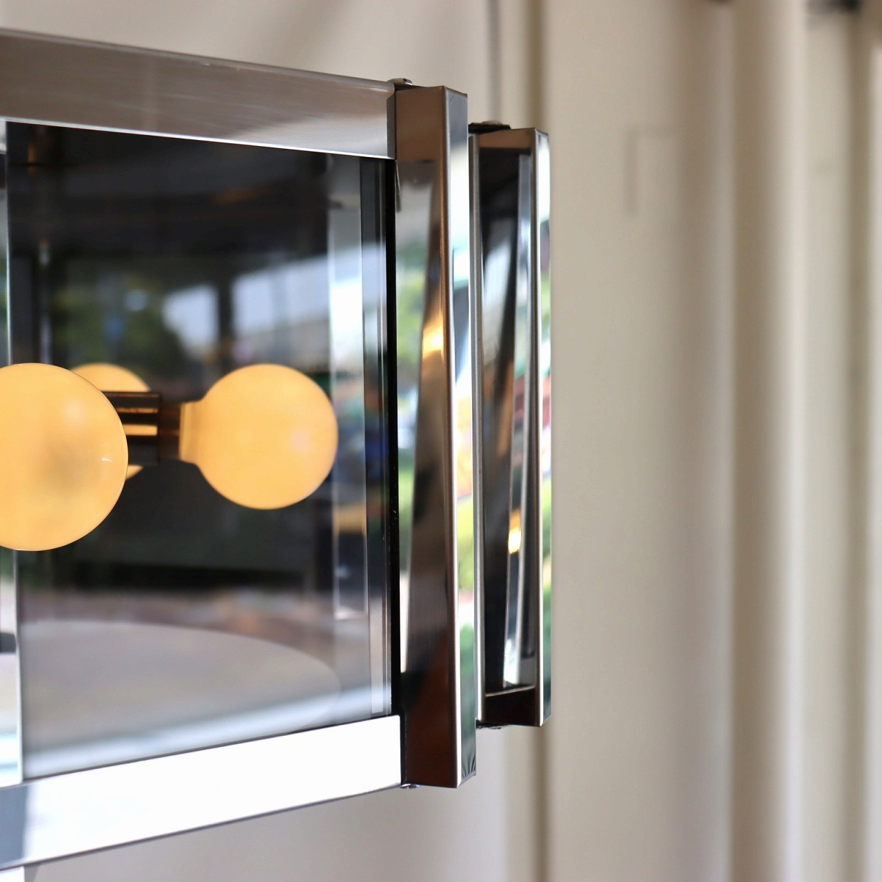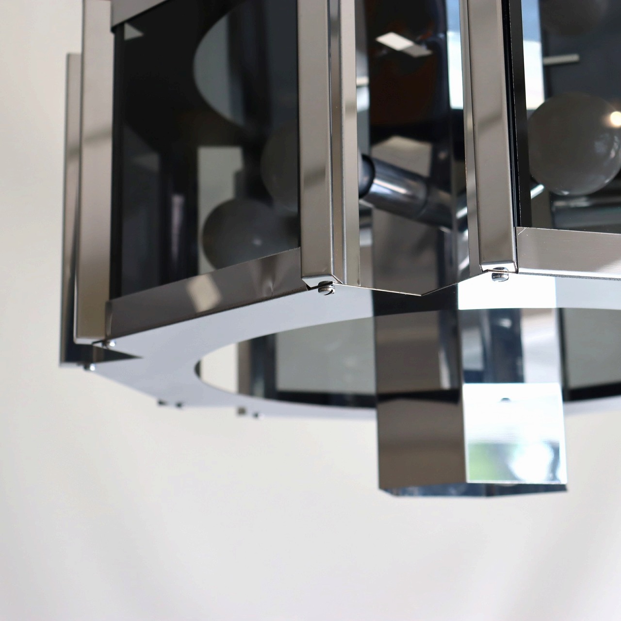 6角形のシルエットで、フレーム側面にガラス窓が施されたデザイン。艶やかなクロームメッキとスモークガラスが組み合わさって、華やかかつ上品な佇まいです。