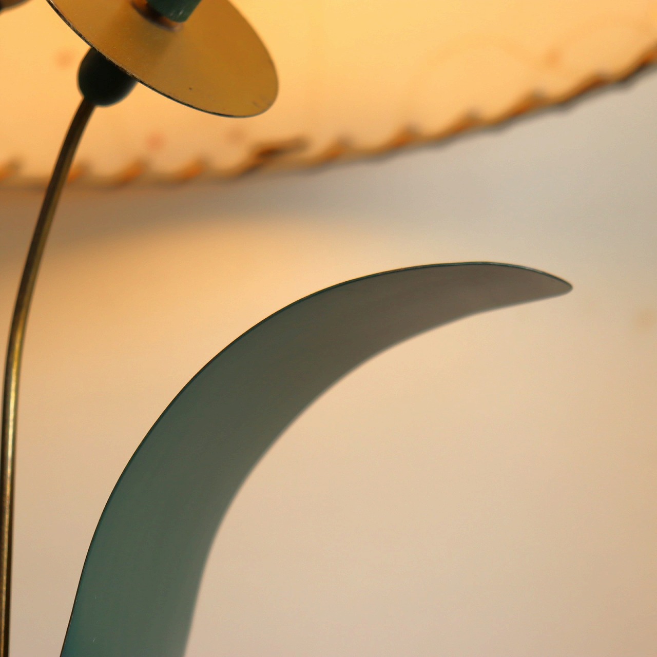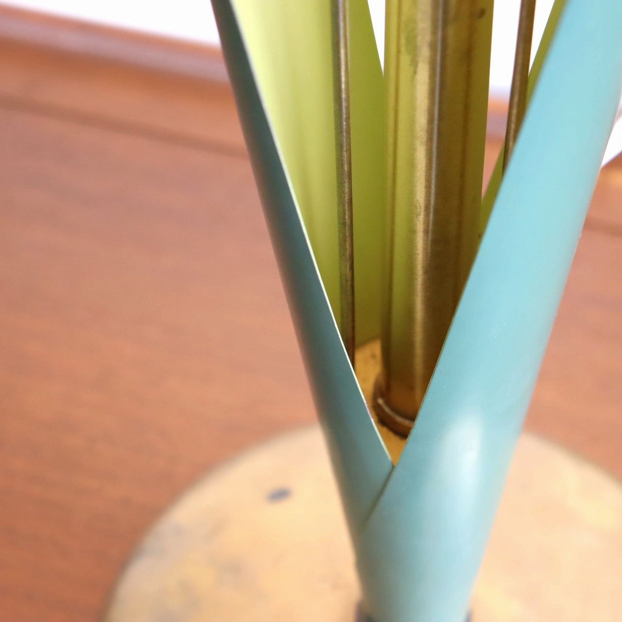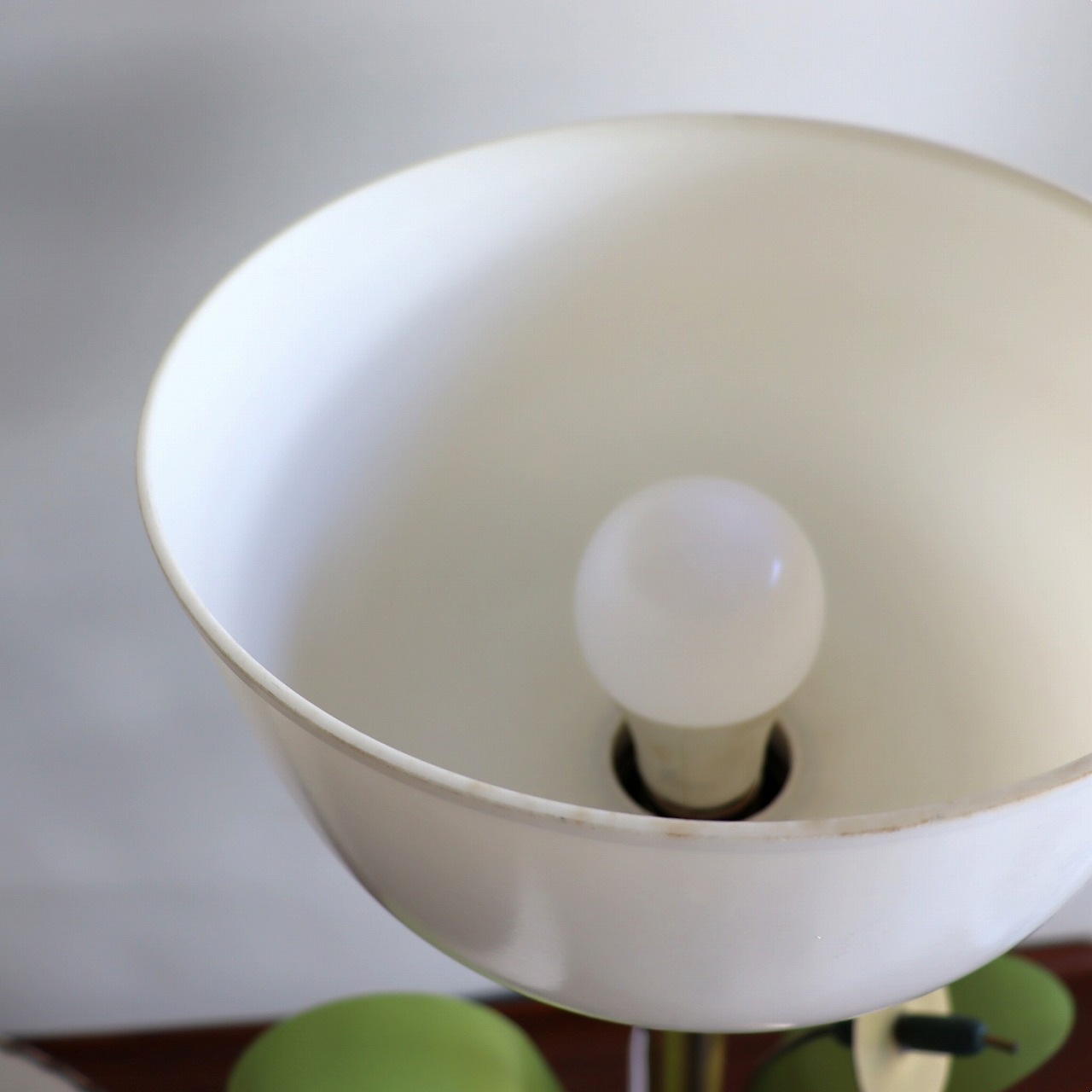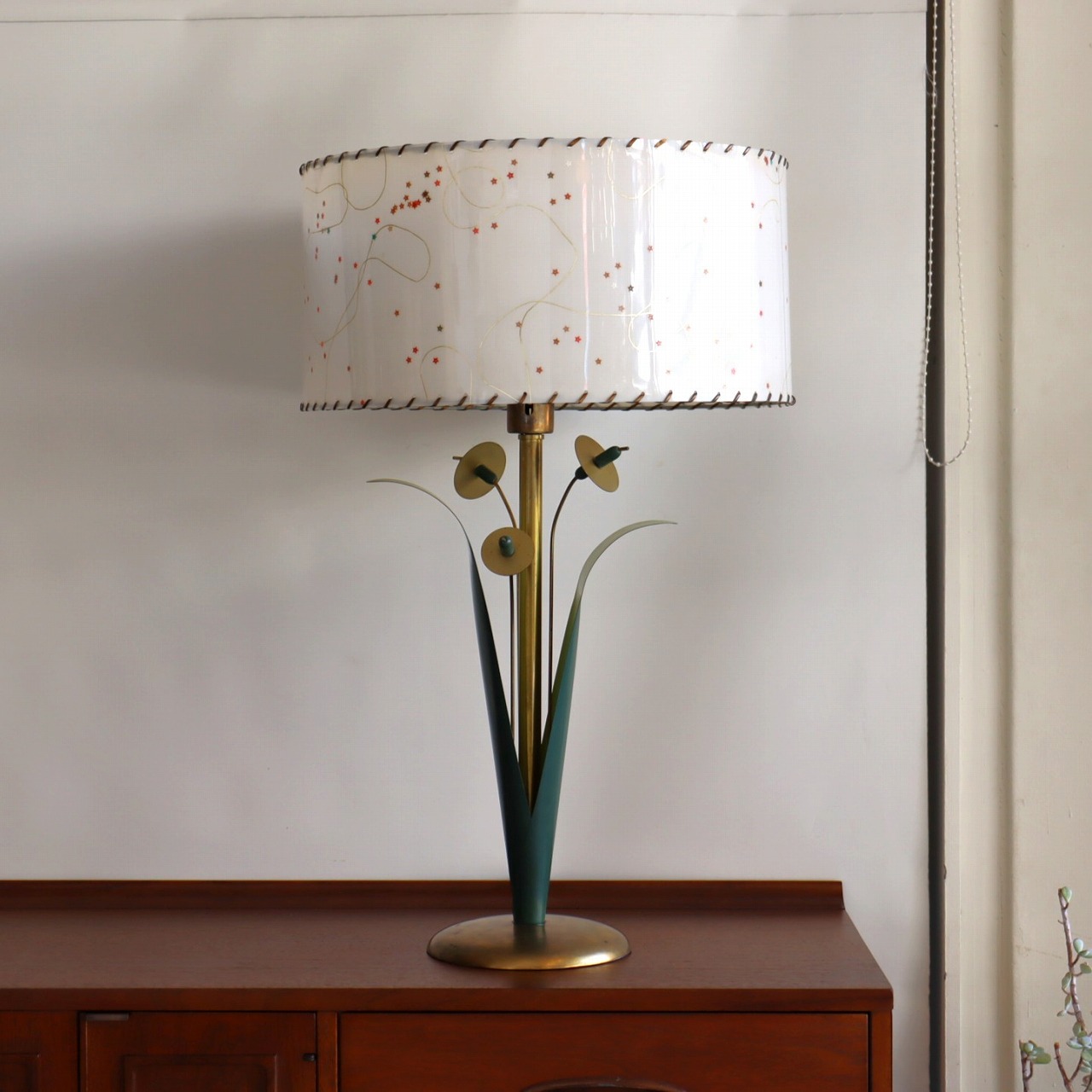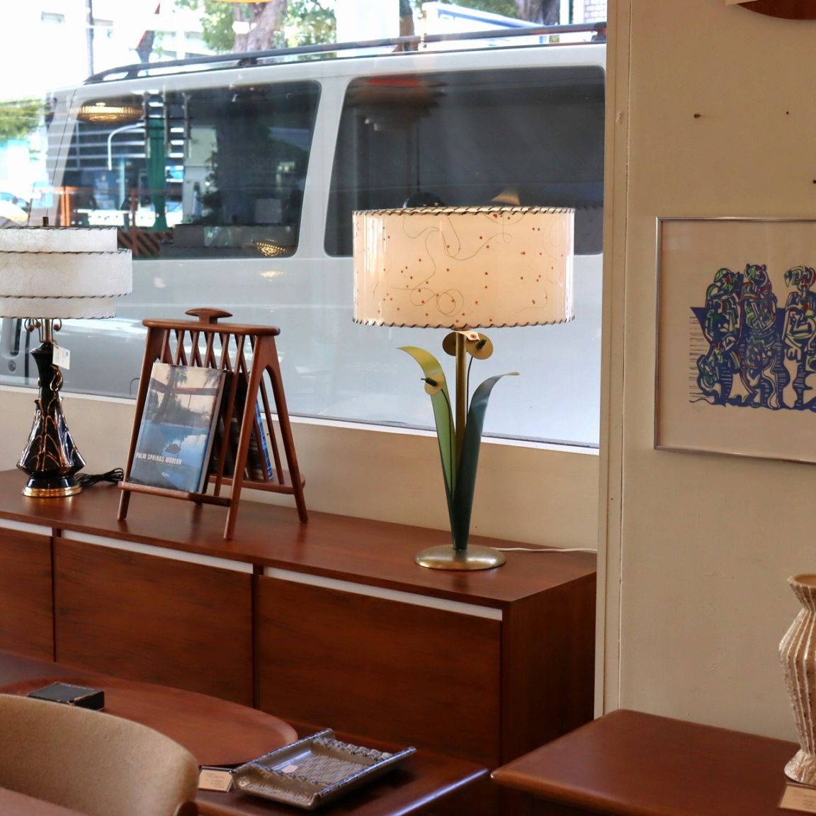 ゴールドは灯りに照らされるとよりきらめきを増して輝きます。グリーンの塗装が施された茎や葉などでバランスのいいミッドセンチュリーらしい華やかさがあります。台座は中央が高くなった円形なのでまるで土から生えているようですね。