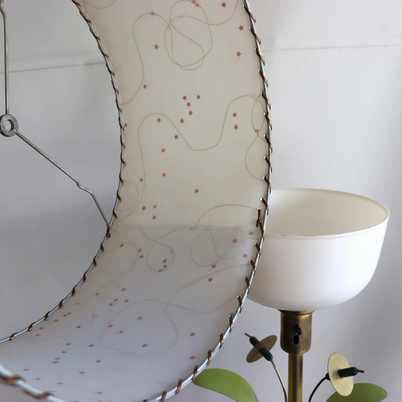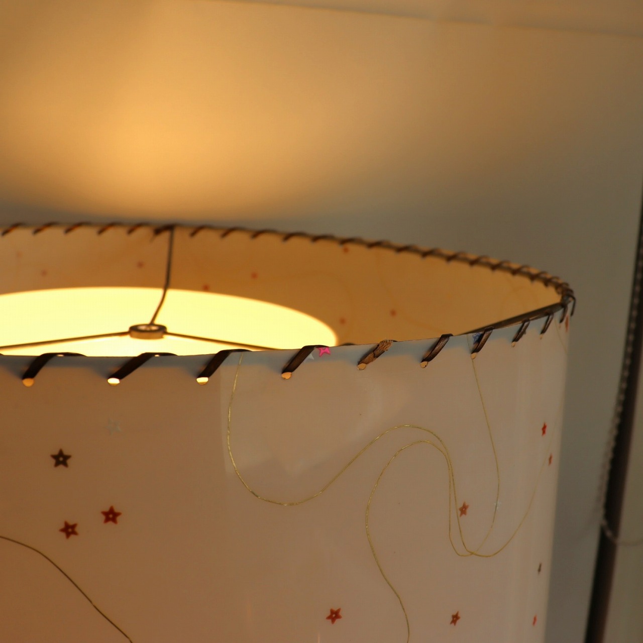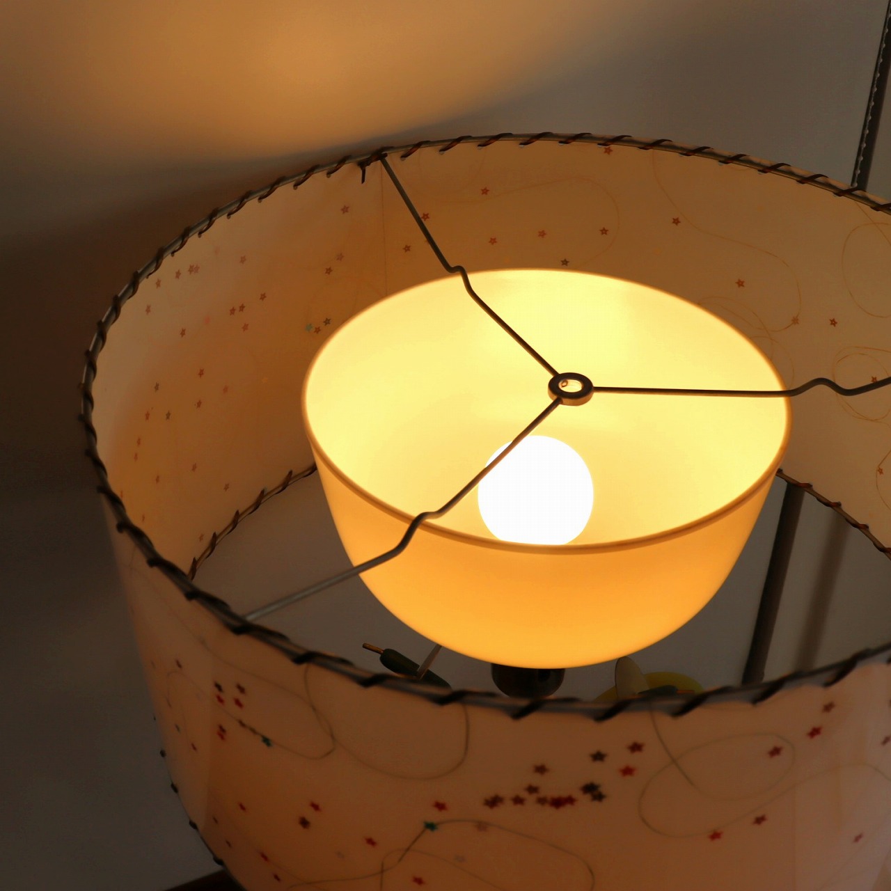 ビニールのシェードにはカラフルな星柄模様とゴールドの曲線が描かれています。星柄は小ぶりで一見ドットのようですが、よく見ると流れ星が流れる星空のようなシェードです。キュートな大人の可愛らしさが感じられますね。