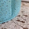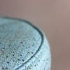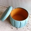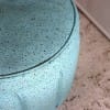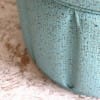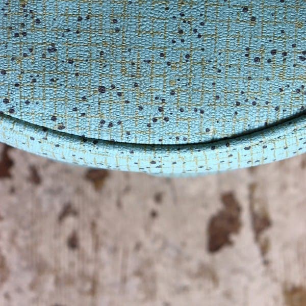 円柱状の本体に張られたエメラルドグリーンの生地がとても綺麗です。70年前のオリジナルのビニールレザーで、ゴールドの縞の模様と小さなドットがちりばめられているデザインがフィフティースらしい模様です。