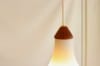 ぷっくり膨らんだ壺のようなフォルムのすりガラスのシェードがやさしい雰囲気です。トップのチークパーツもモダンなエッセンスを加えつつ温かみを増幅させて、ガラスの風合いとよく合っていますね。