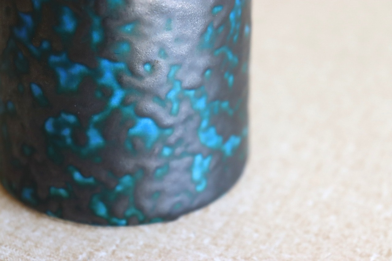 上部は鮮やかな青で艶のある青で、下部は少し緑がかった水色にヴィンテージカーキのようなfat lavaらしい釉薬が流れたこちら。