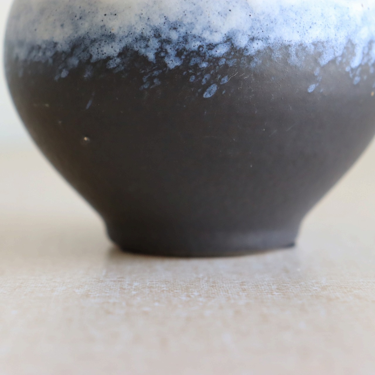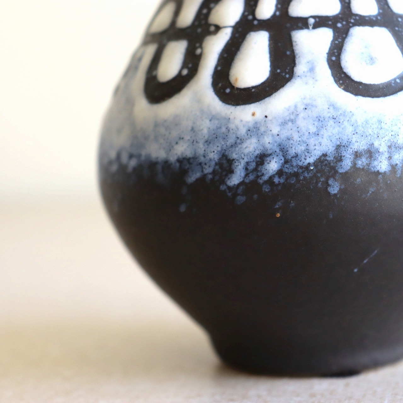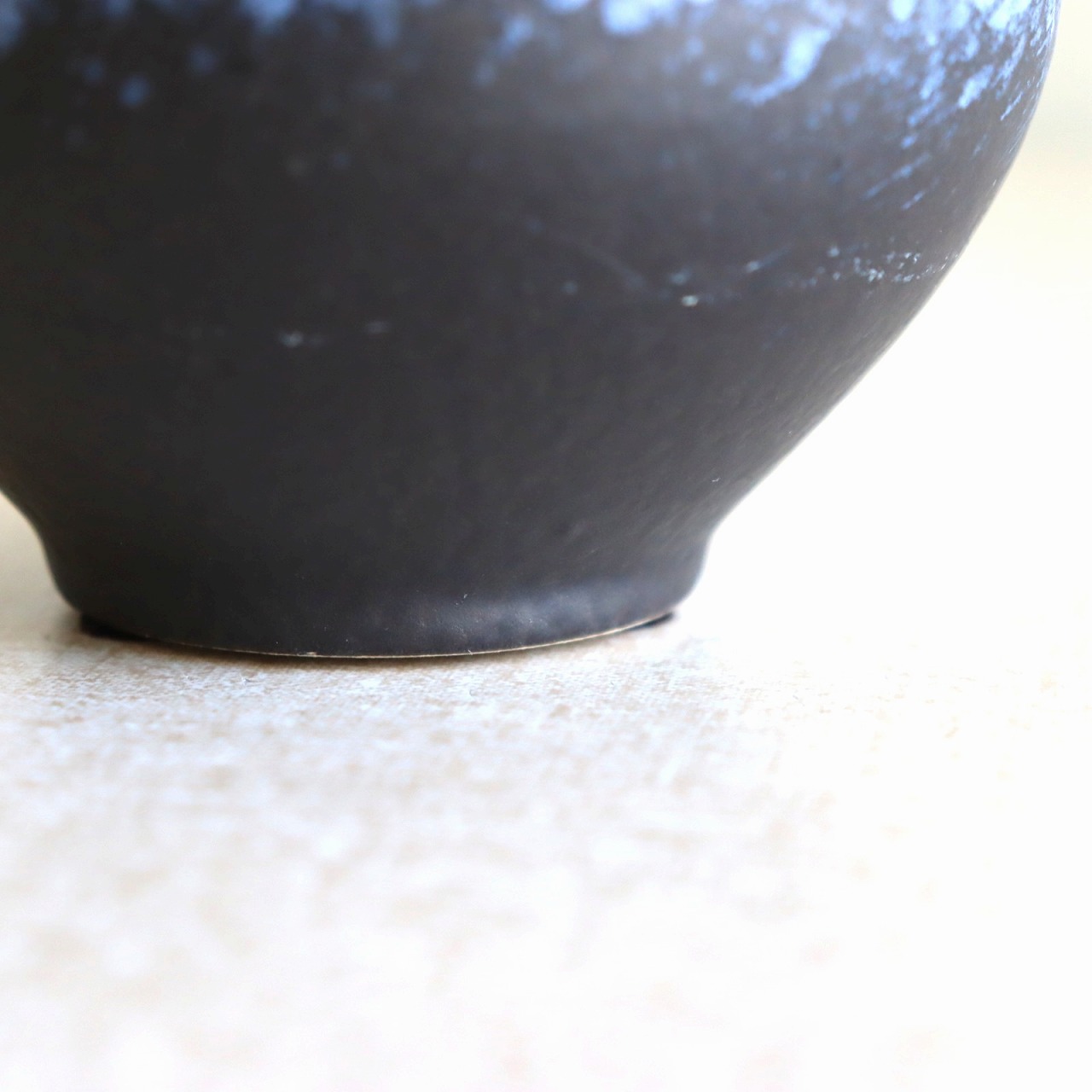 ダークネイビーのベースカラーにホワイトの釉薬が施されたデザイン。うねうねとしたベースカラーが見えてできているラインと、単調ではなく広がるホワイトとブルーのグラデーションが個性的な佇まいですね。