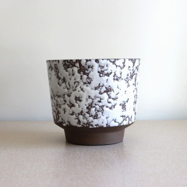ダークブラウンのベースにオフホワイトの釉薬のこちら。チョコレートに砂糖をまぶしたお菓子のような表面で、植物が映える脇役として活躍しそうです。