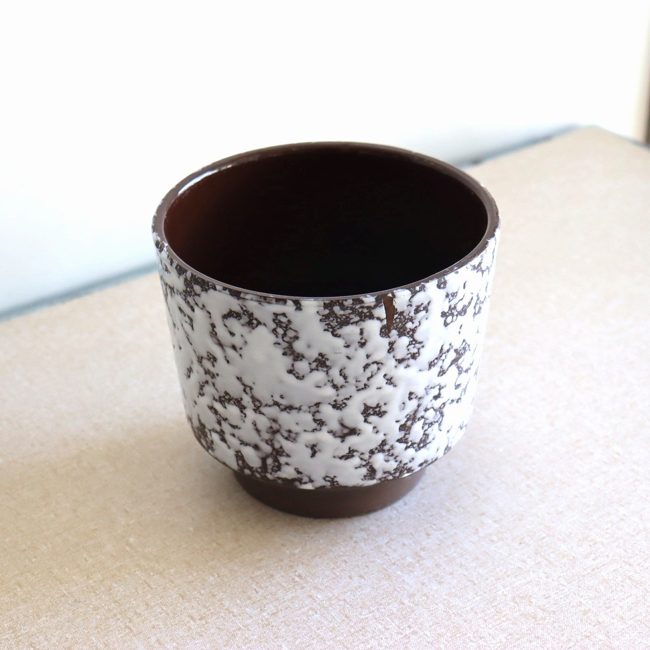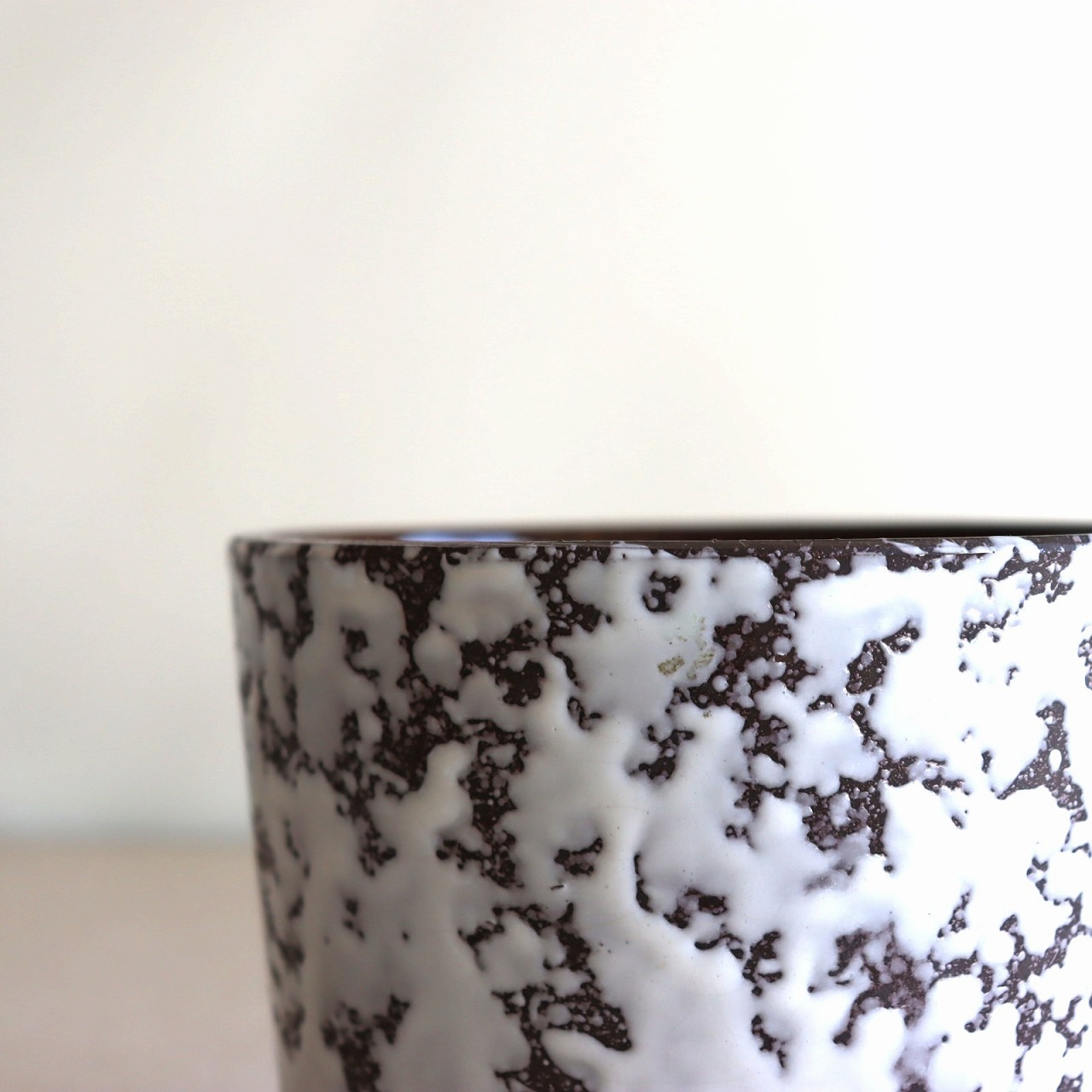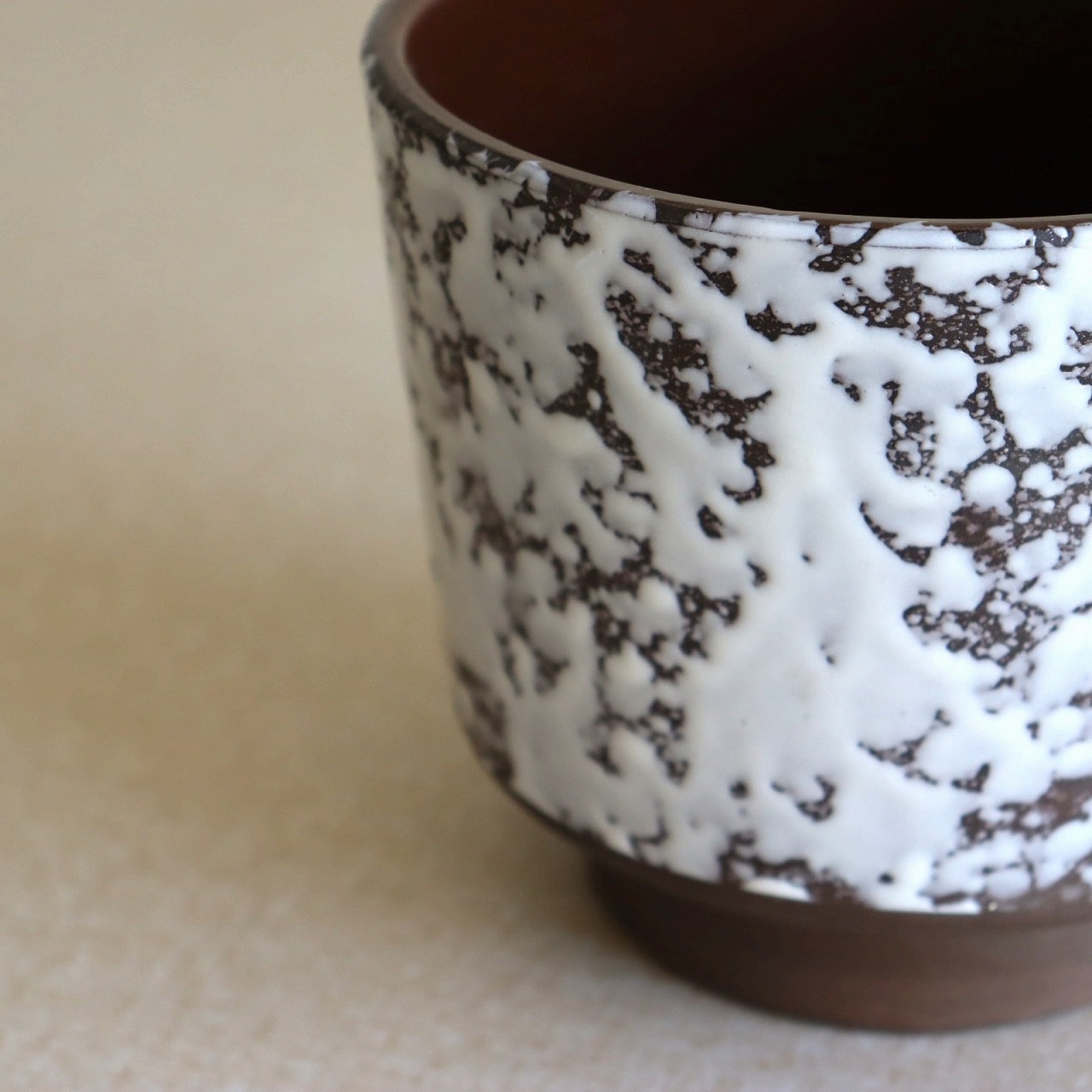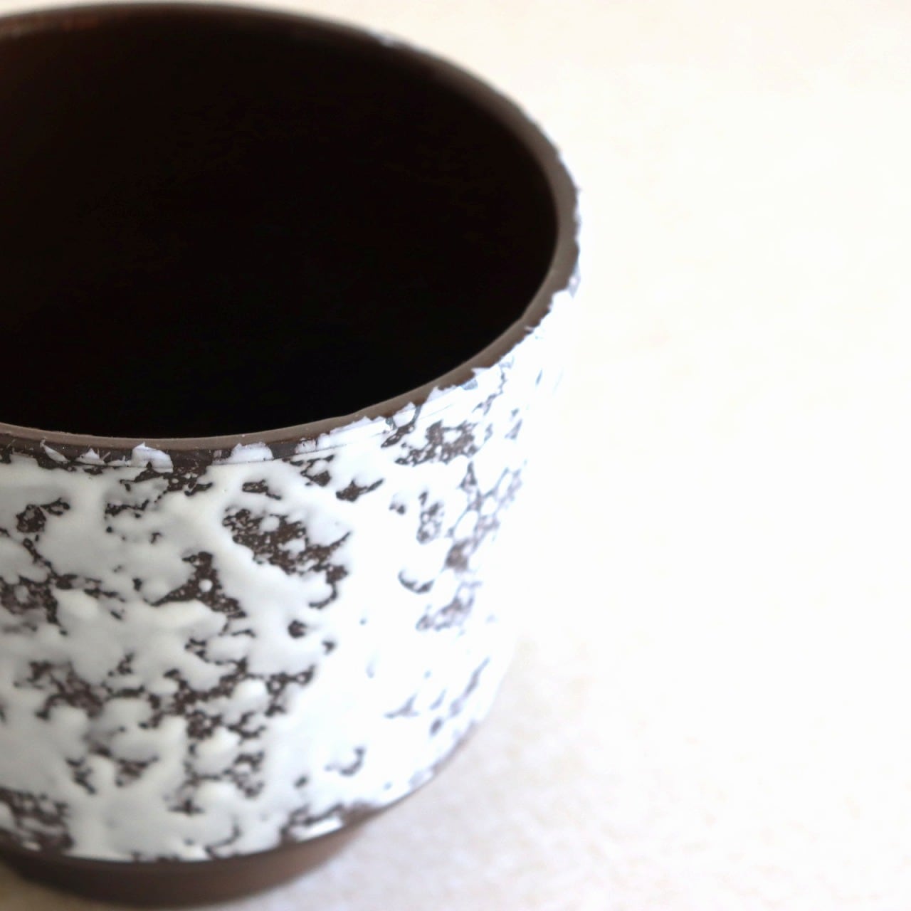 ダークブラウンのベースにオフホワイトの釉薬のこちら。チョコレートに砂糖をまぶしたお菓子のような表面で、植物が映える脇役として活躍しそうです。