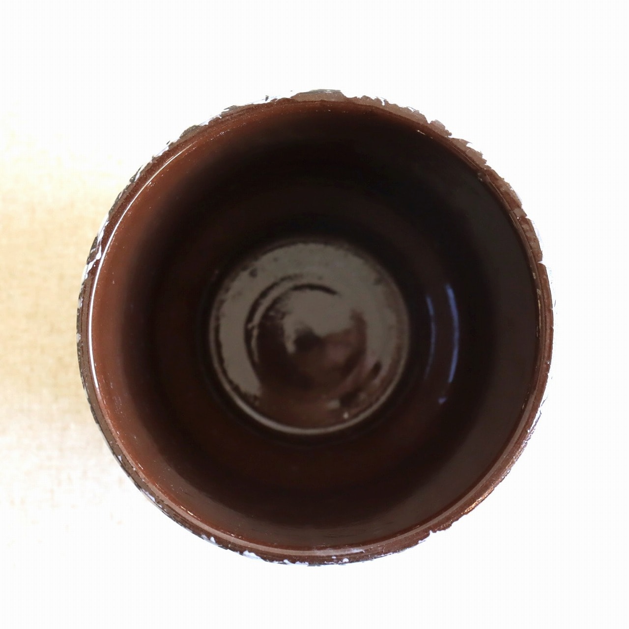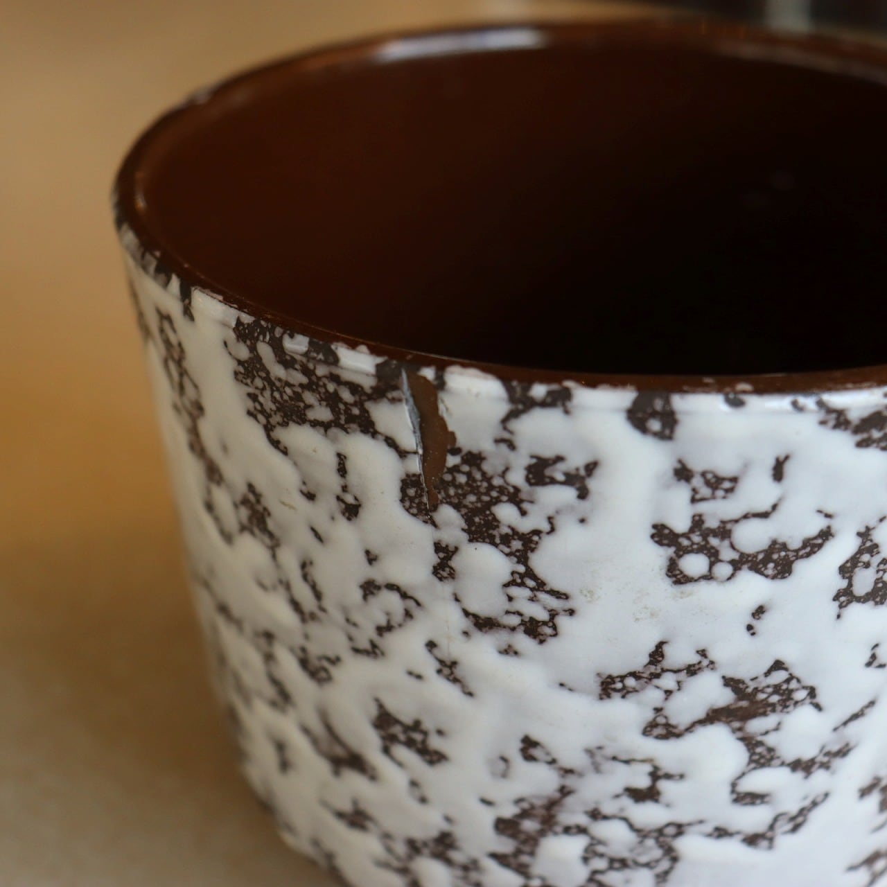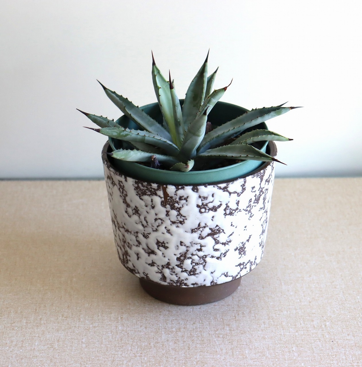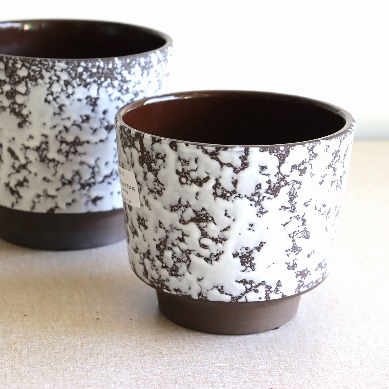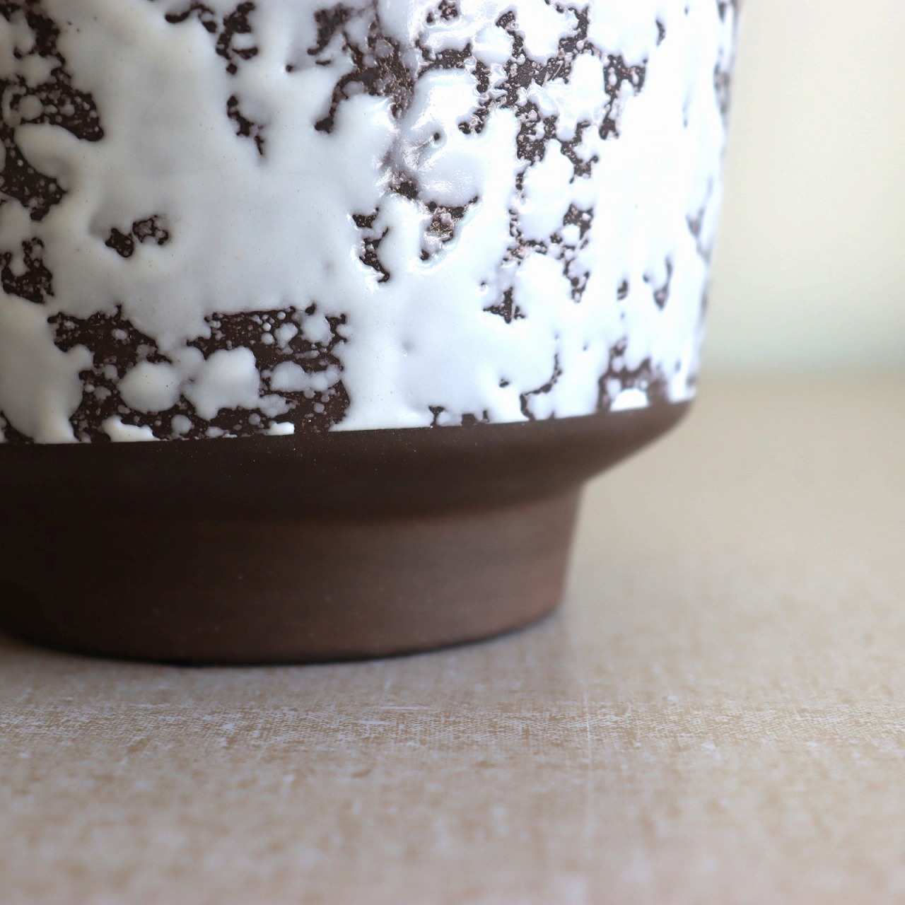 ダークブラウンのベースにオフホワイトの釉薬のこちら。チョコレートに砂糖をまぶしたお菓子のような表面で、植物が映える脇役として活躍しそうです。