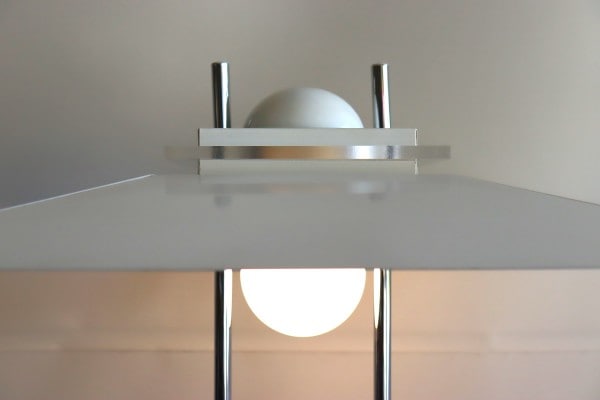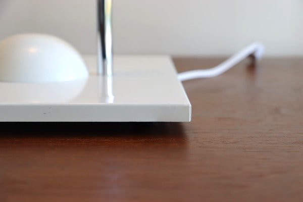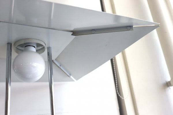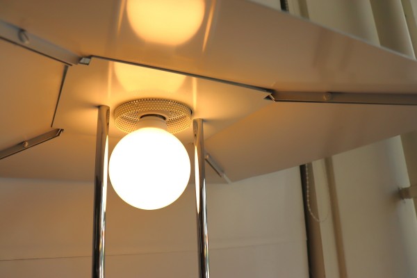 傘とベースを?ぐ2本の支柱が程よいアクセントで全体のバランスを整えていますね。ホワイト×シルバーはクールであり、爽やかな印象。電球のあたたかな光りに照らされるとまた違った表情になります。