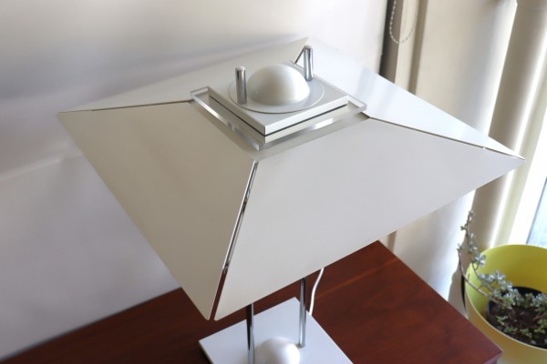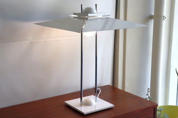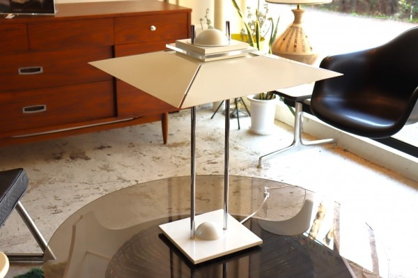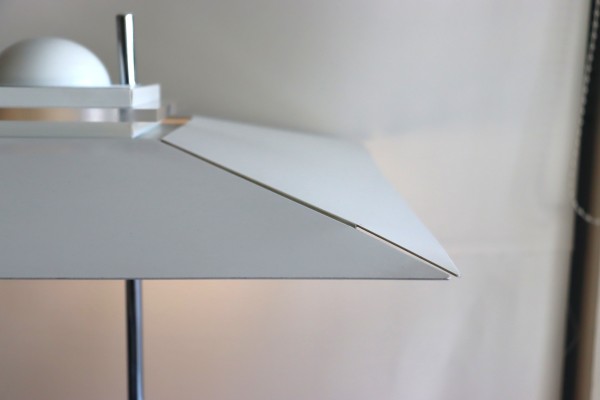 アールデコを連想する大きなシェードが傘のように上に付いた特徴的なデザイン。シェードのボリュームはありながら、重たさを感じさせない抜け感のある佇まいです。