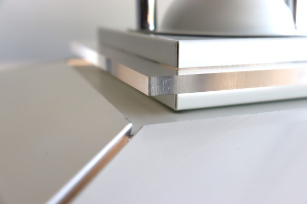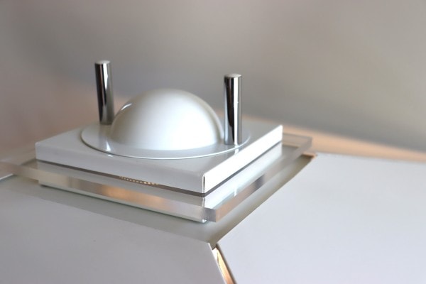 シェードは寄棟屋根のように外へむけて角度が付いていて、角が強調されたデザイン。ジョイントの隙間や中央に施されたアクリルパーツから光が洩れ、上部にもほんのりと光りが届きます。