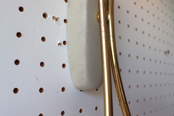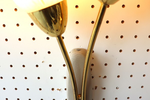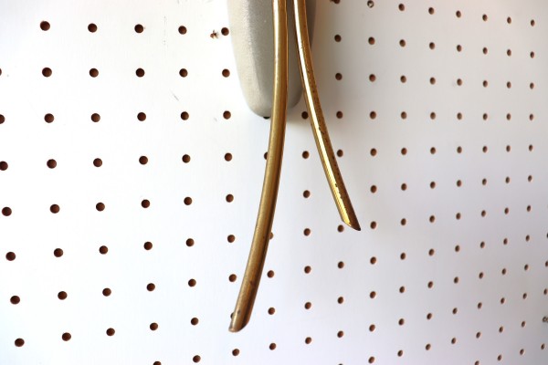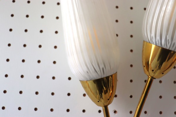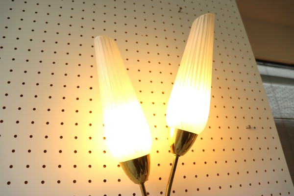 ベースから伸びた茎のような真鍮のアームは緩やかな曲線。ヴィンテージらしい深みのある鈍い輝きで、ガラスの美しさを一層際立たせます。ベースのハンマーペイントの模様は柔らかく、バランスの取れた組み合わせですね。