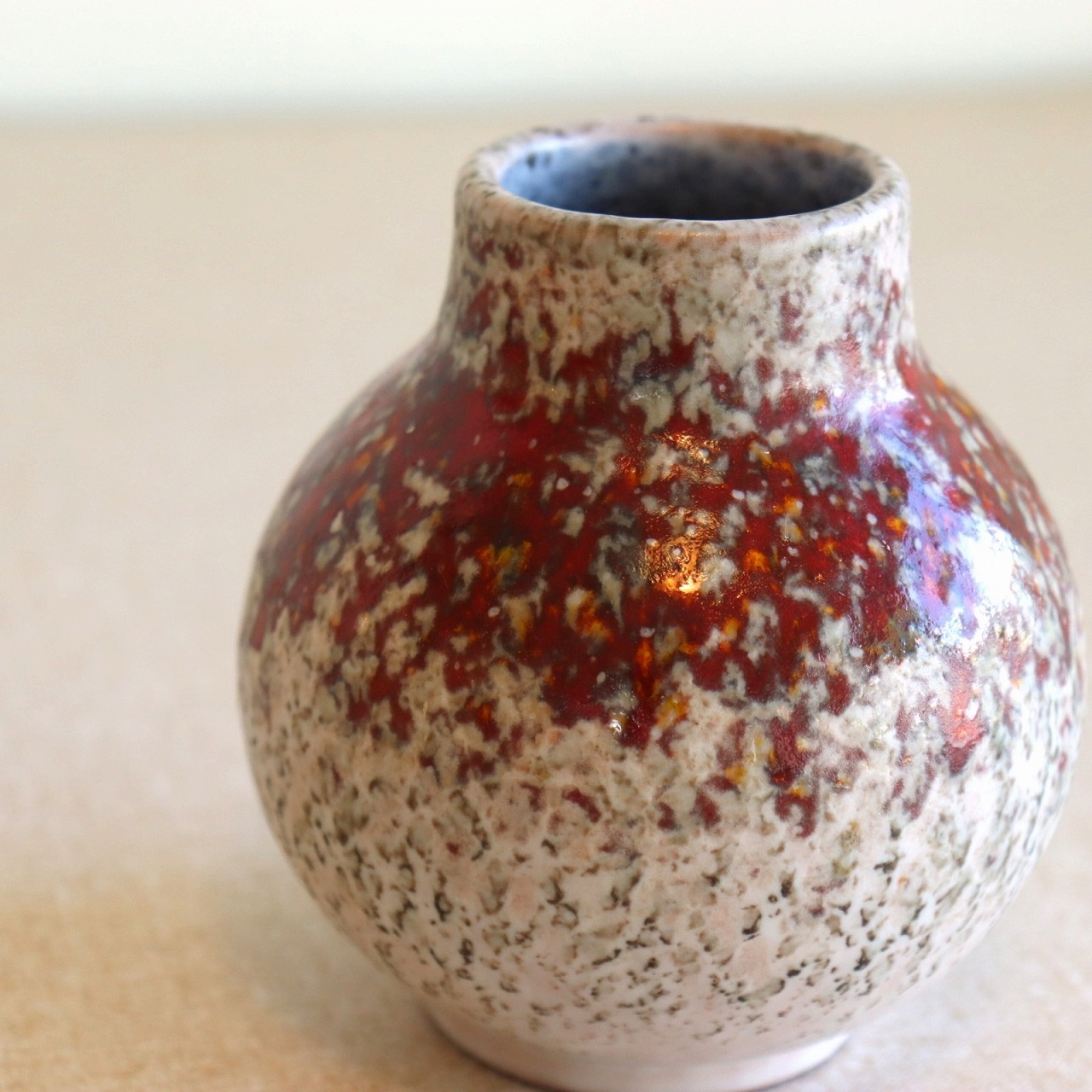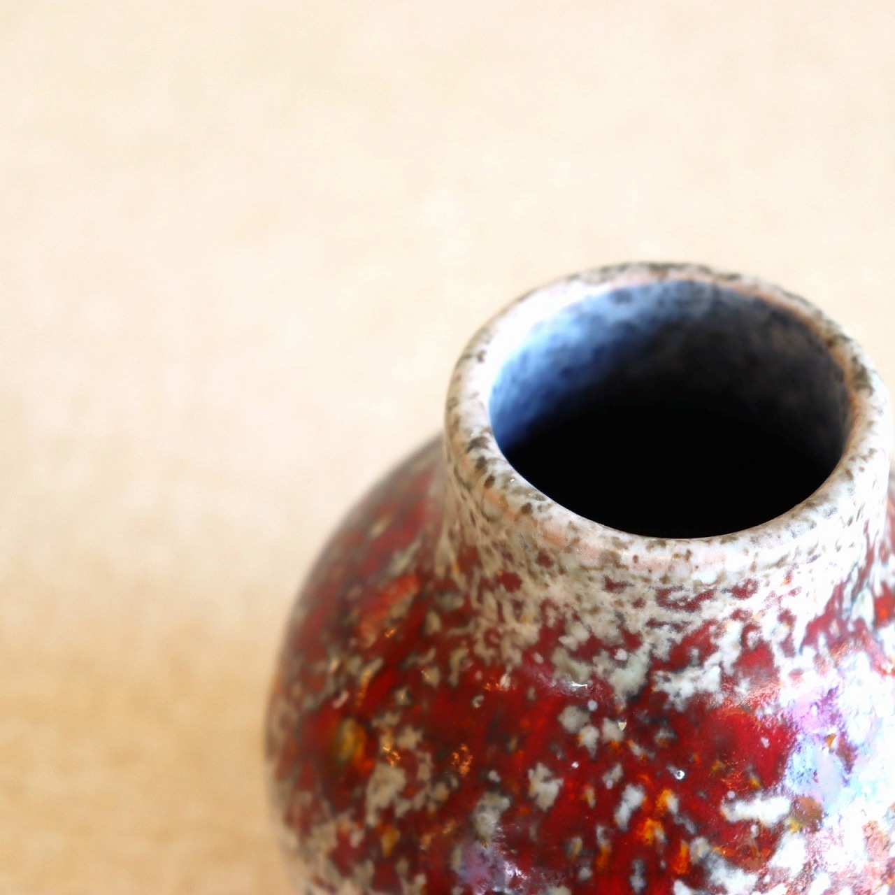 落ち着いたグレーの色合いも表情豊かで、深みがあります。上部は渋いレッドの釉薬が混ぜられており、上品さも感じられるこちら。Fat Lavaという技法で作られたドイツのポタリーベースらしい佇まいです。