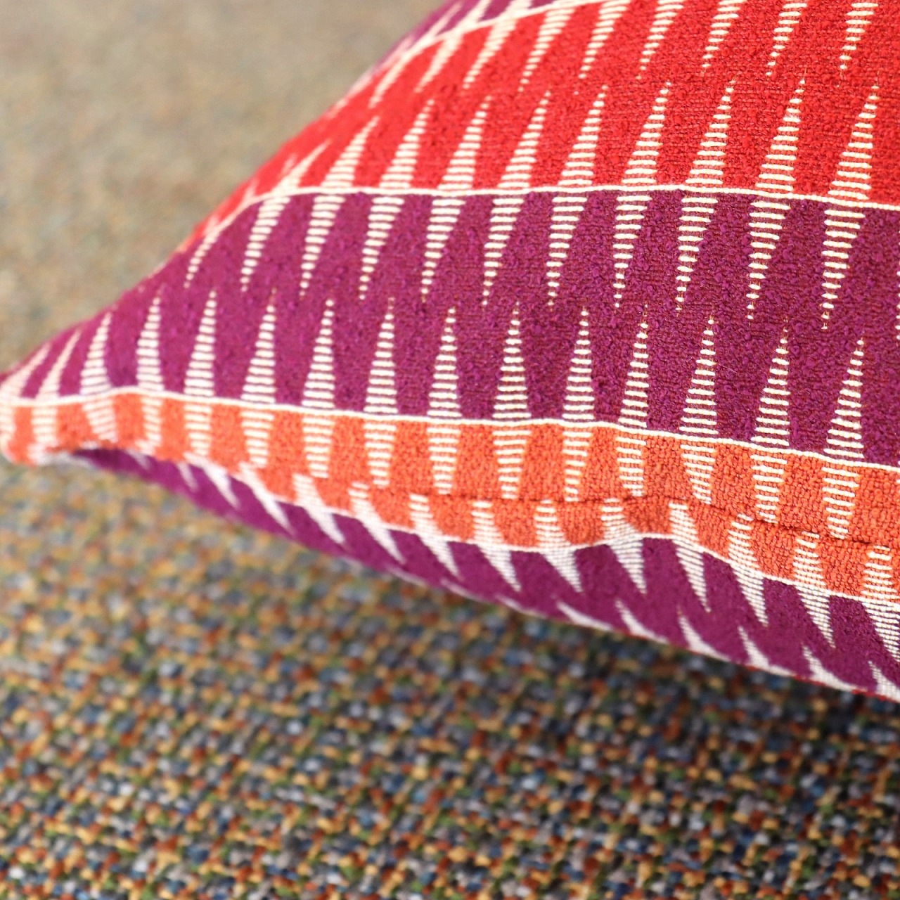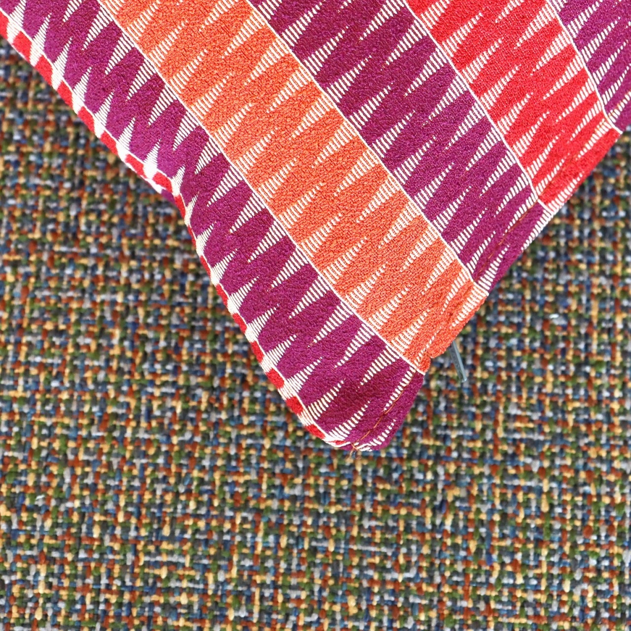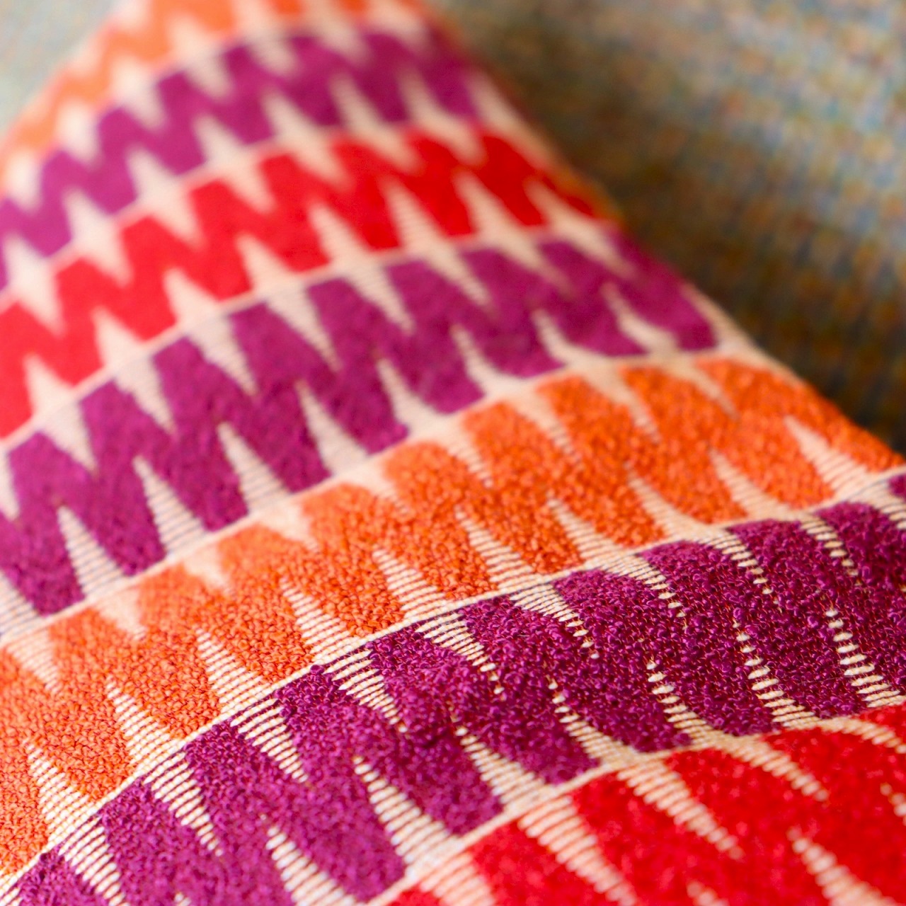 こちらはアイボリーをベースにレッド、パープル、オレンジで模様が入っています。華やかなこなれたダイヤパターンになっています。