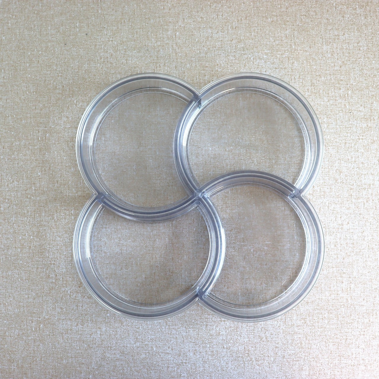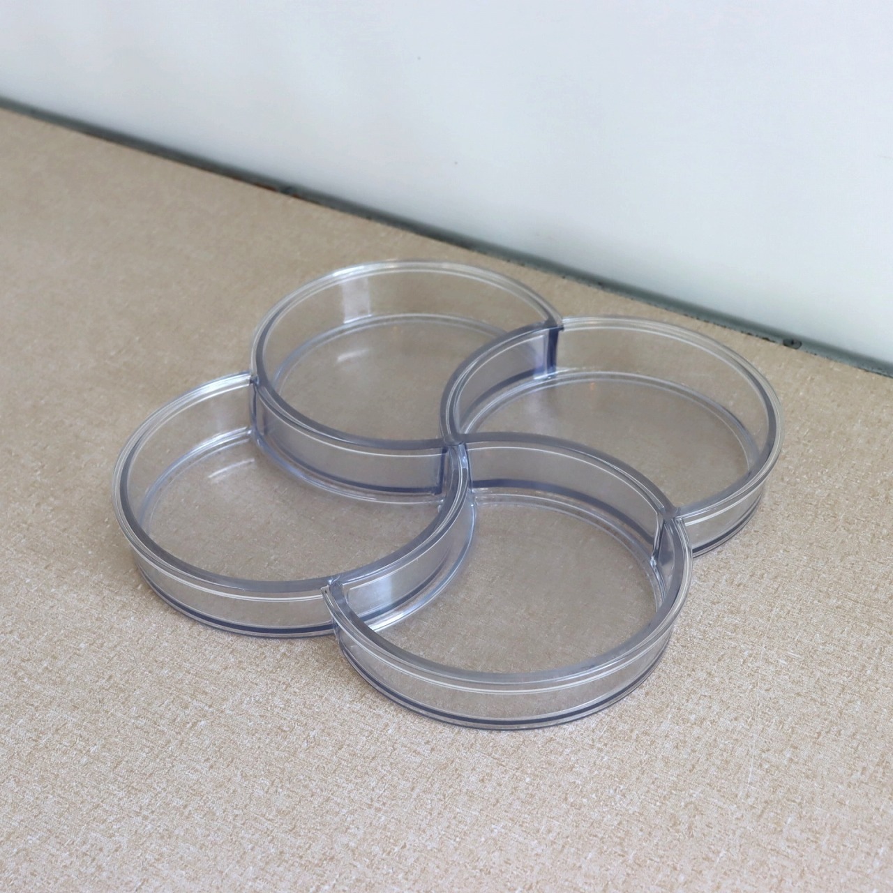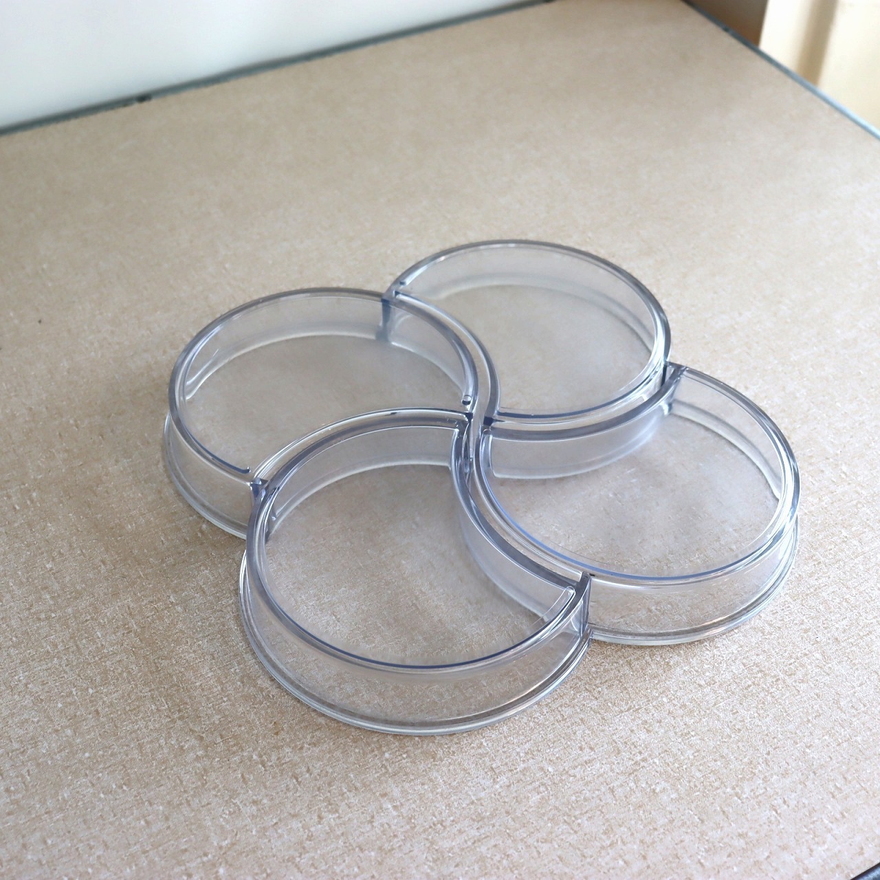 4つのポケットからなるプレスチックトレー。幾何学的の四葉のクローバーのような植物やお花もイメージされるデザインです。