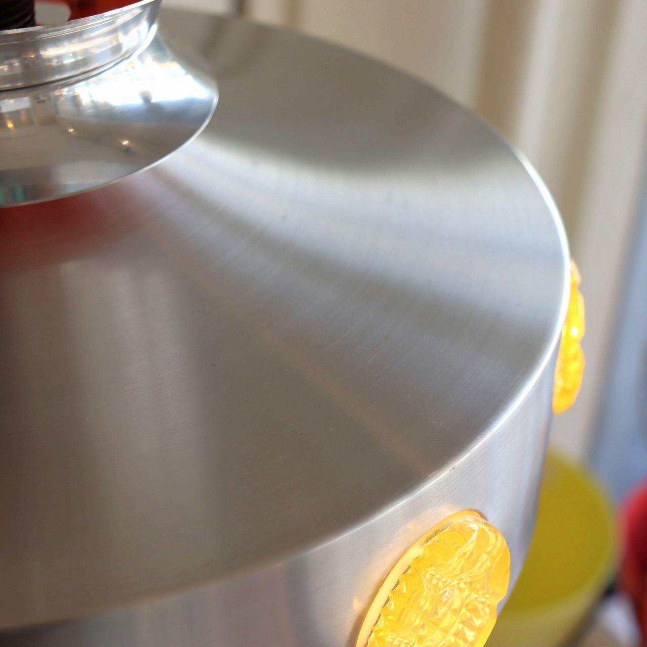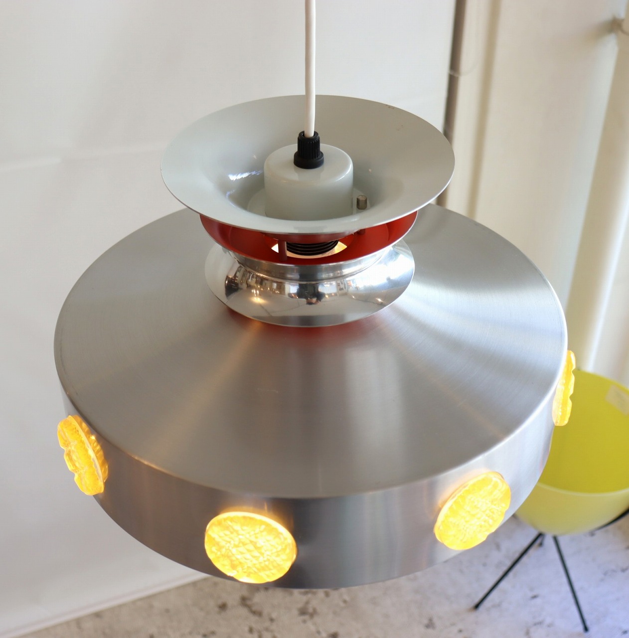 UFOのようなデザインとシルエットは可愛らしいポップな雰囲気。木製家具で大人しくなり過ぎた空間に華やかさとツヤのある質感を足してくれそうです。