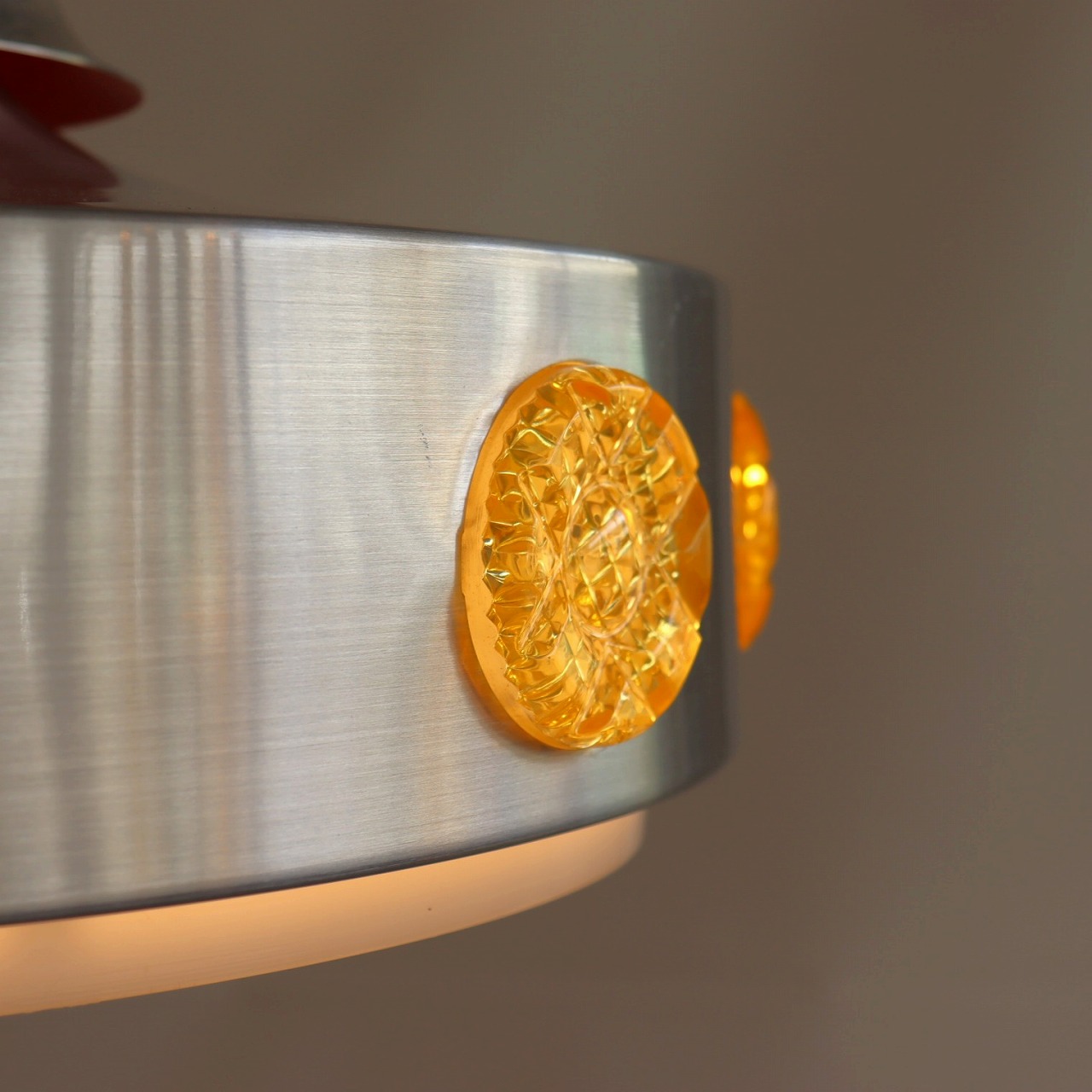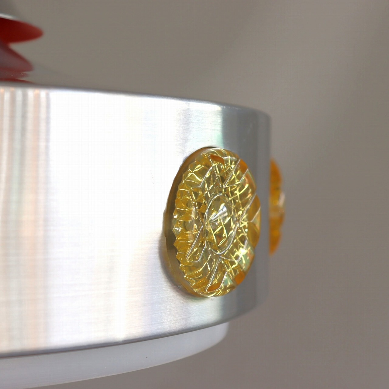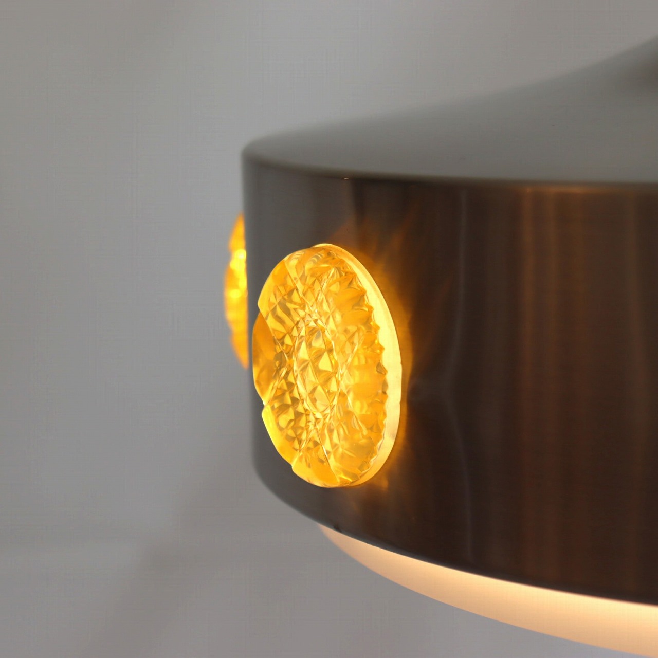 シェード側面の宝石のようなアクリル飾りが特徴的なランプ。ランプが点灯すると、飴色のアクリルがオレンジ色に光って宝石のようにキラキラと輝きます。