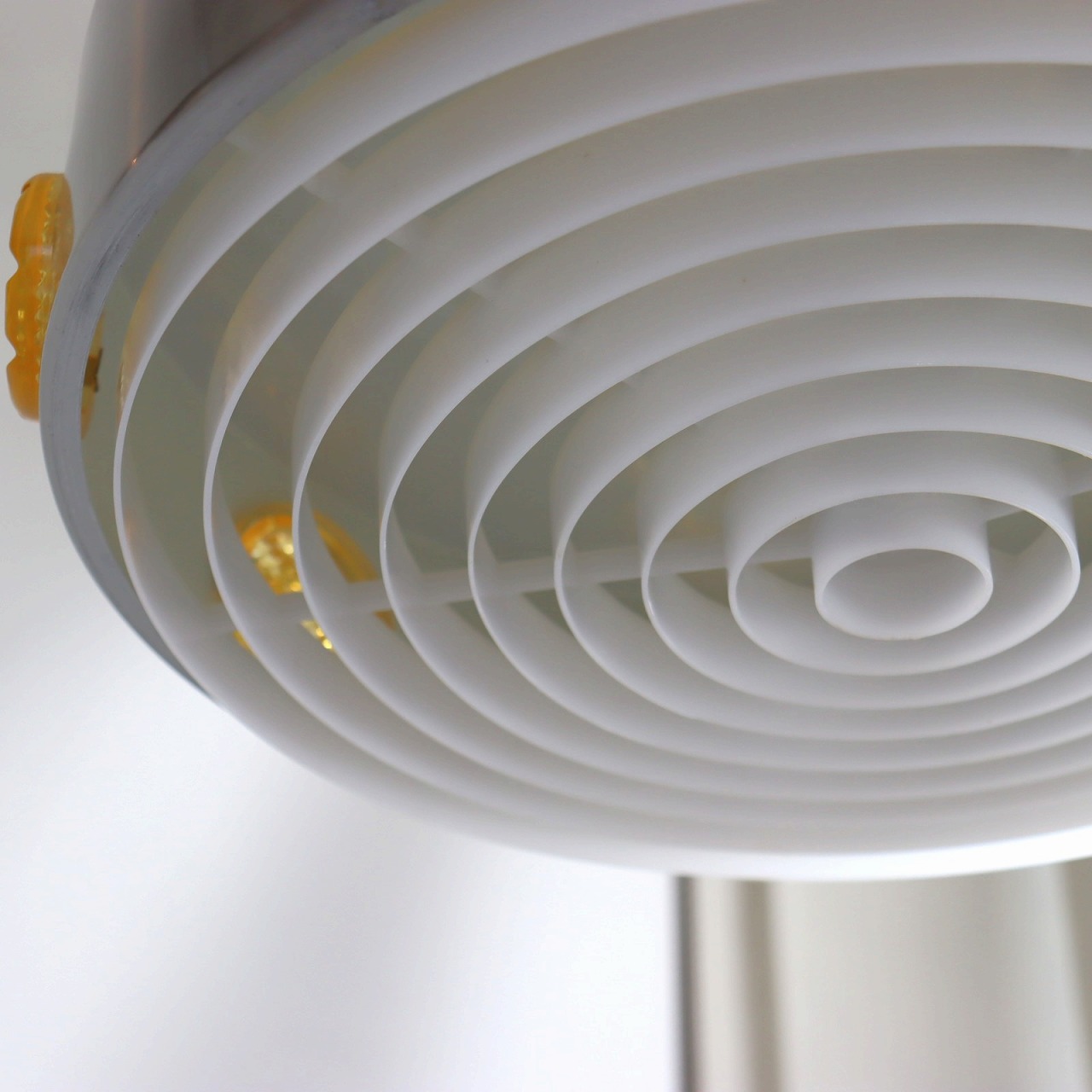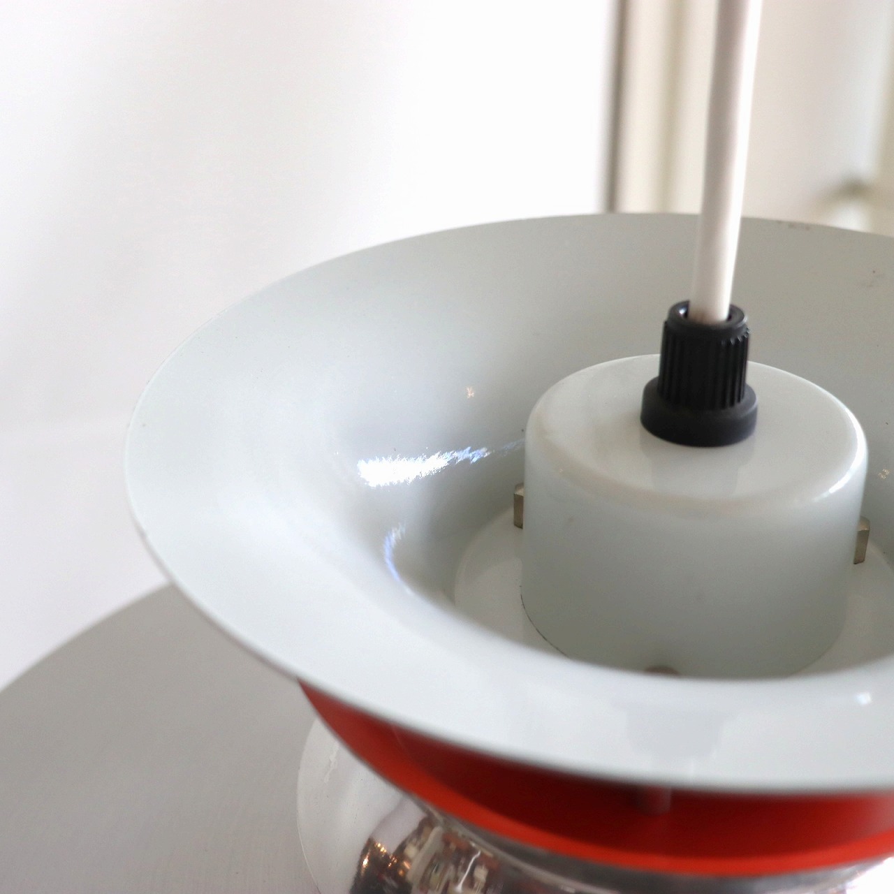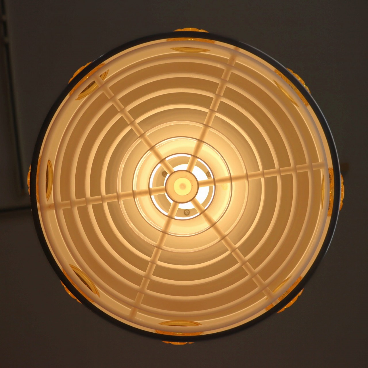 ランプ下にはプラスチック樹脂製のルーバーがシェードの下面についていて、光源が直接目に入りにくいデザインになっています。また上部のくびれ部分は内側のオレンジ色が隙間から楽しめるようになっています。