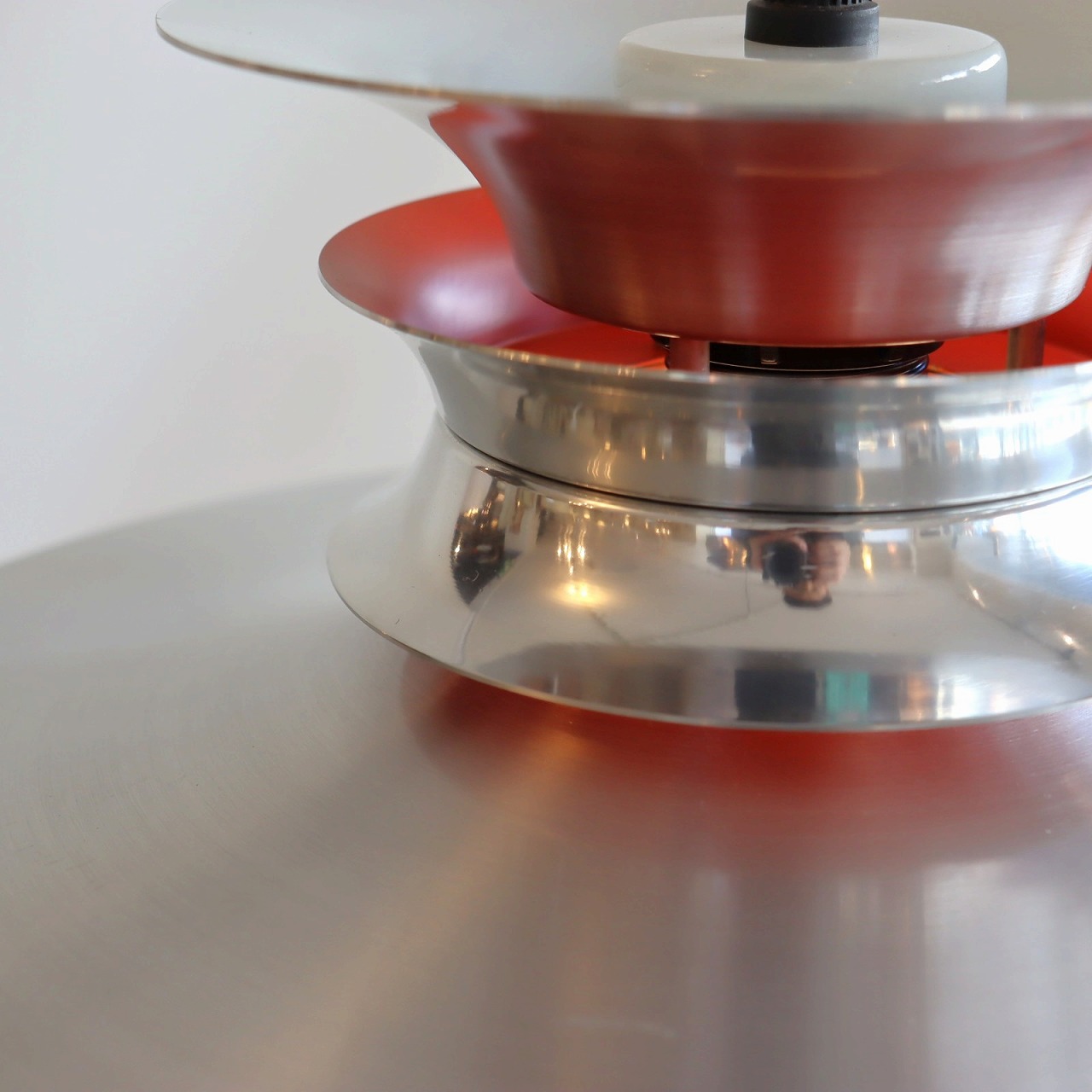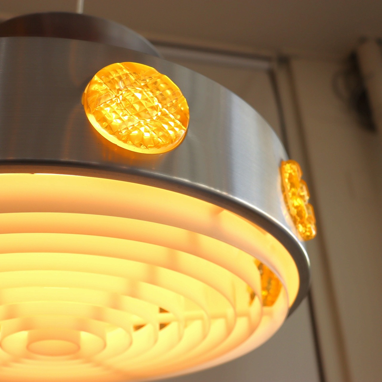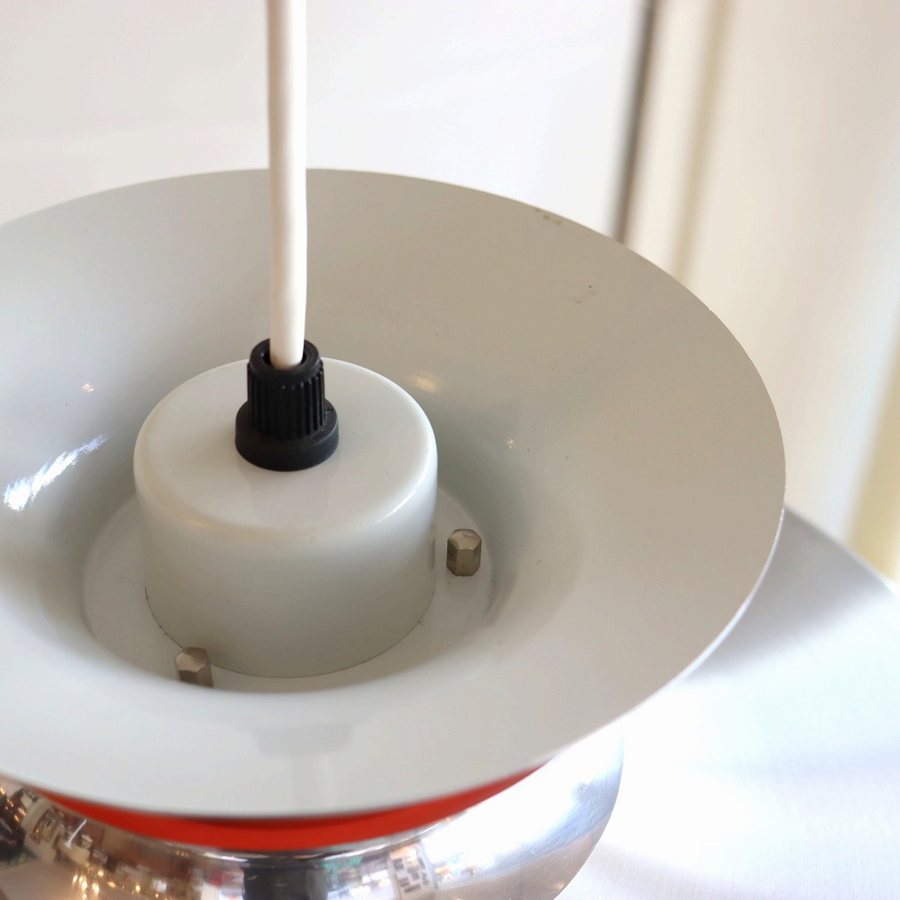 ランプ下にはプラスチック樹脂製のルーバーがシェードの下面についていて、光源が直接目に入りにくいデザインになっています。また上部のくびれ部分は内側のオレンジ色が隙間から楽しめるようになっています。