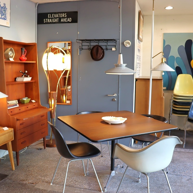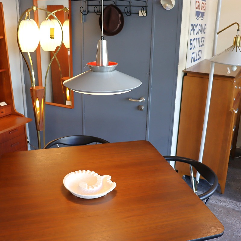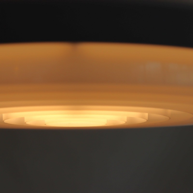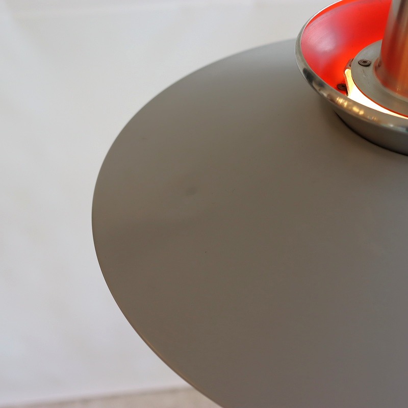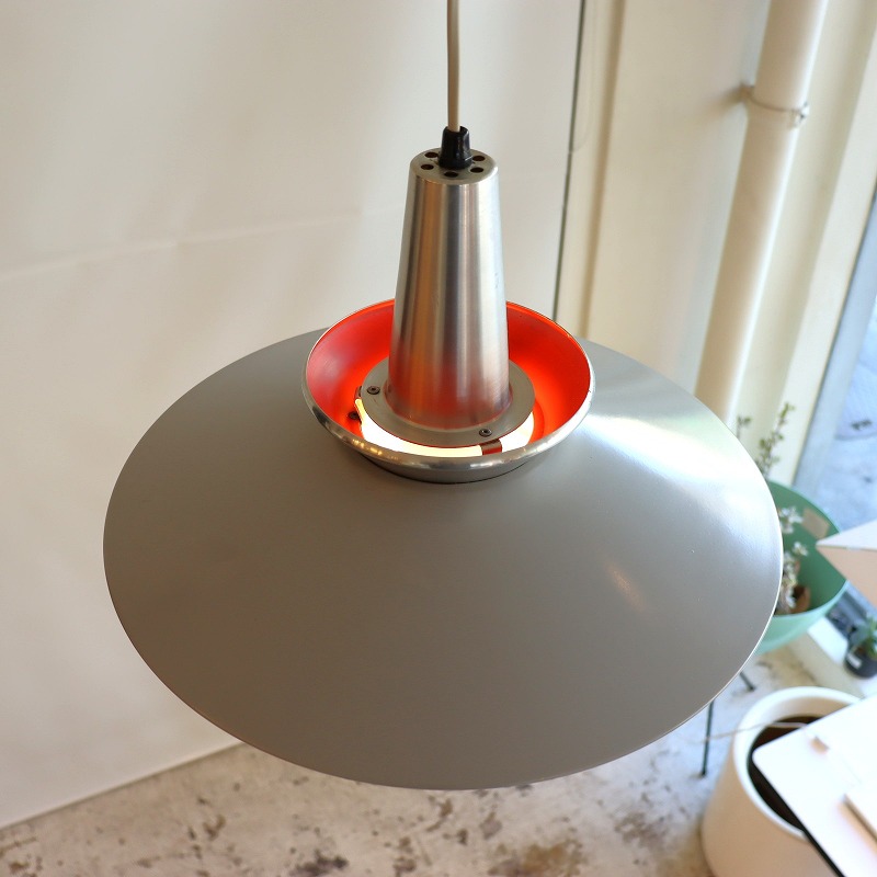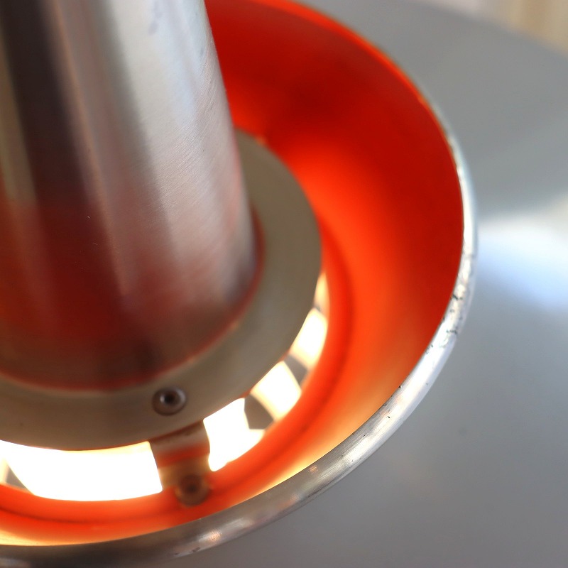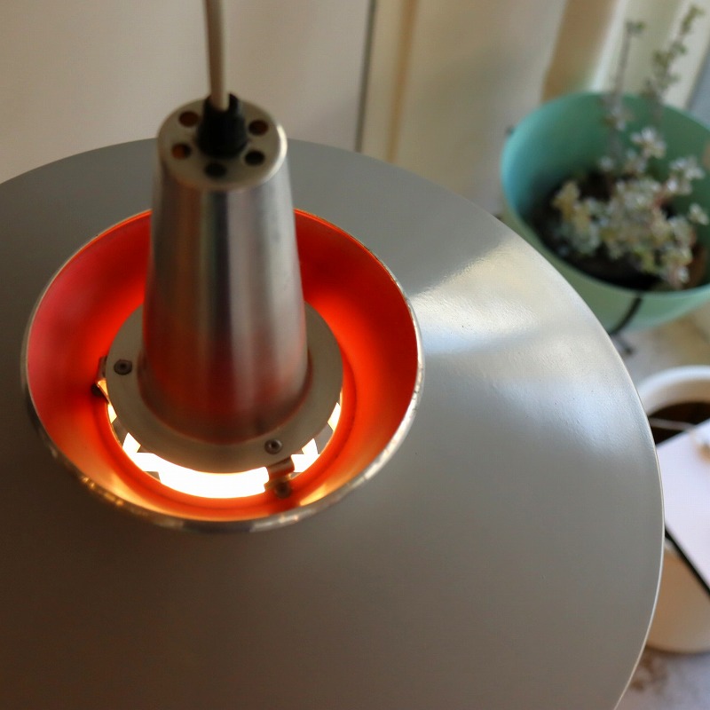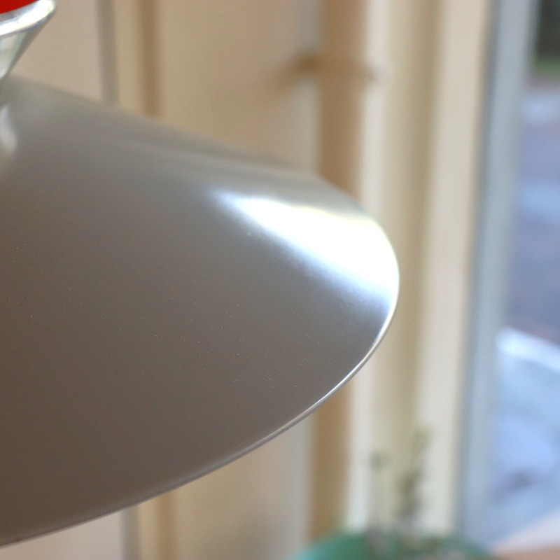 シェードの内側はレッドのペイントがなされており、電球の灯りをうけて少し暖かな光りが漏れ、上部のスチールシェードに反射する仕組みです。