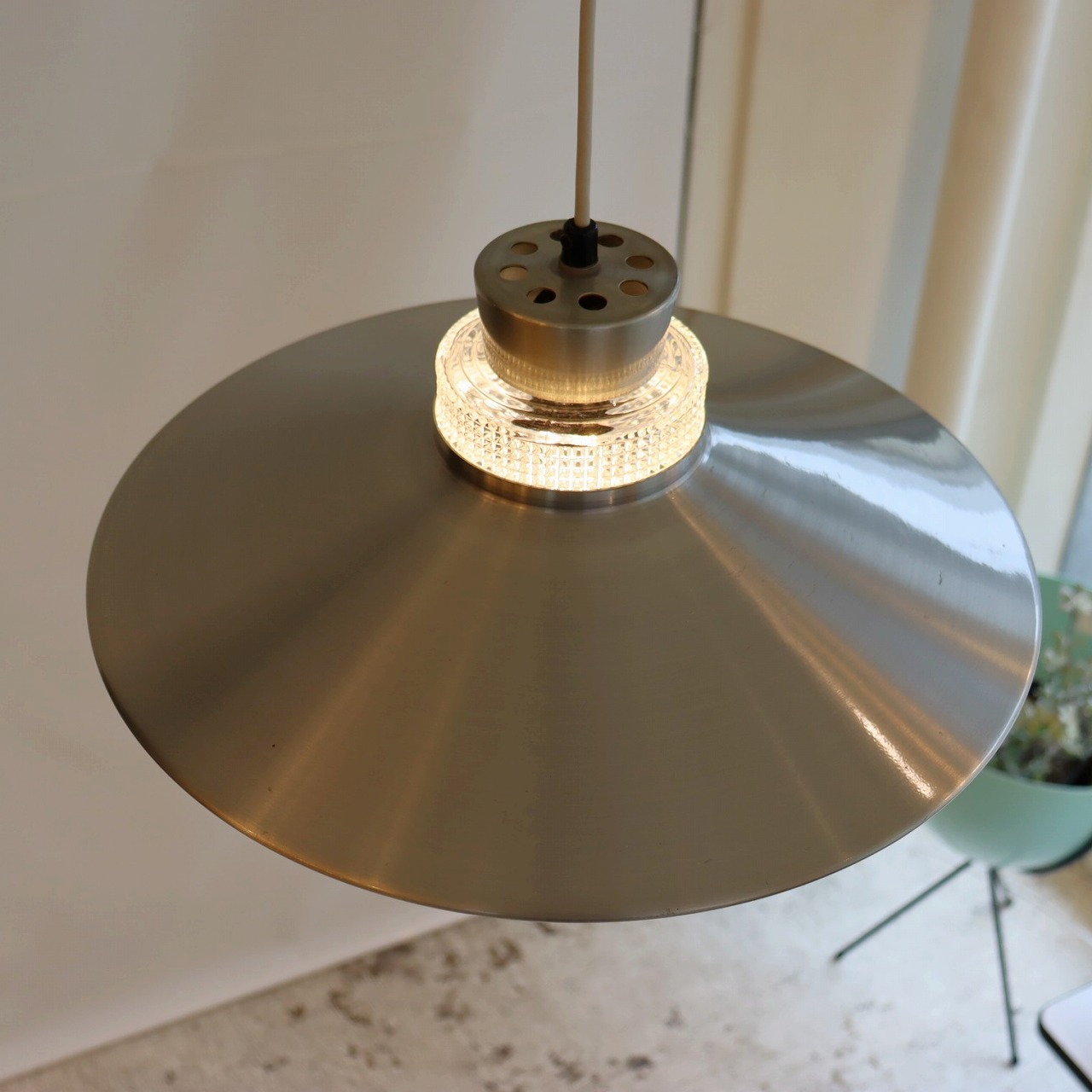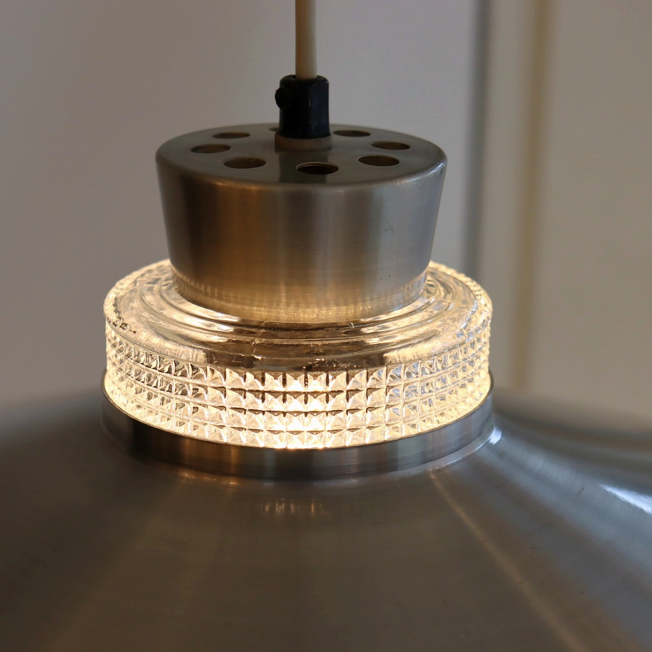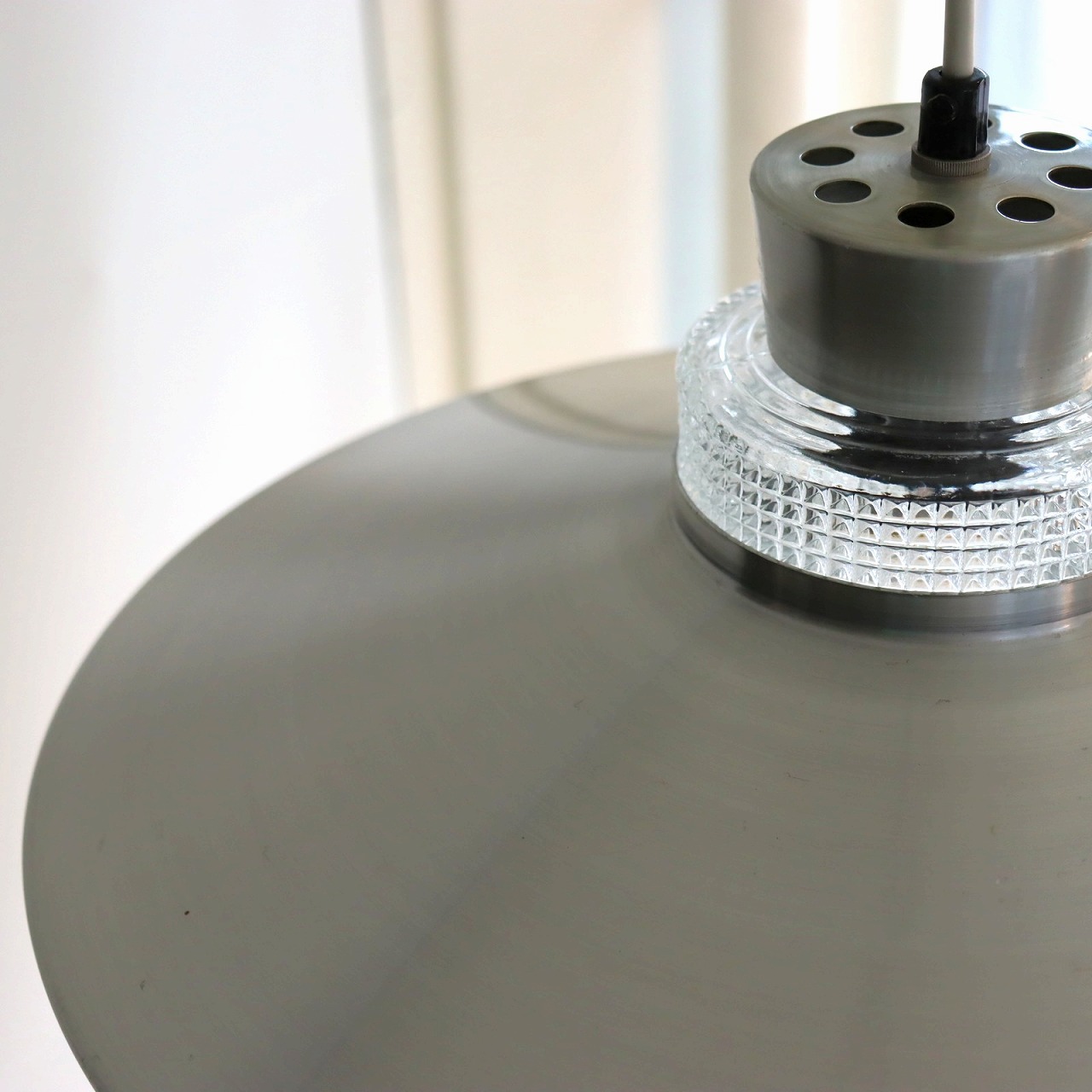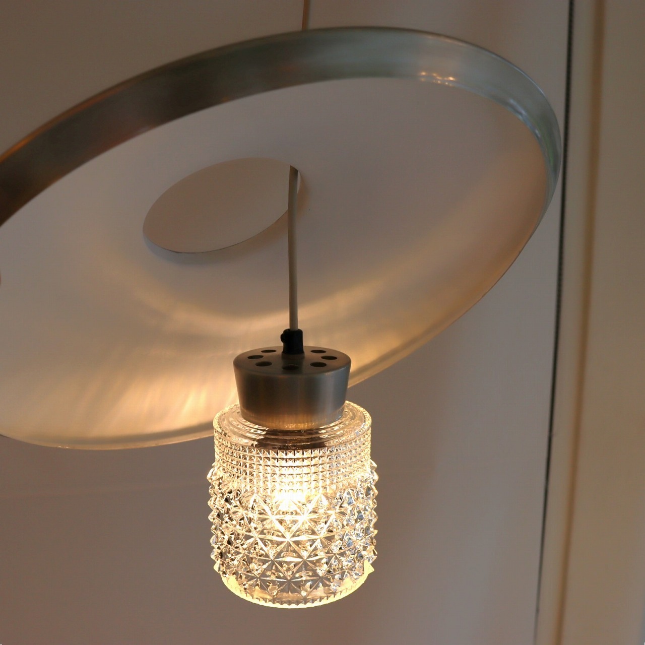 ガラスシェードの上に大きく広がったアルミシェードが引っ掛けられたつくりです。アルミシェードの上からもガラスが抜けていて、上部にも光が抜けるデザインです。材質の異なった艶感が上手に組み合わさっていますね。