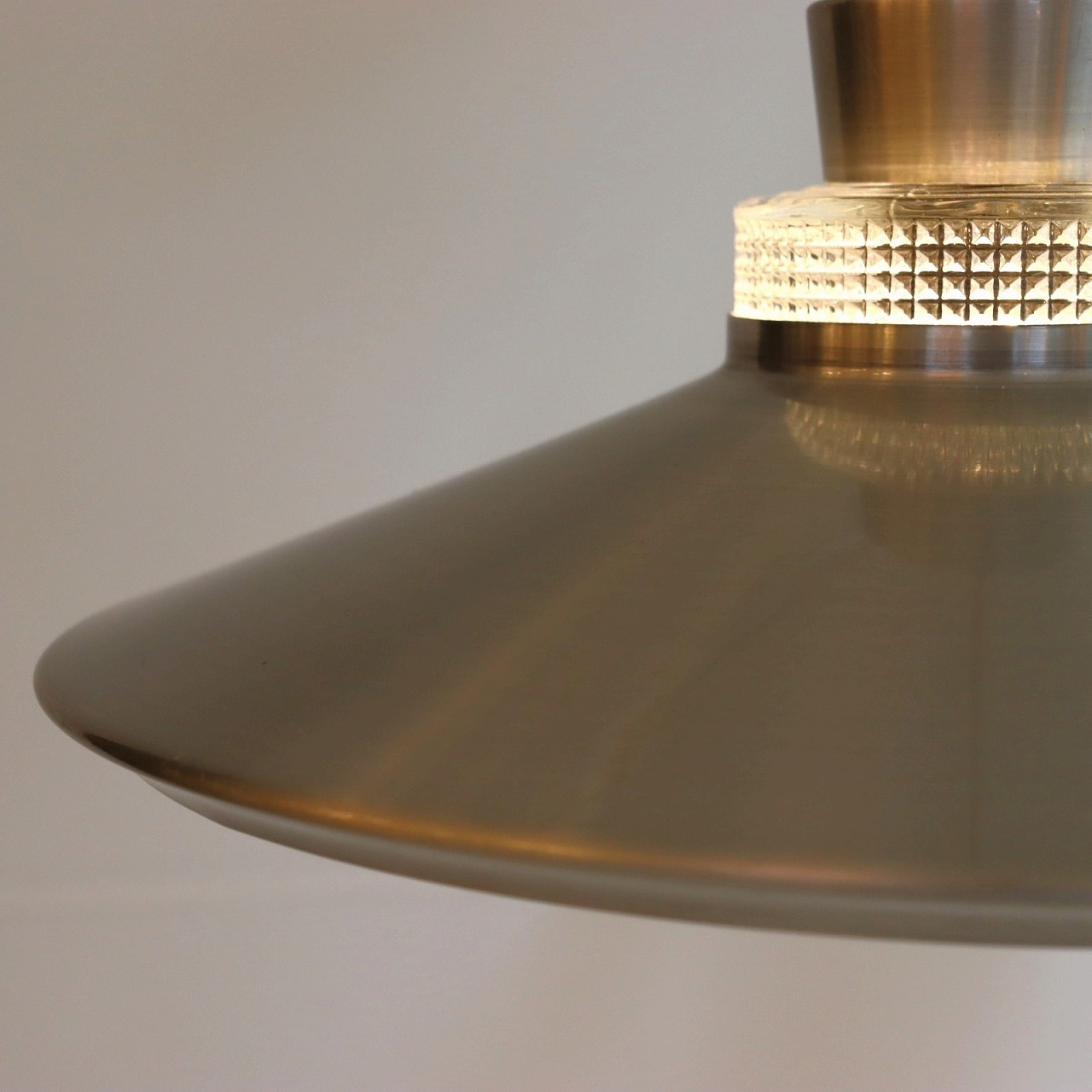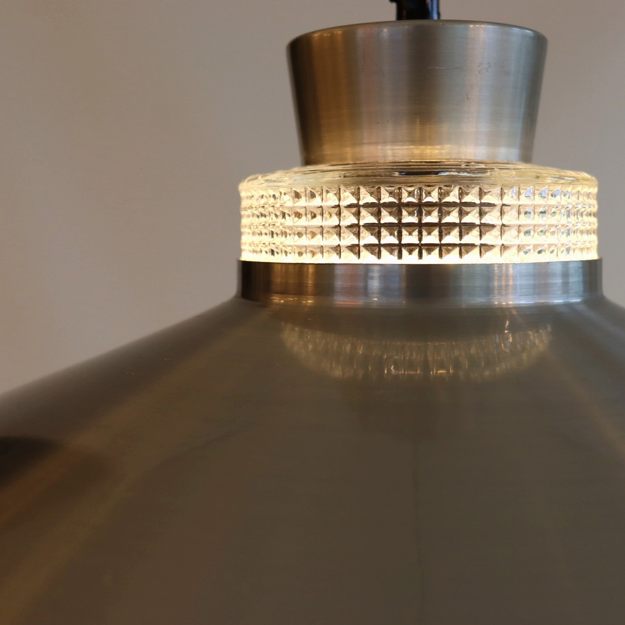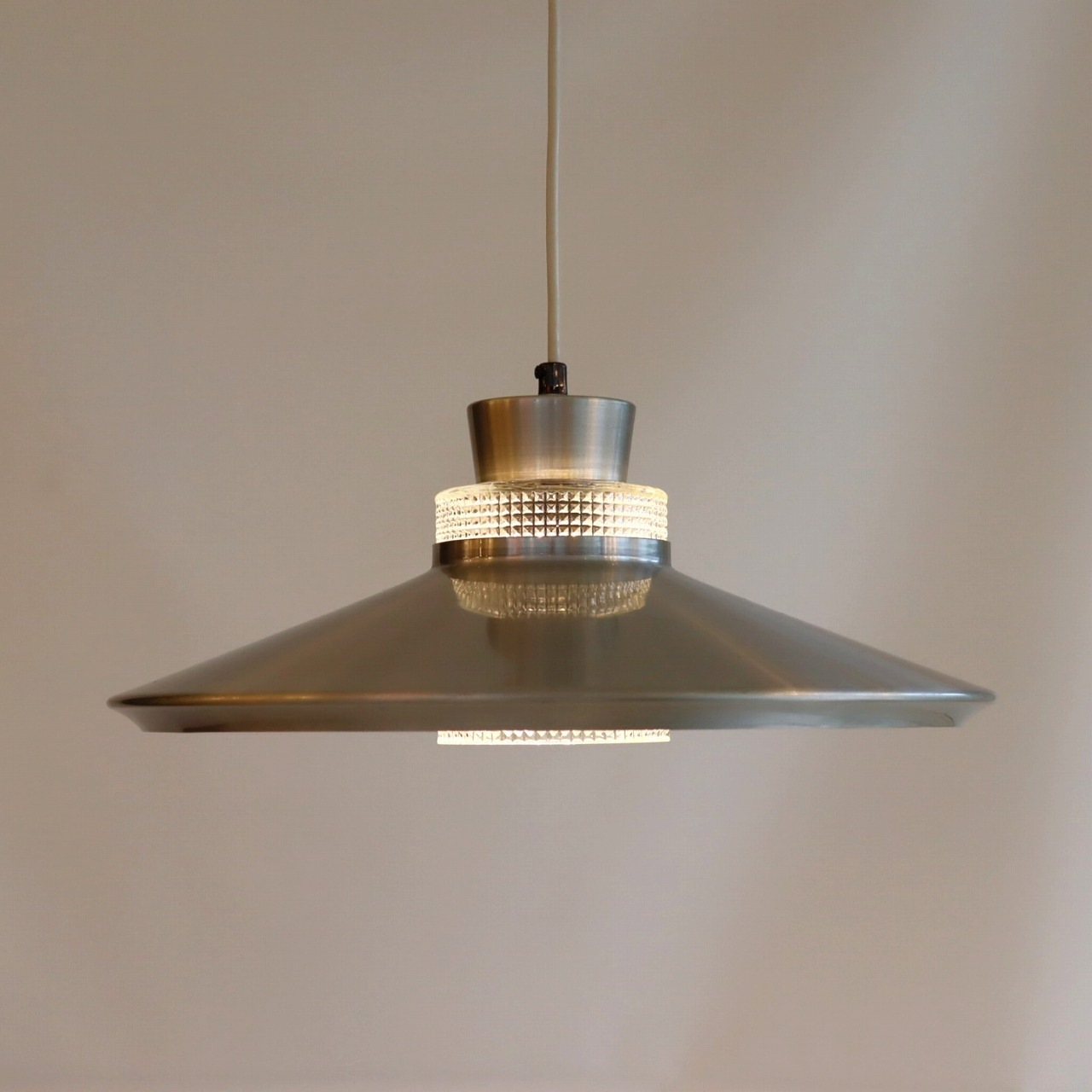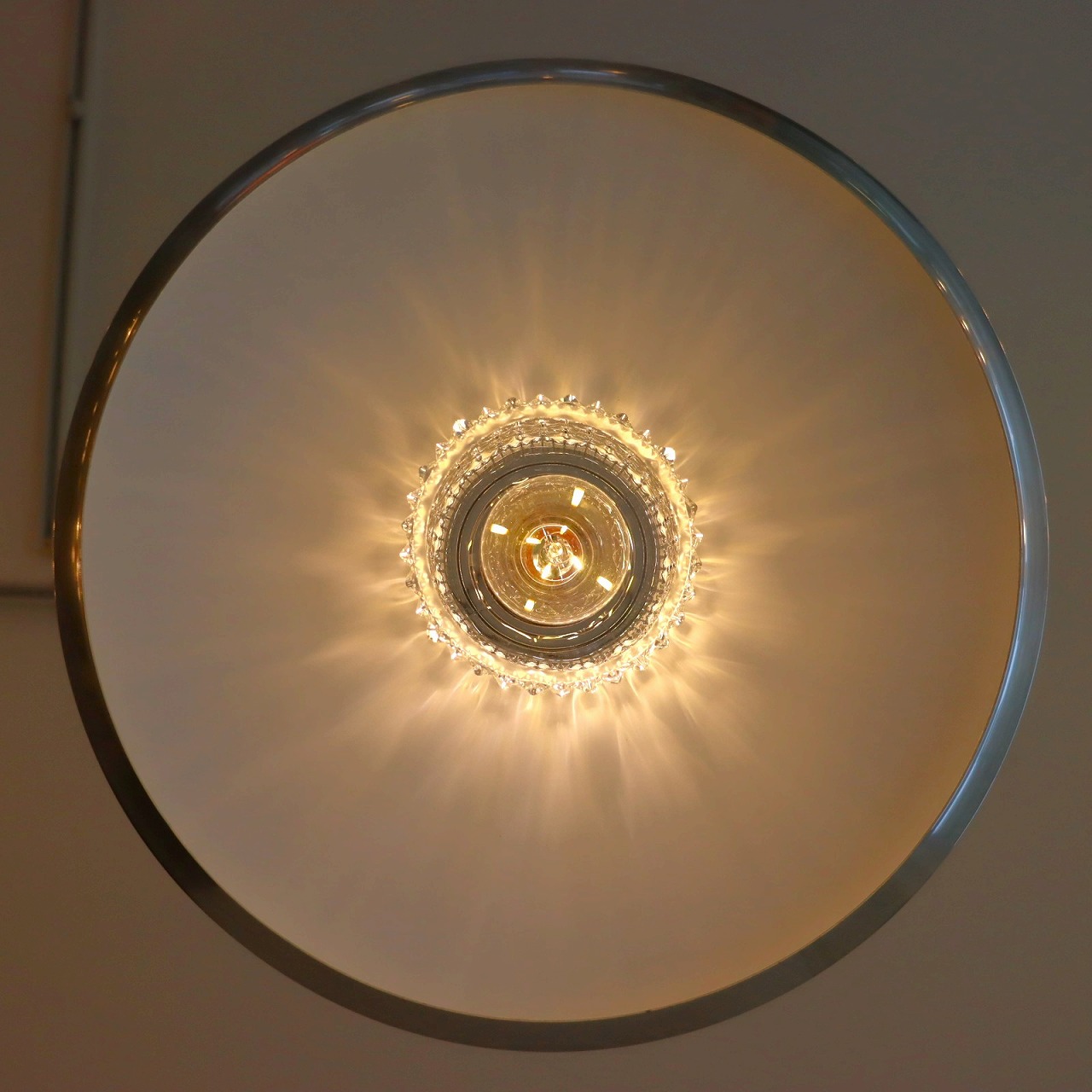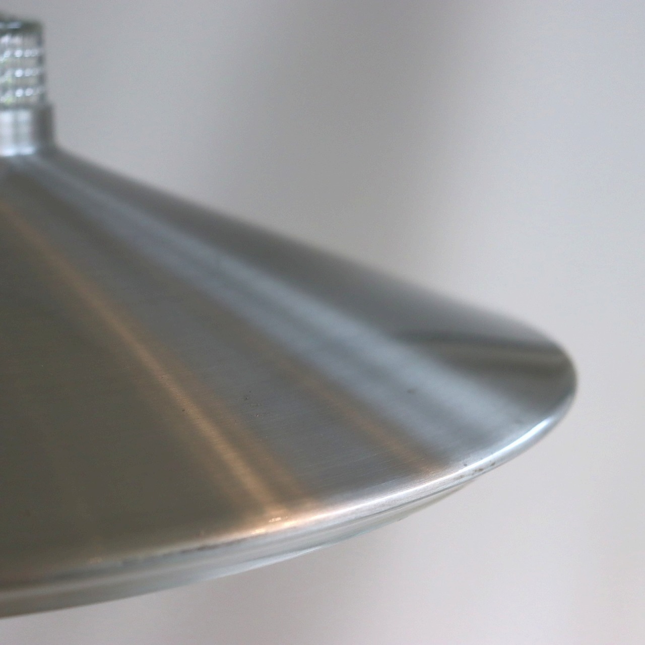 ガラスシェードの上に大きく広がったアルミシェードが引っ掛けられたつくりです。アルミシェードの上からもガラスが抜けていて、上部にも光が抜けるデザインです。材質の異なった艶感が上手に組み合わさっていますね。