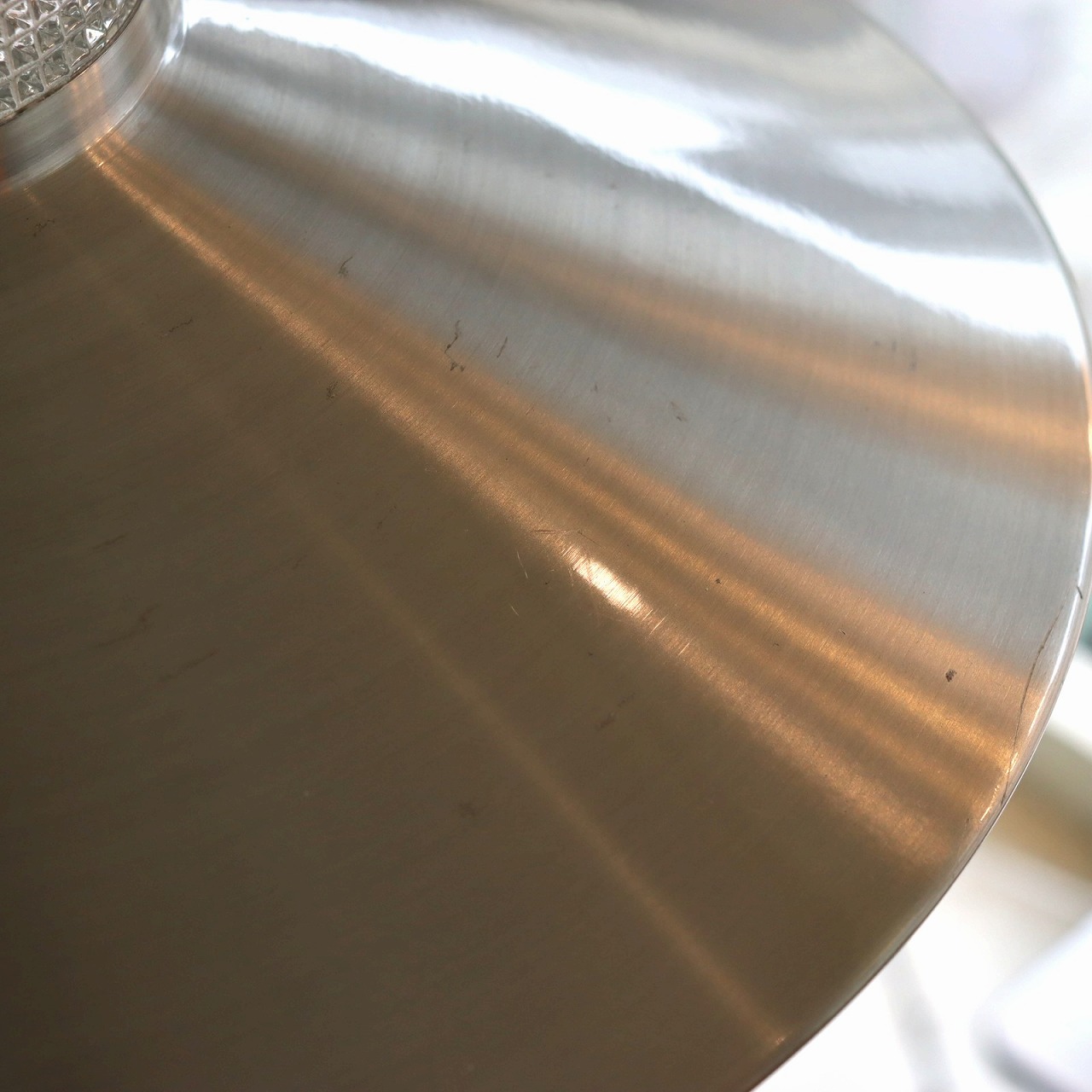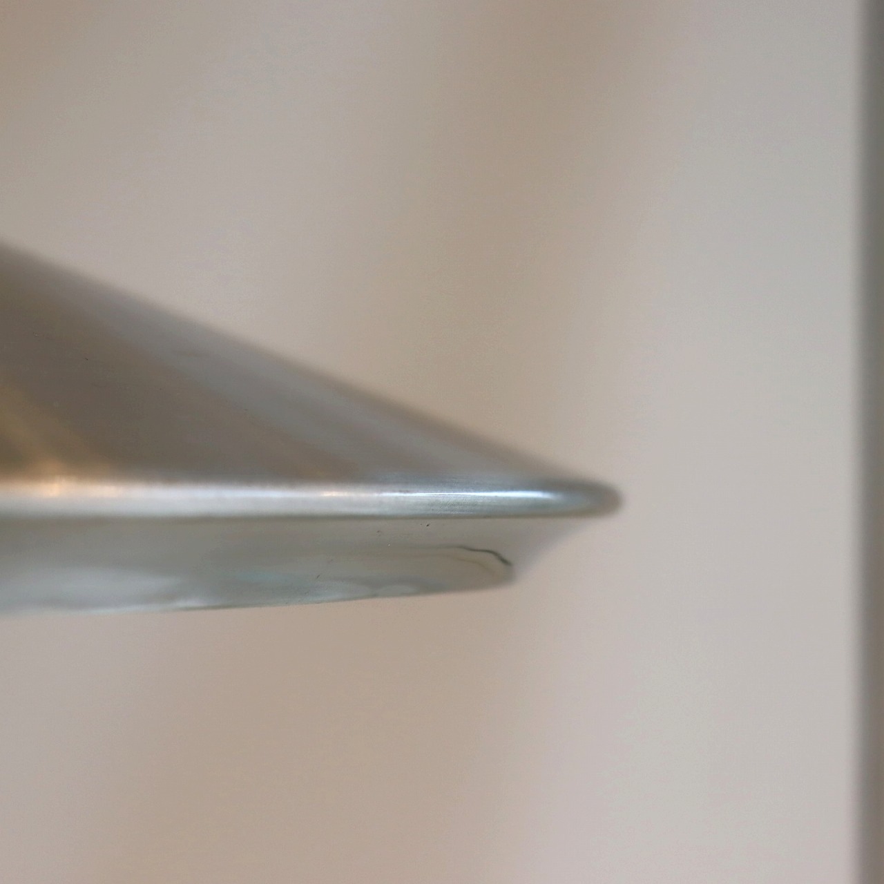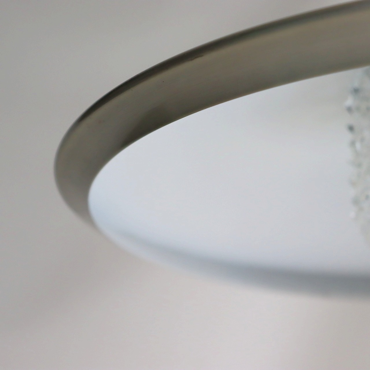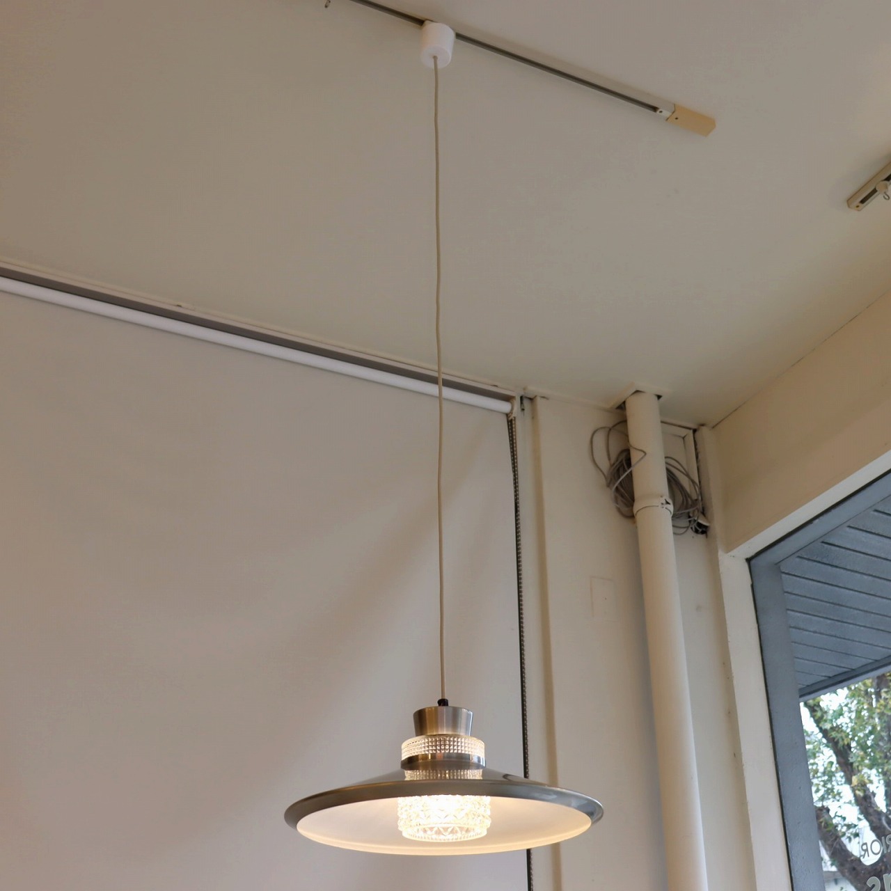 ガラスシェードの上に大きく広がったアルミシェードが引っ掛けられたつくりです。アルミシェードの上からもガラスが抜けていて、上部にも光が抜けるデザインです。材質の異なった艶感が上手に組み合わさっていますね。