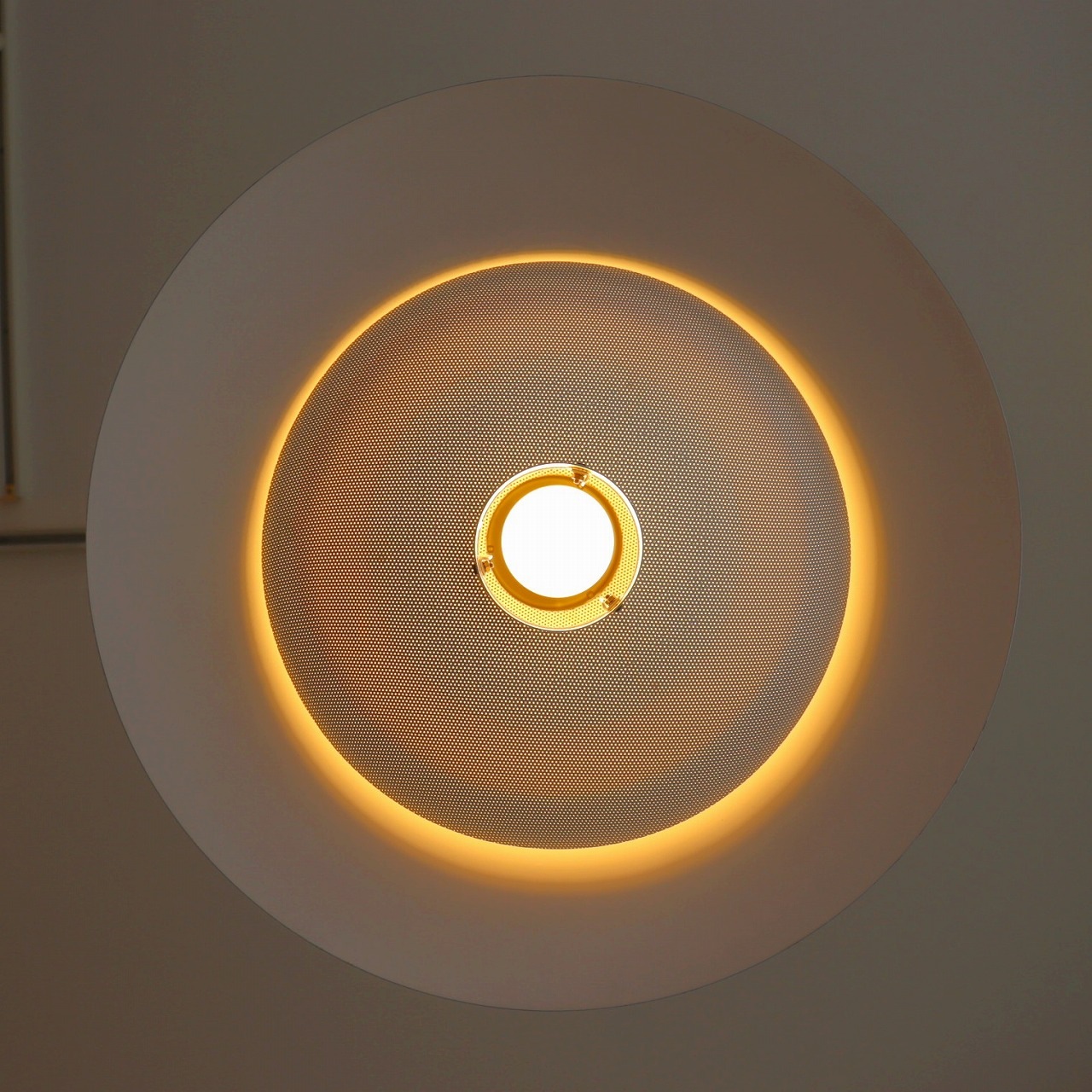 傘のようなシェードとパンチングが施されたシェードカバーが組み合わせ。ランプ下面のパンチングのシェードカバーは、点灯すると電球の灯りで光が満たされます。中心部は開口されていて、明るすぎない演出性の高いランプです。