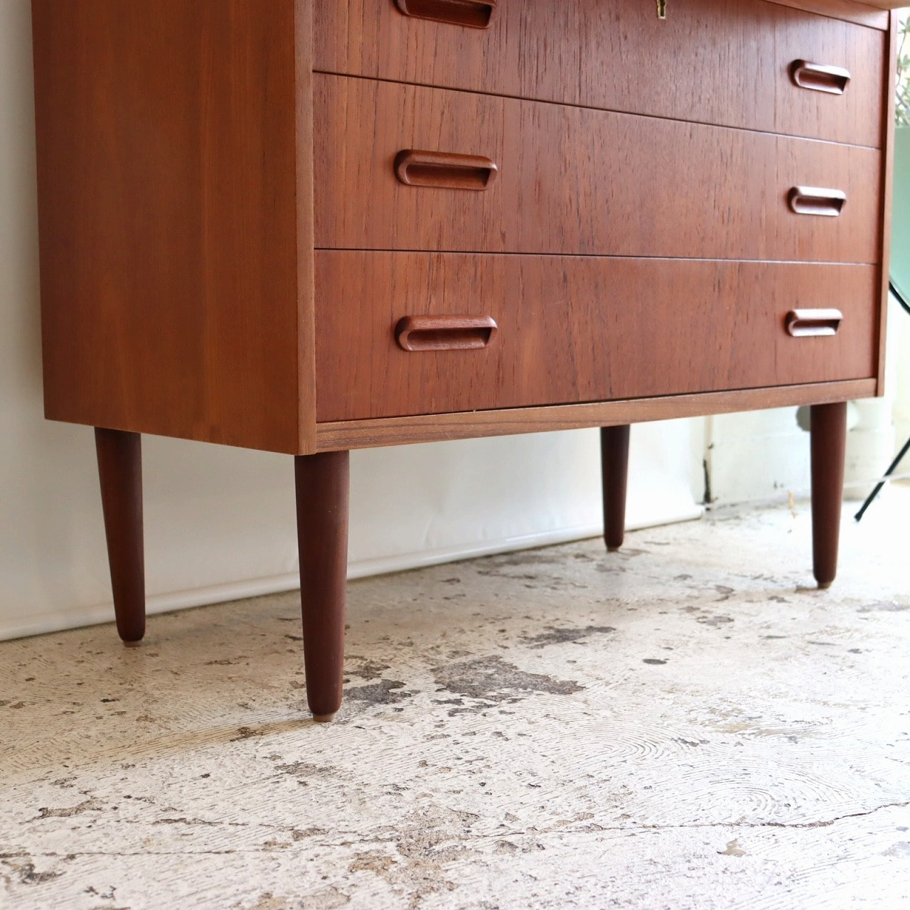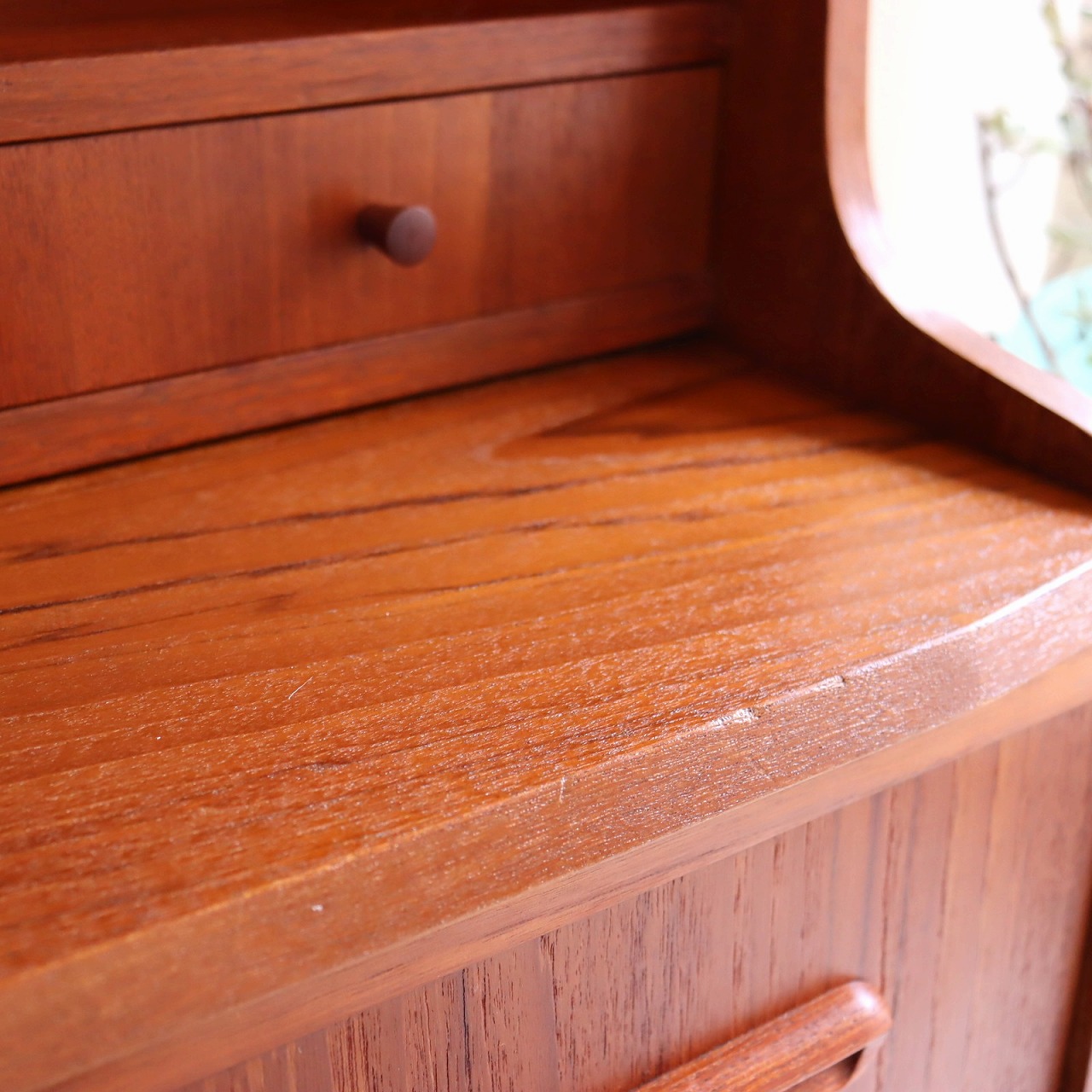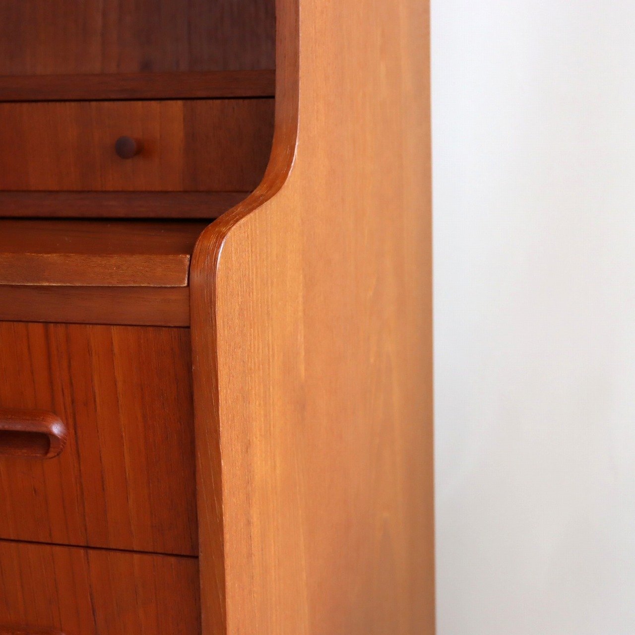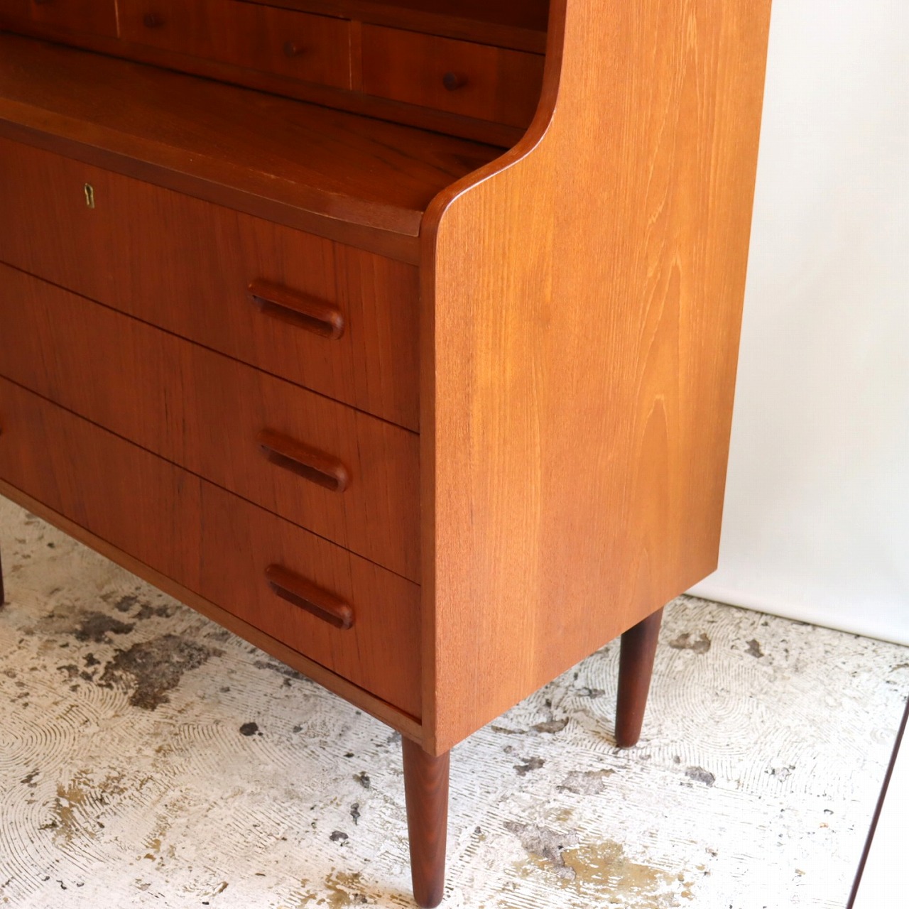 チーク材の赤みのあるブラウンが印象的な暖かみのある一台。アールのついた側板や丸みのある脚がかわいらしいですね。鍵穴や小さなつまみのような取手、丸みのある引手がアクセントを加えてくれています。