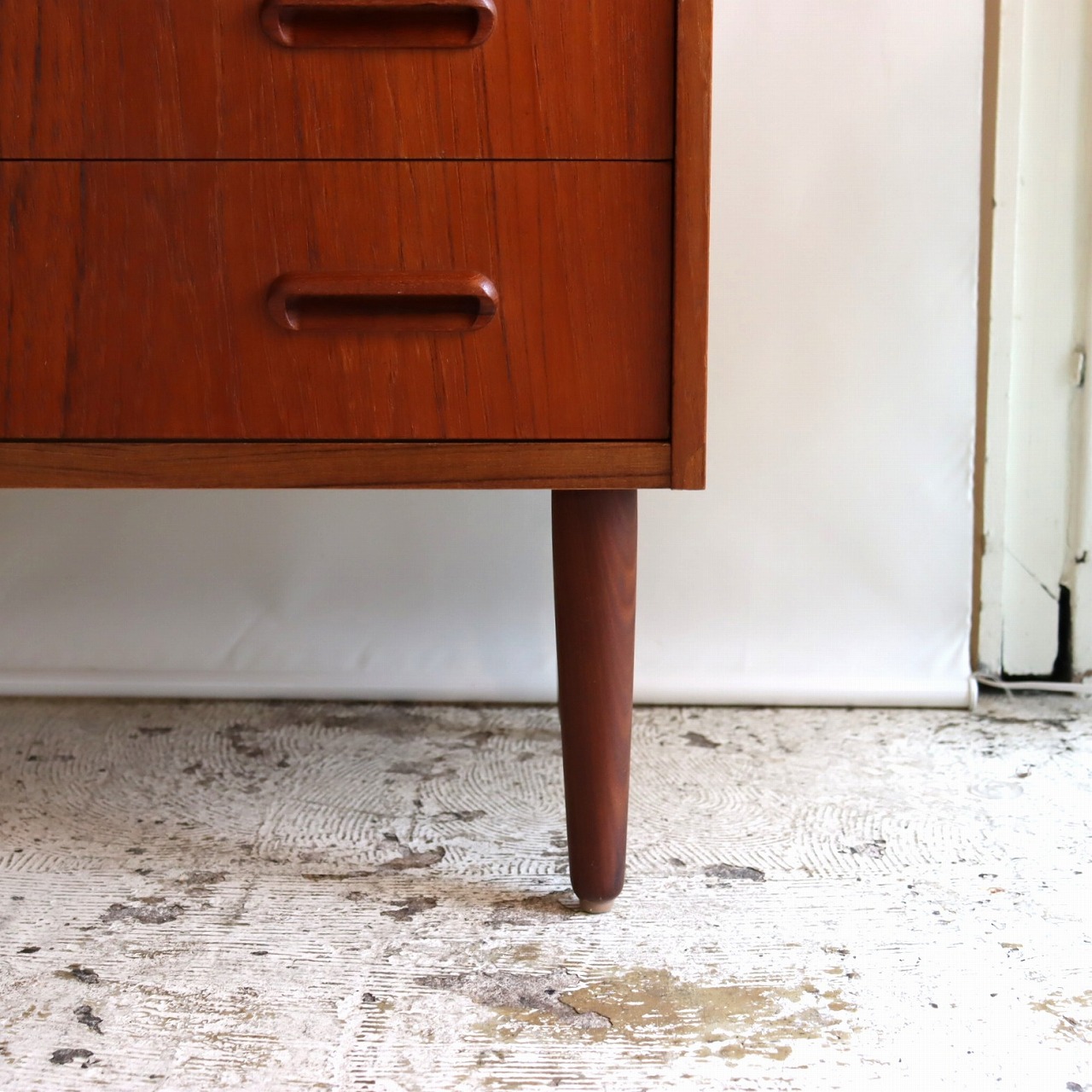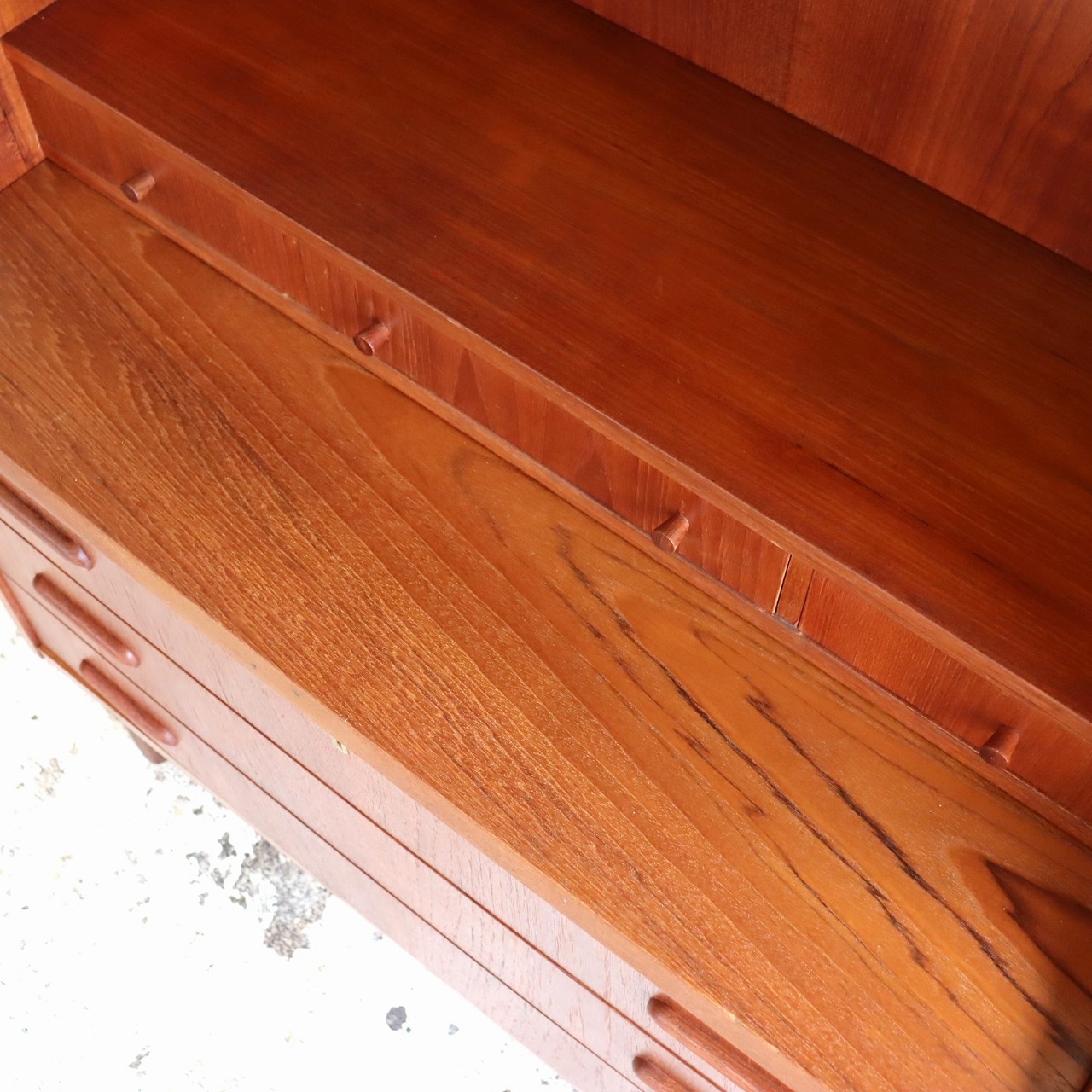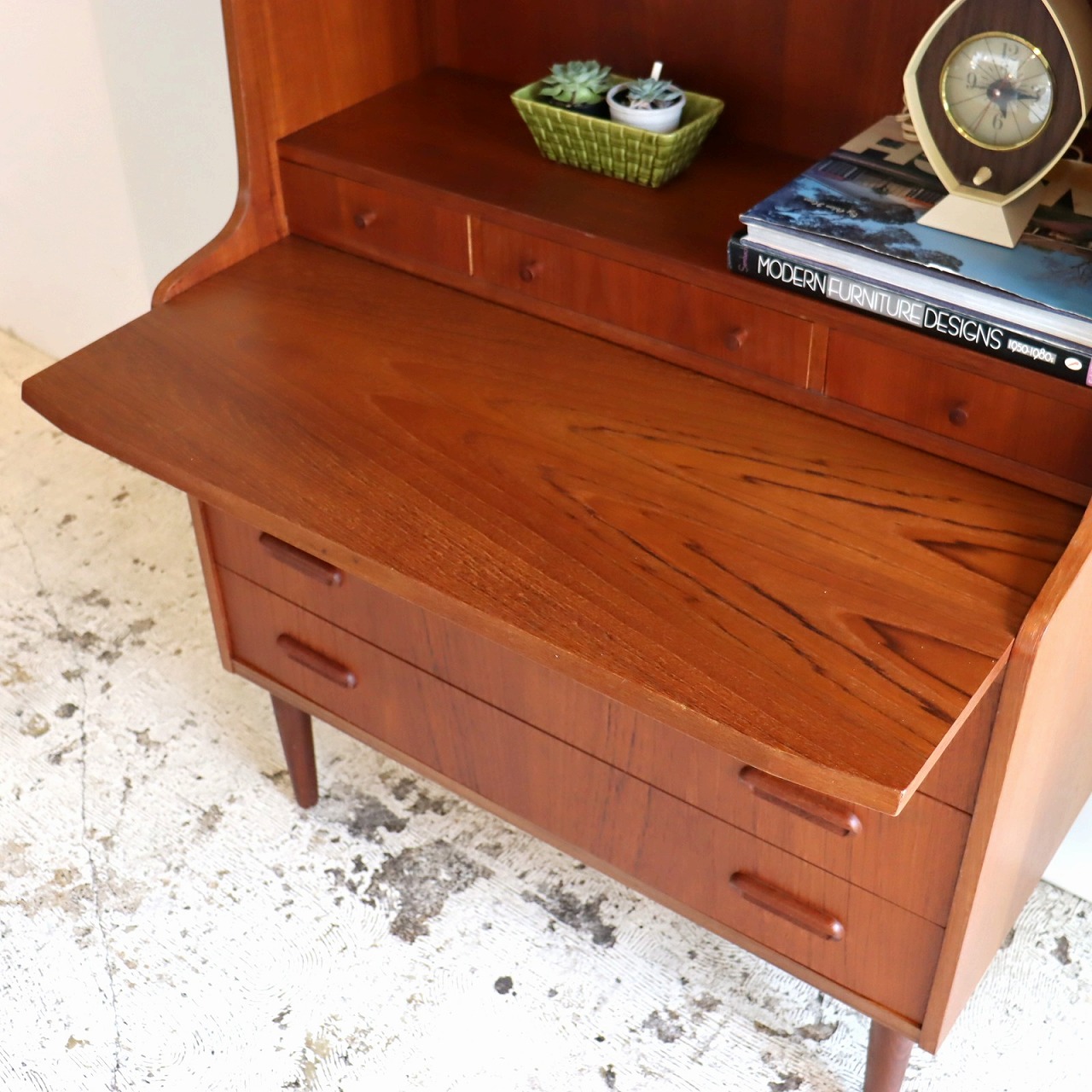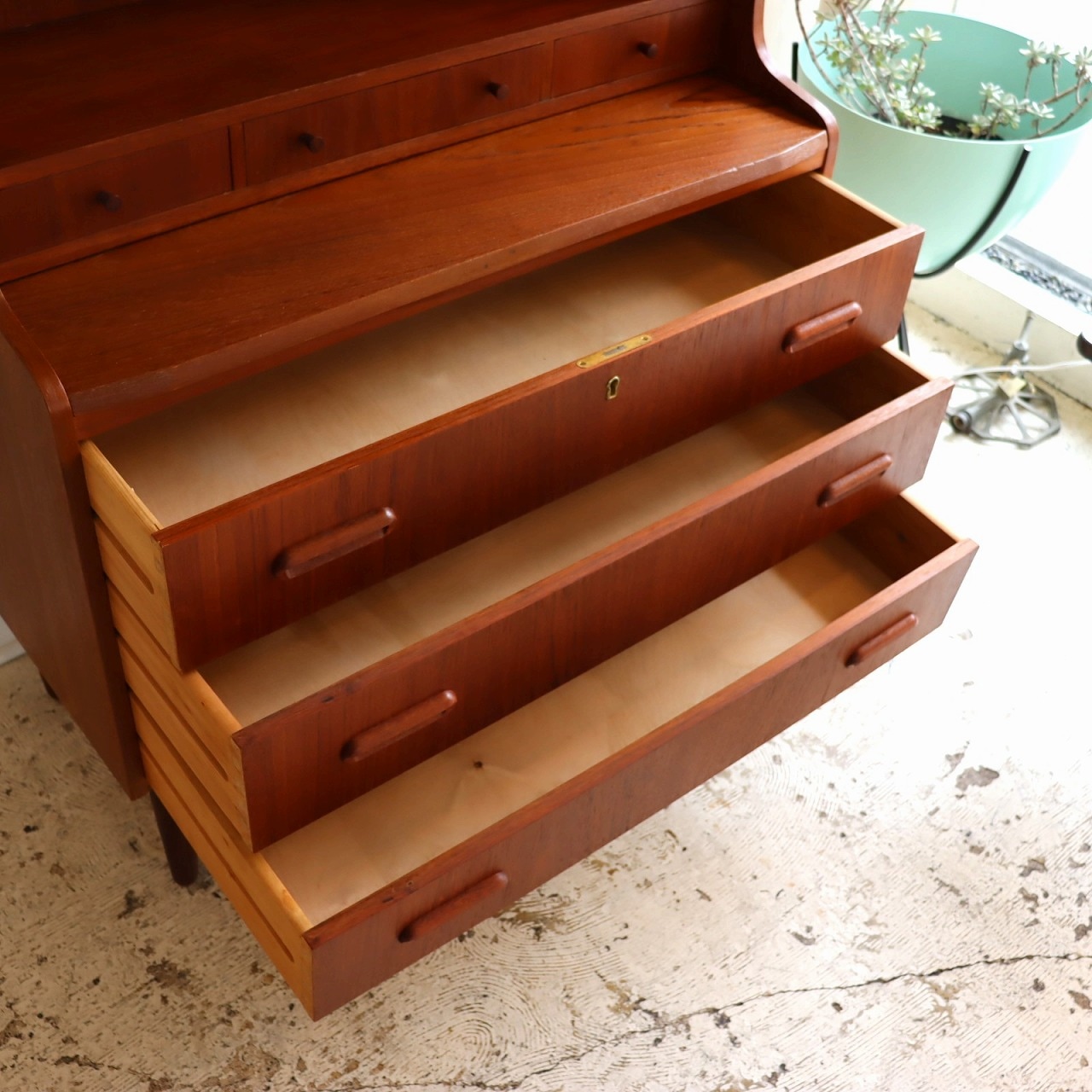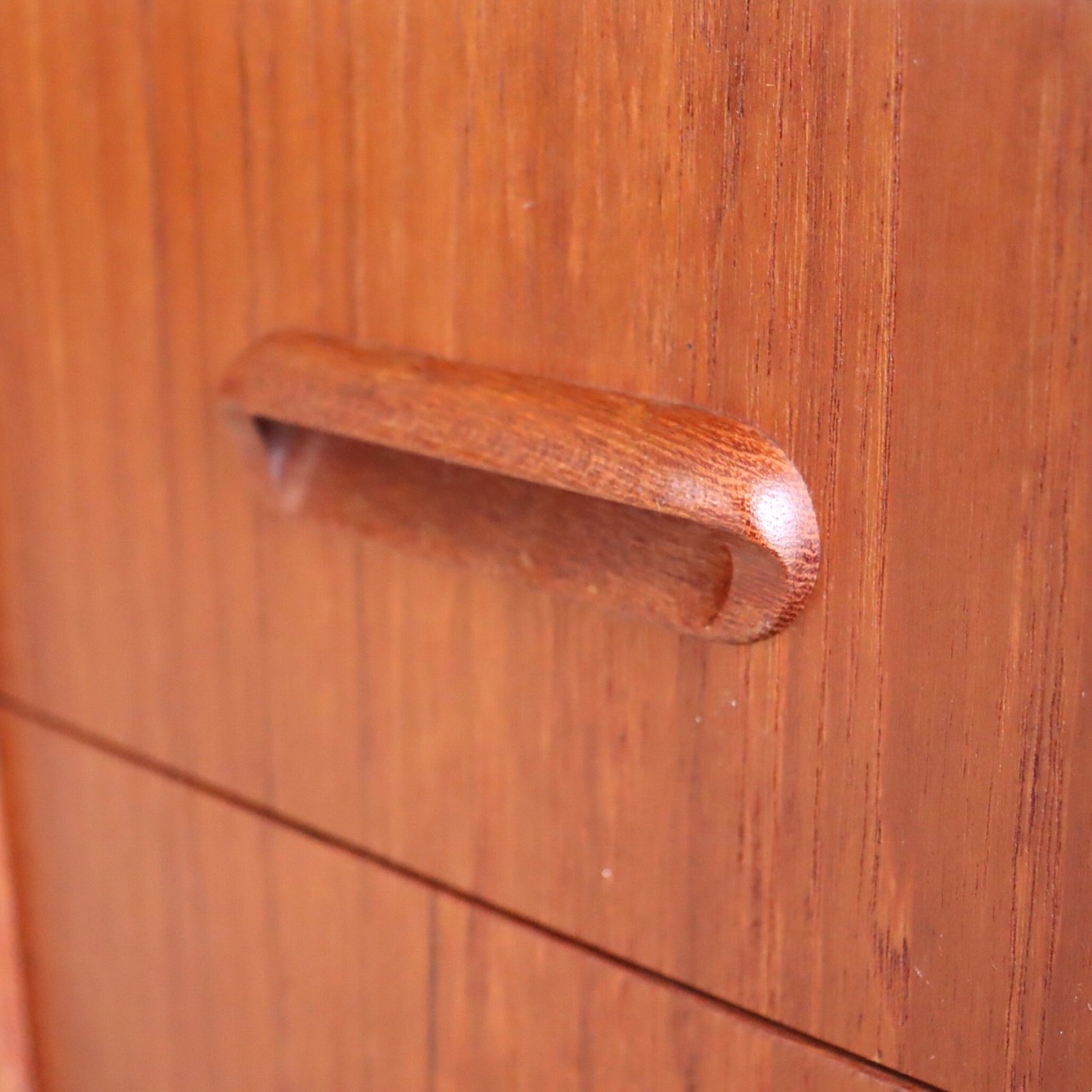 チーク材の赤みのあるブラウンが印象的な暖かみのある一台。アールのついた側板や丸みのある脚がかわいらしいですね。鍵穴や小さなつまみのような取手、丸みのある引手がアクセントを加えてくれています。